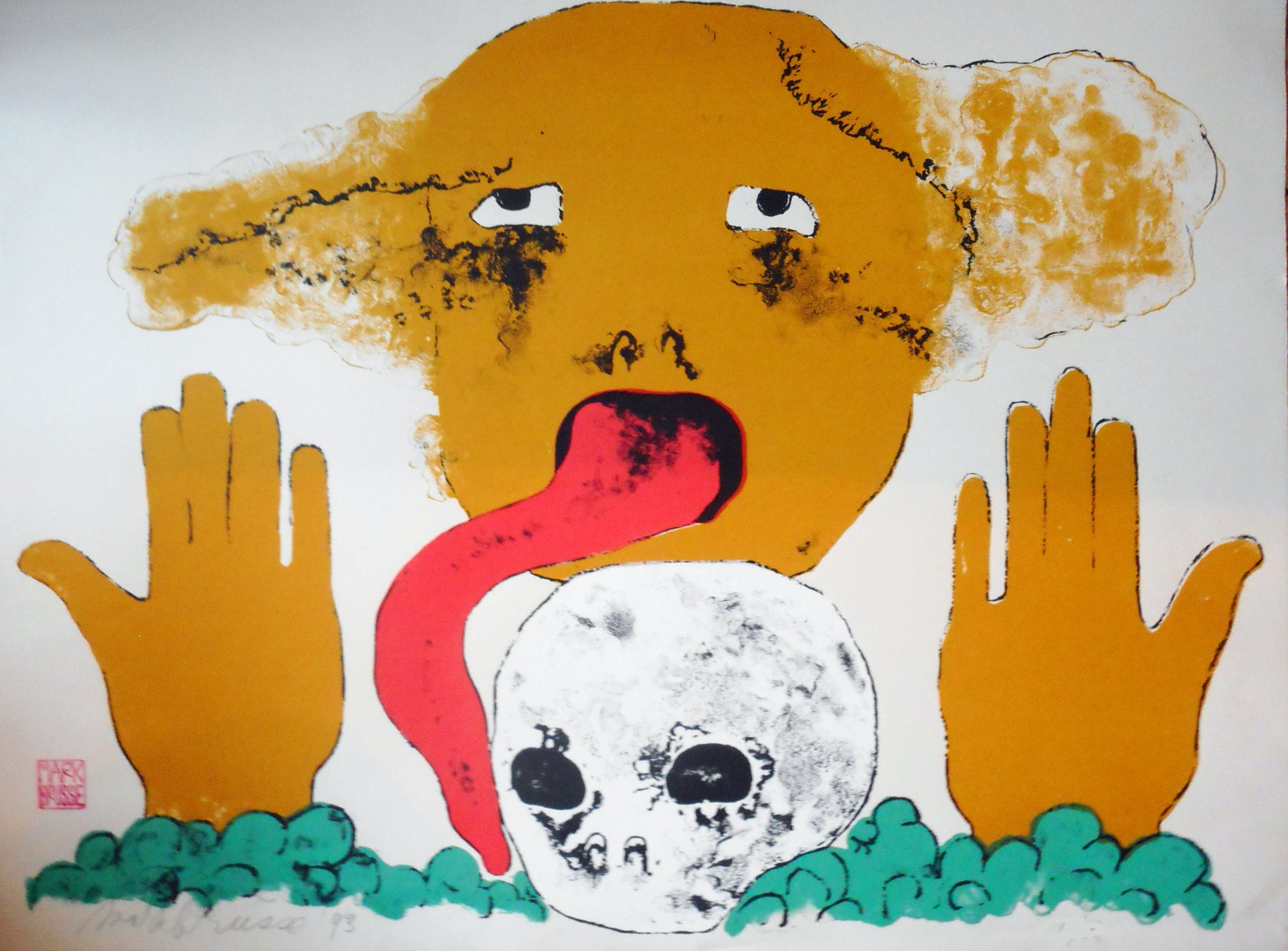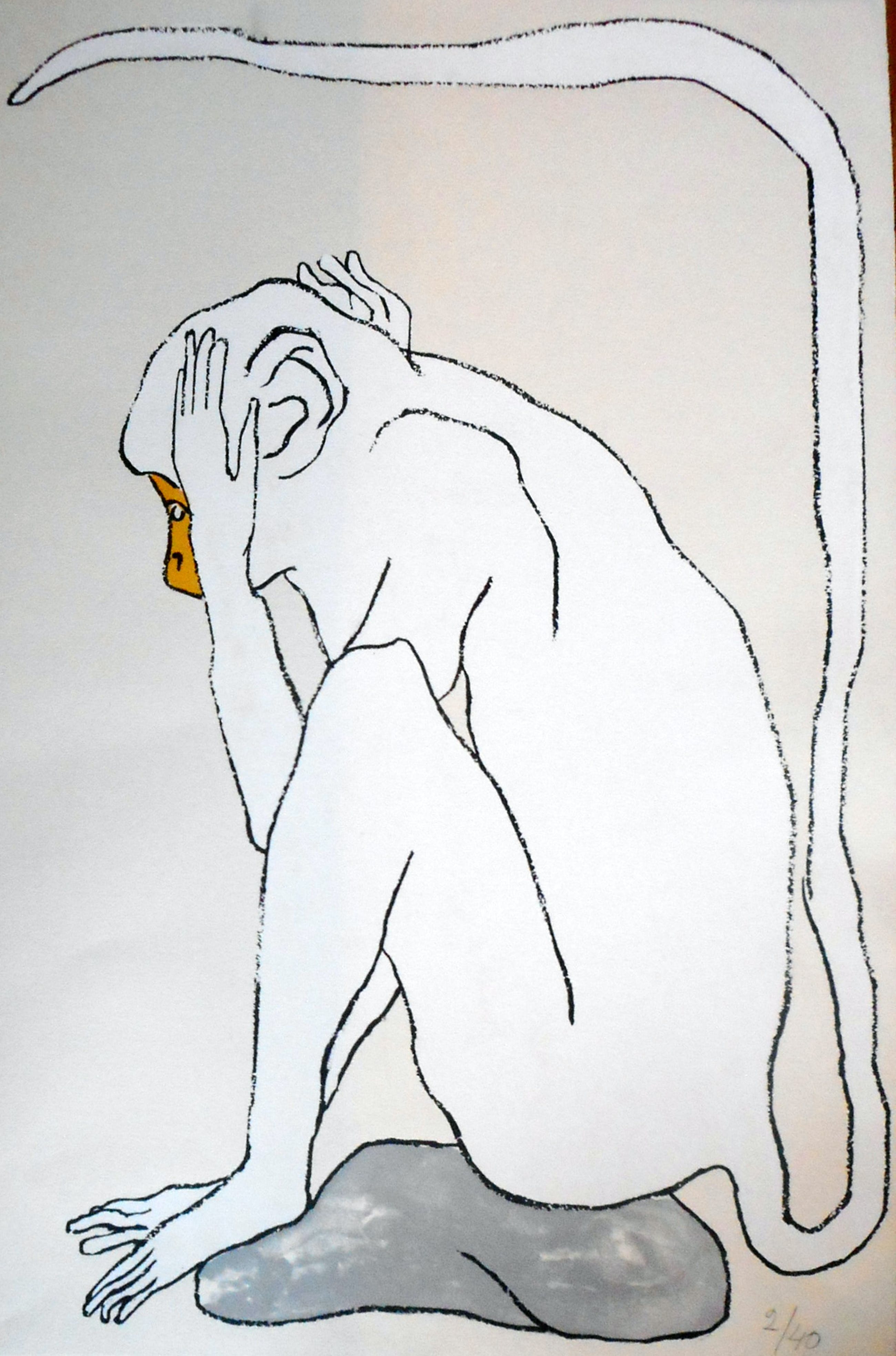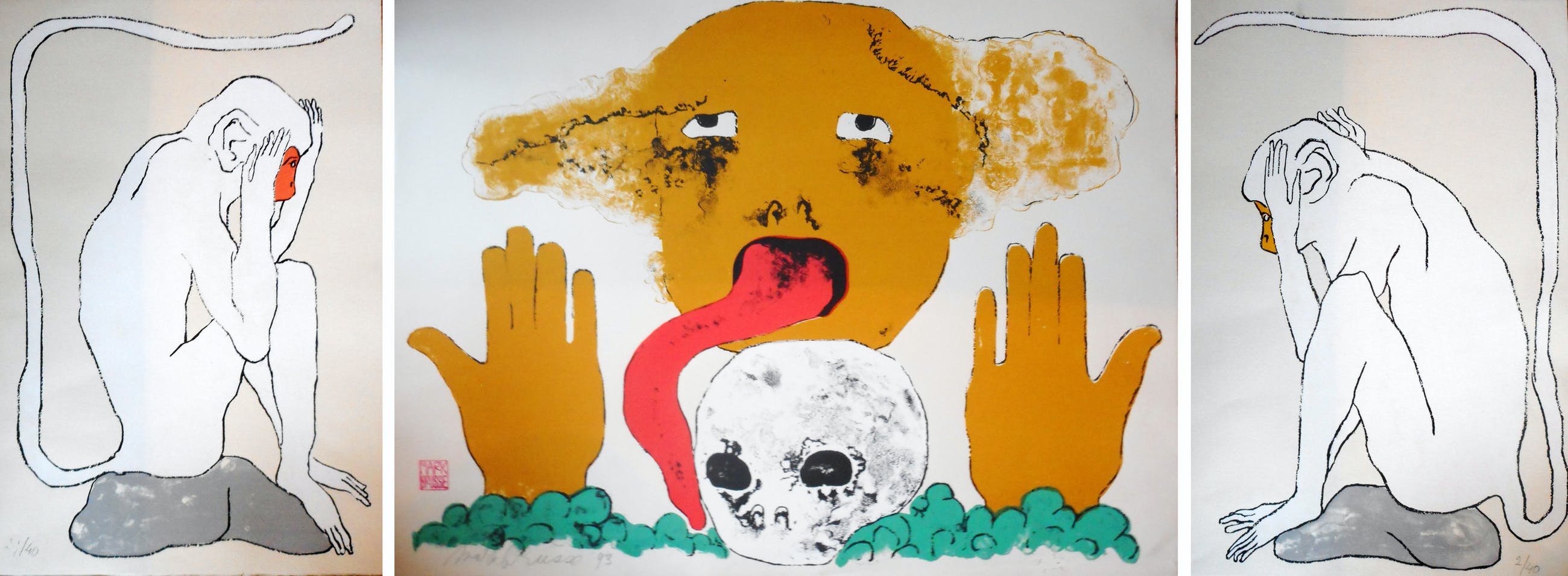 3 prenten 2x aapje links en rechts + middenstuk nr. 2 van 40 gesigneerd en gestempeld door de kunstenaar