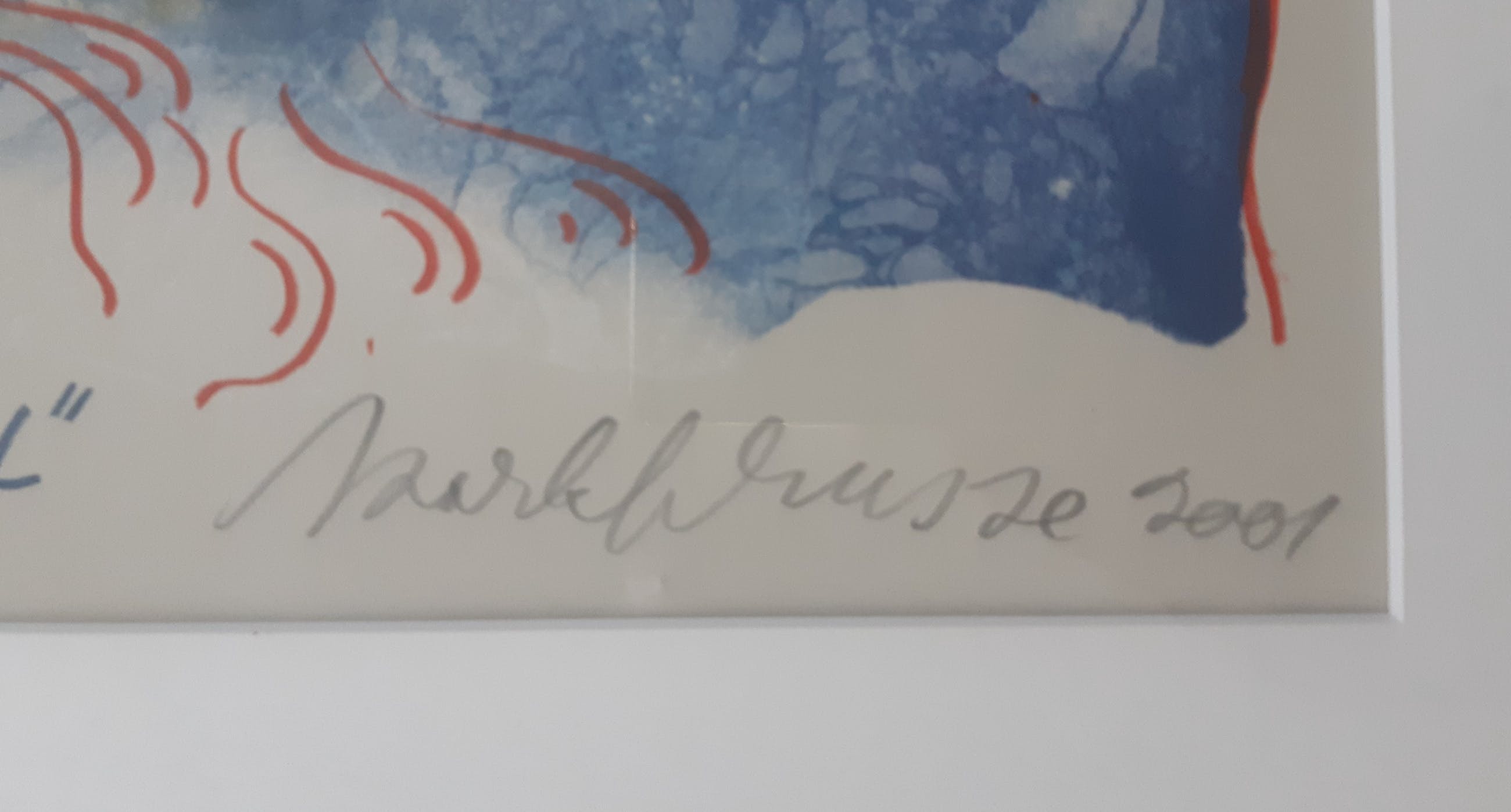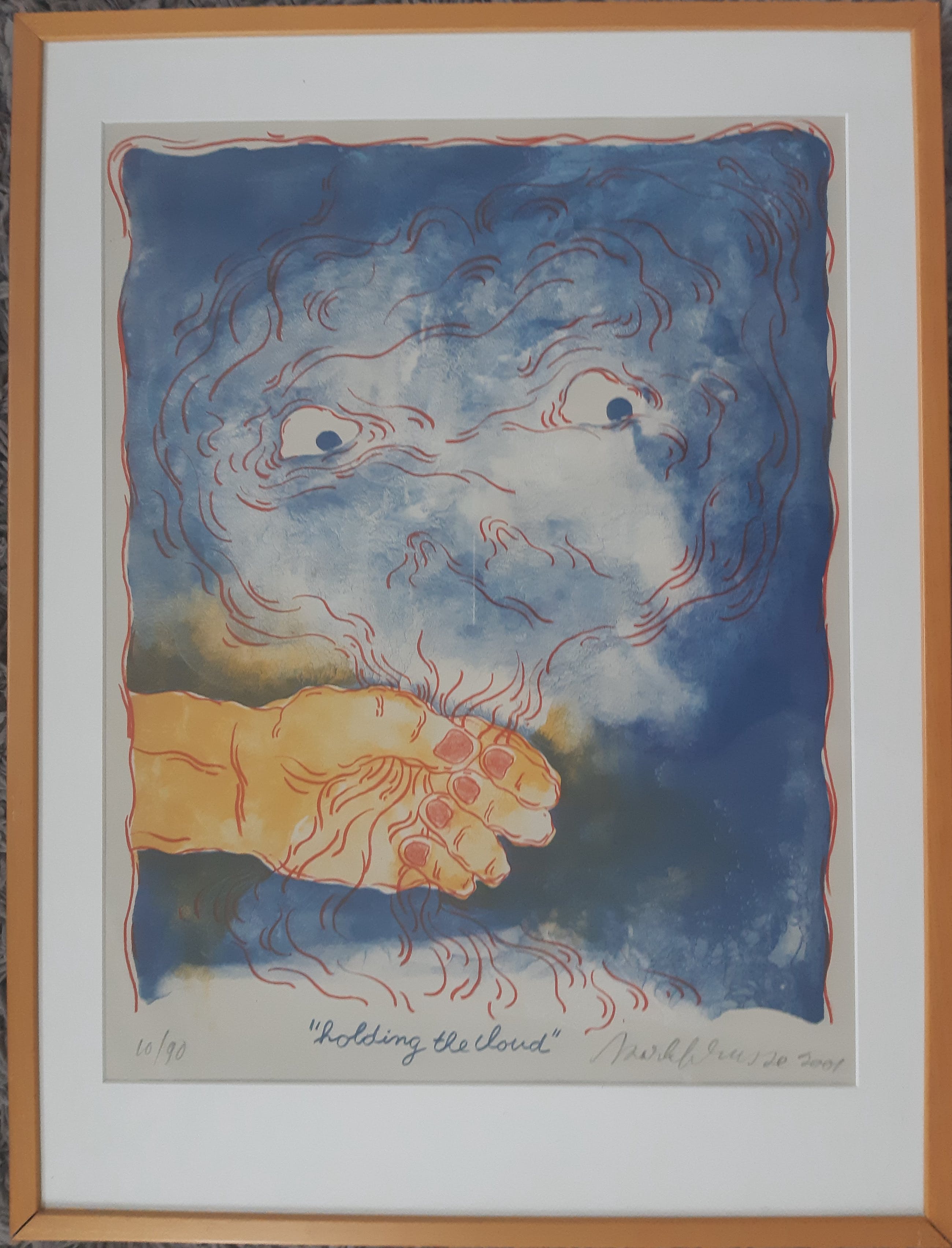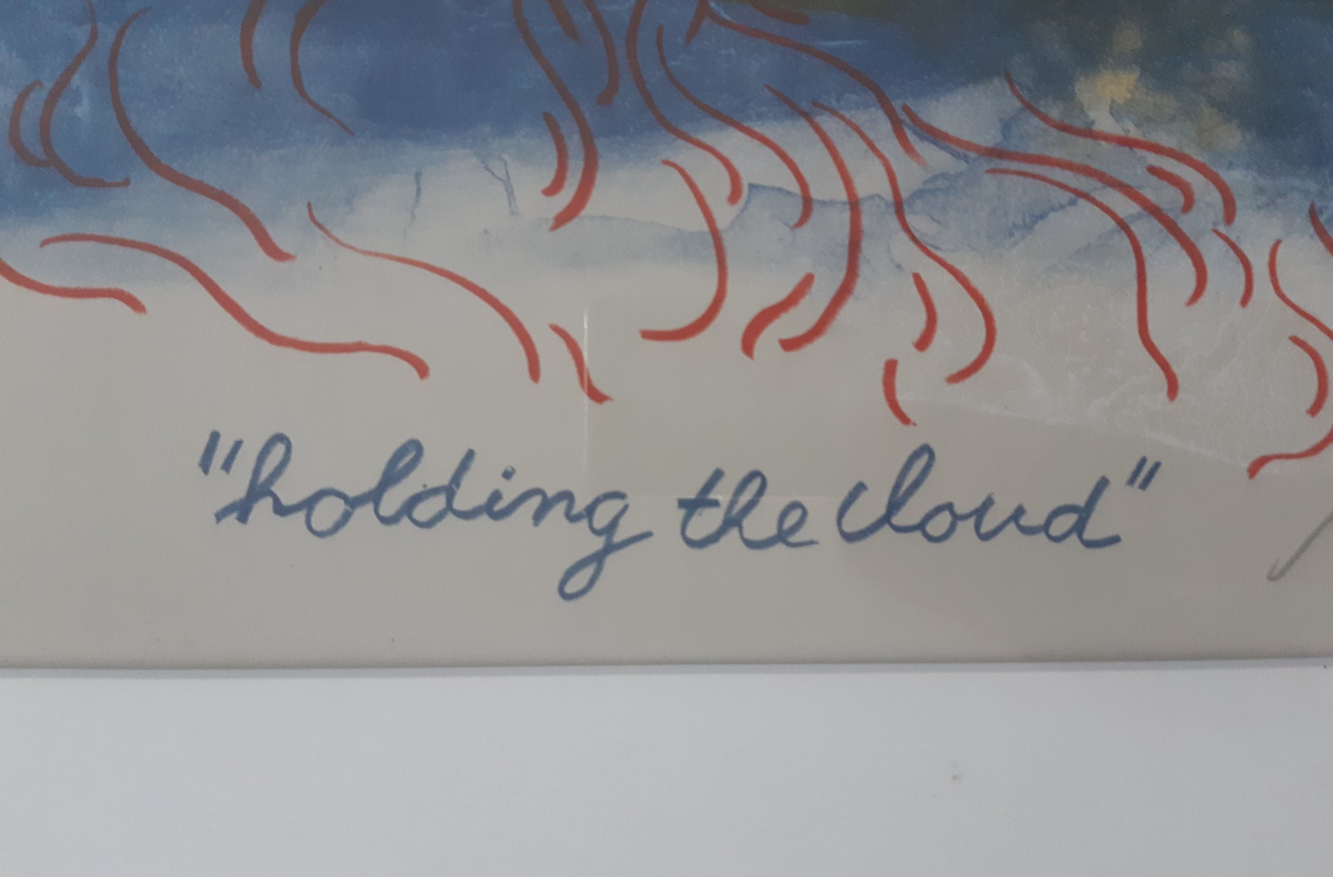 Kenmerkende litho van Mark Brusse, getiteld Holding the Cloud. De litho is met potlood door de maker voorzien van signatuur, datum en oplagenummer. Ingelijst in houten lijst. De conditie van het werk is zeer goed, de lijst heeft lichte gebruikssporen. Op de foto's kunnen reflecties zichtbaar zijn.