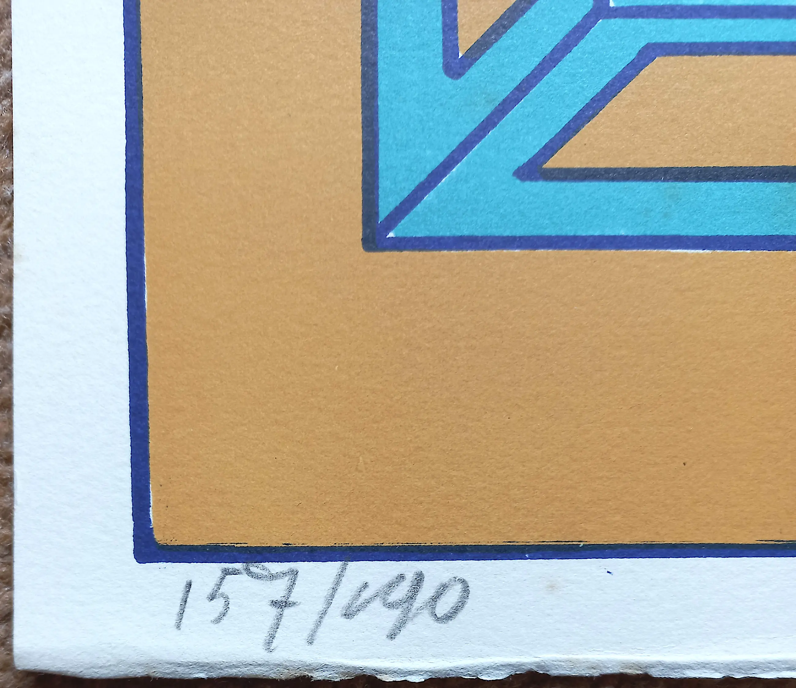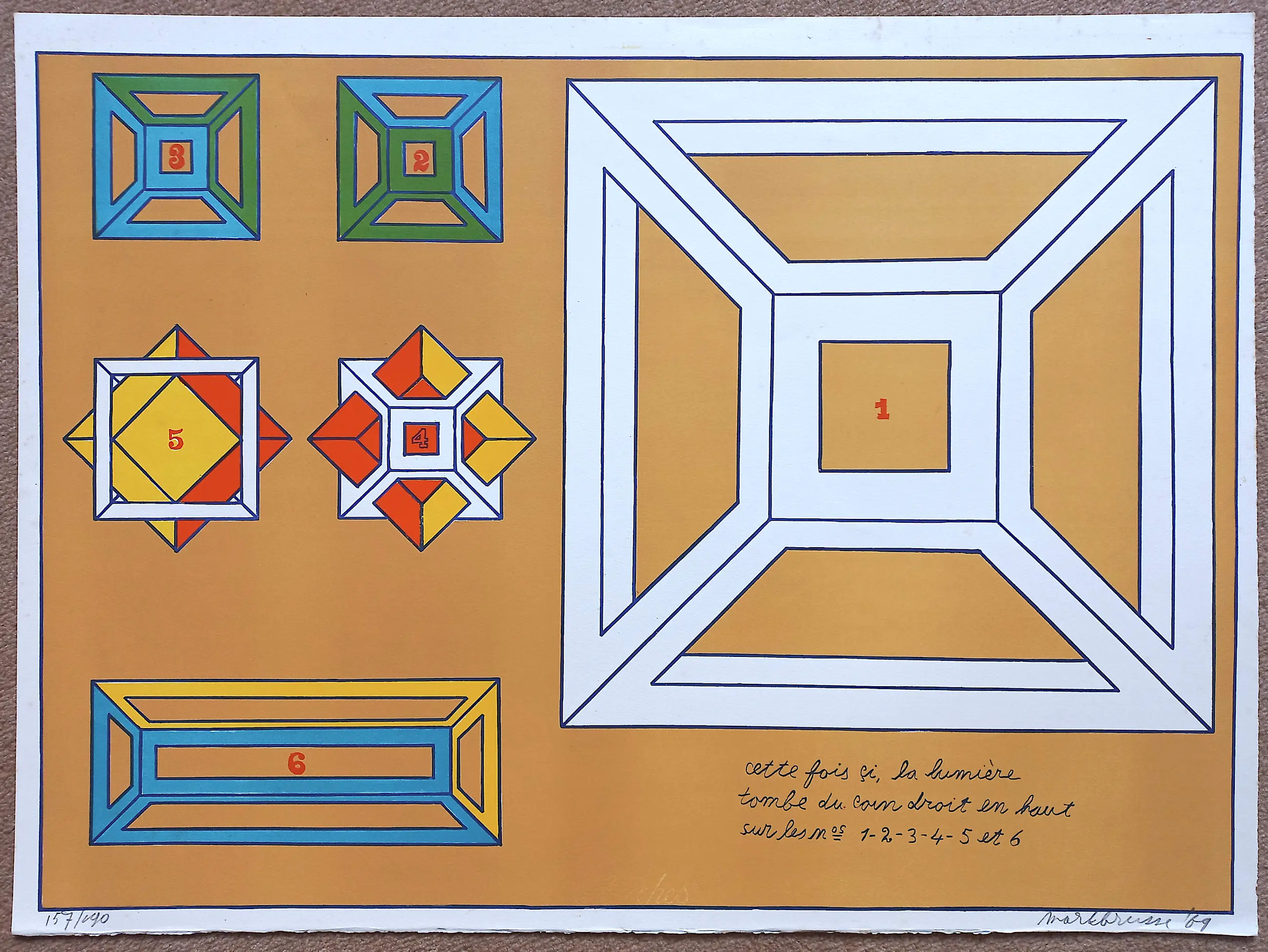 Bekende compositie met geometrische vormen van Mark Brusse. Litho op Arches papier, met potlood gesigneerd, gedateerd (‘69) en genummerd (157/190). In goede conditie.