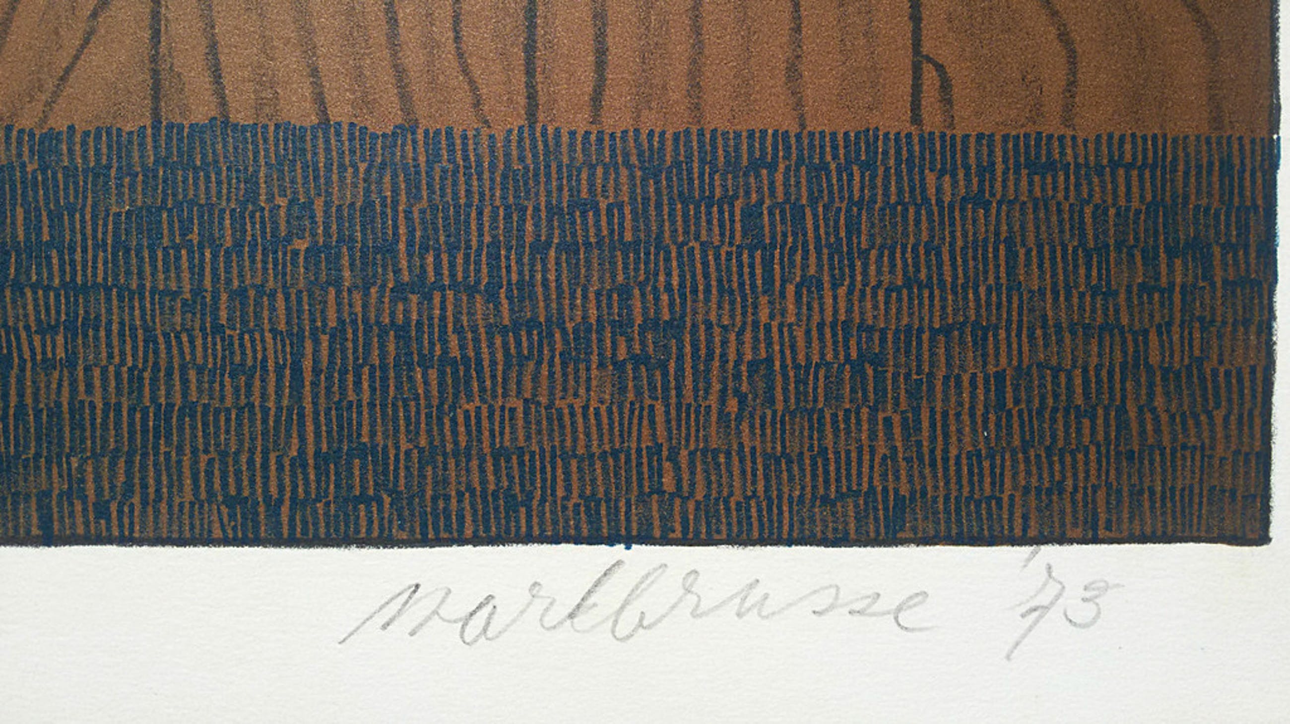 Zeer bekende litho van Mark Brusse uit 1973, uitgegeven door Prent 190. Met potlood gesigneerd, gedateerd en genummerd (3/190). In redelijk goede conditie; er zitten in de witte marge wel wat ouderdomsplekjes. Goed ingelijst met passe-partout voor het grootste gedeelte niet zichtbaar, en voor de rest niet heel storend naar mijn mening.