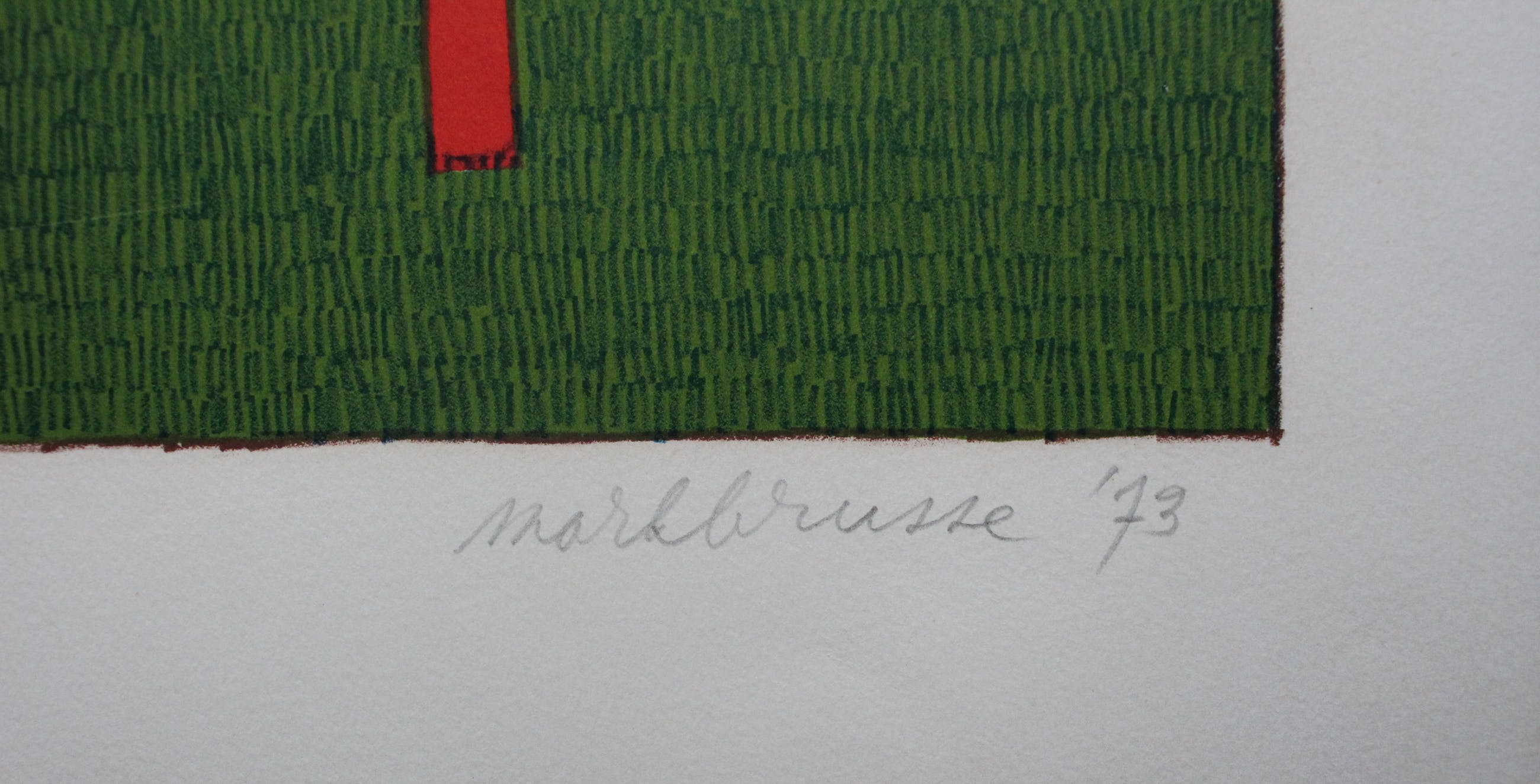 Zeer bekende litho van Mark Brusse uit 1973, uitgegeven door Prent 190. Met de hand gesigneerd, gedateerd en genummerd met potlood. Dit is nummer 30 uit een oplage van 190 stuks.