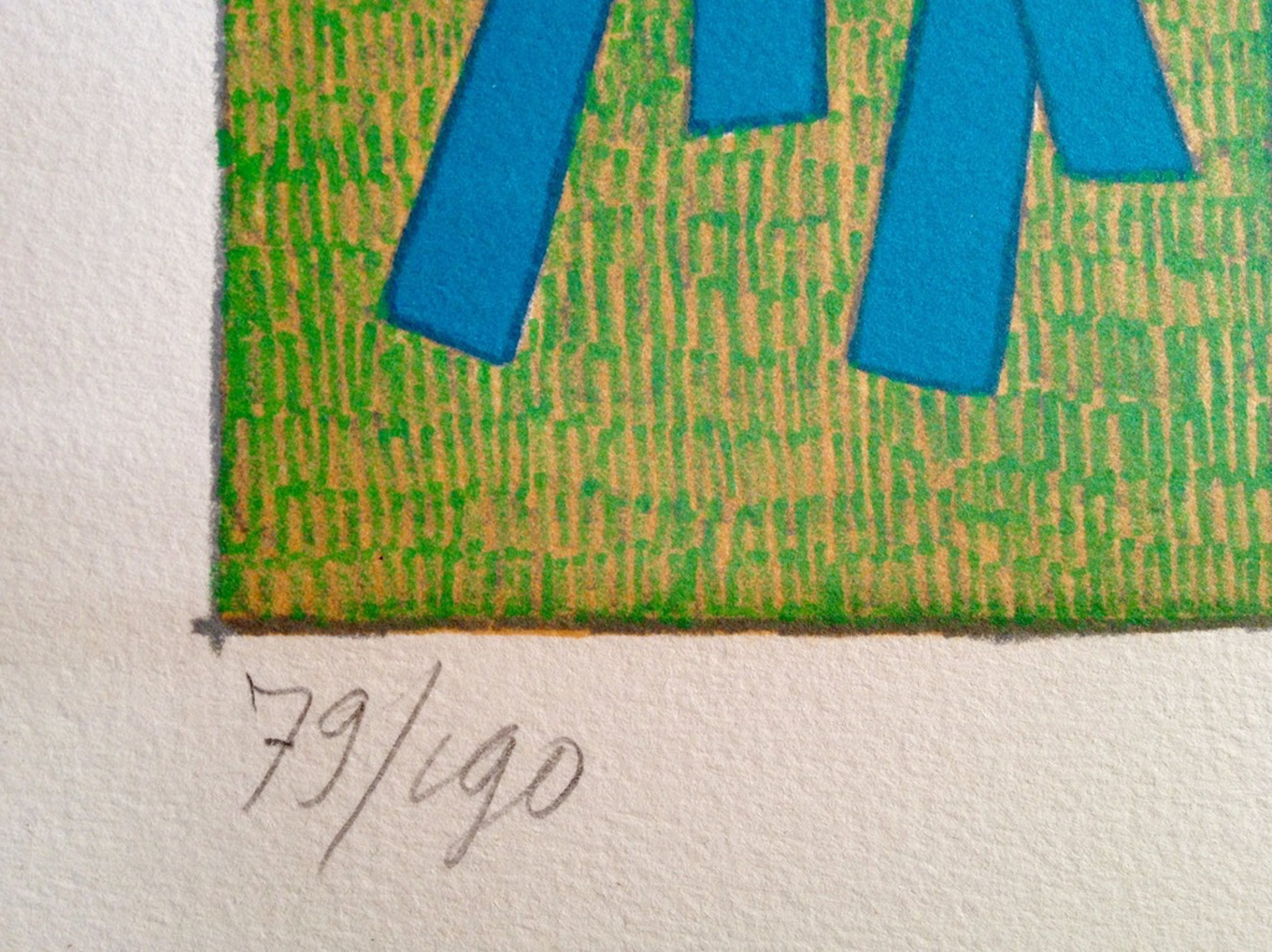 Frisse en heldere litho in karakteristieke scherpe pop art kleuren en lijnvoering. Prent is 45x65 cm2, blad is 64x77 cm2. prima conditie, groot werk, prachtig aan de muur! Uit de vermaarde Prent 190 serie. Door de kunstenaar met de hand in potlood gesigneerd, gedateerd en genummerd 79/190.