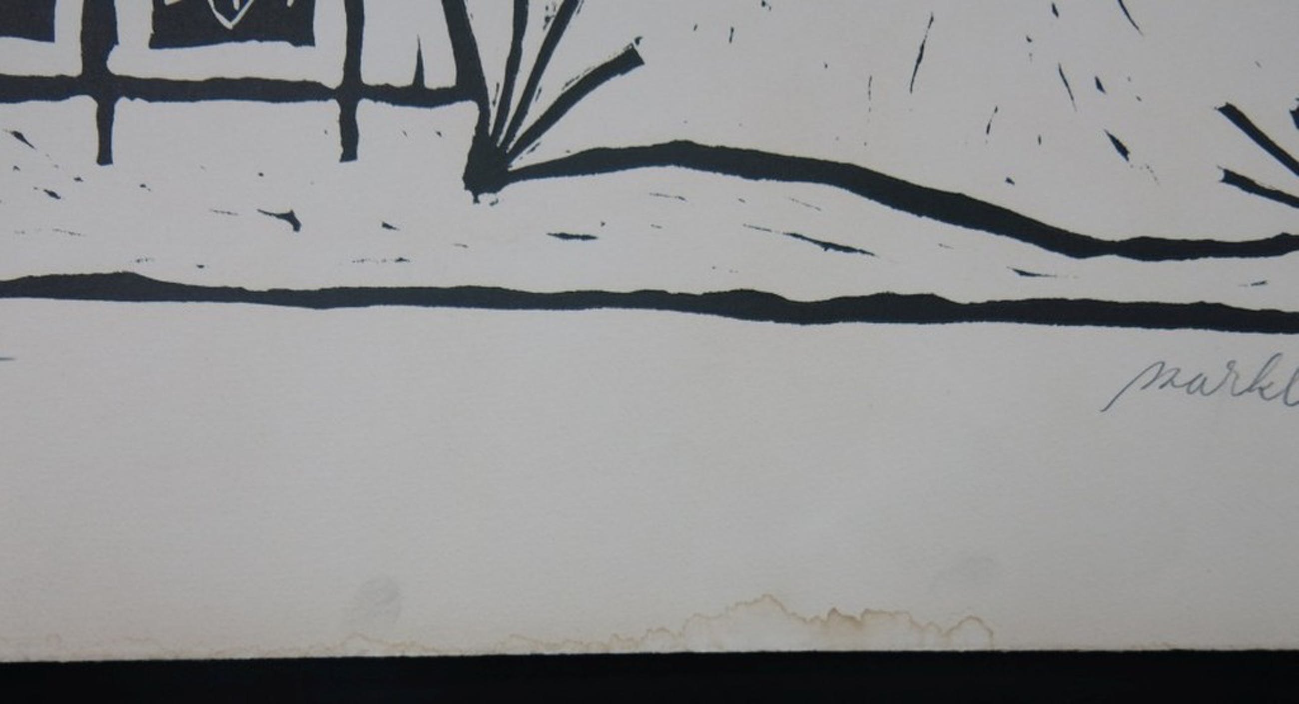 Conditie: In goede staat, maar het blad is egaal vergeeld en heeft in de uiterste onderrand van het blad een vochtvlek (zie foto). Ingelijst niet zichtbaar.