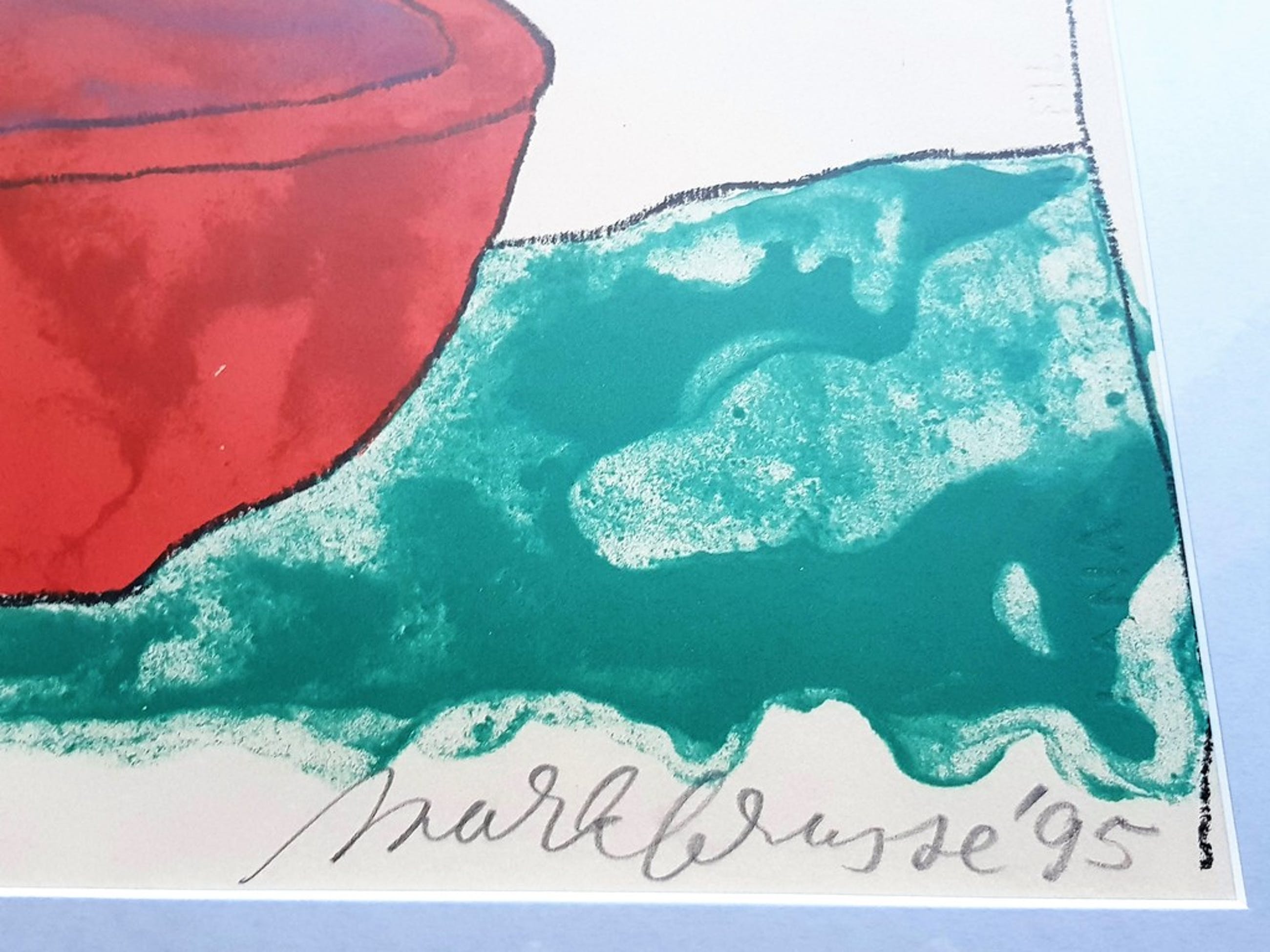 Mark Brusse. Geboren in 1937 te Alkmaar. Lithografie. Gesigneerd: Mark Brusse. Afm Totaal: 85.5 x 65.5 cm Beeldformaat: 75 x 65 cm. Oplage van 50, dit is nummer 23. Inclusief: aluminumlijst, glasplaat en ophangmogelijkheid. Het verkeerd in perfecte staat. i.v.m. glasplaat en grote afmeting kan het alleen opgehaald worden.