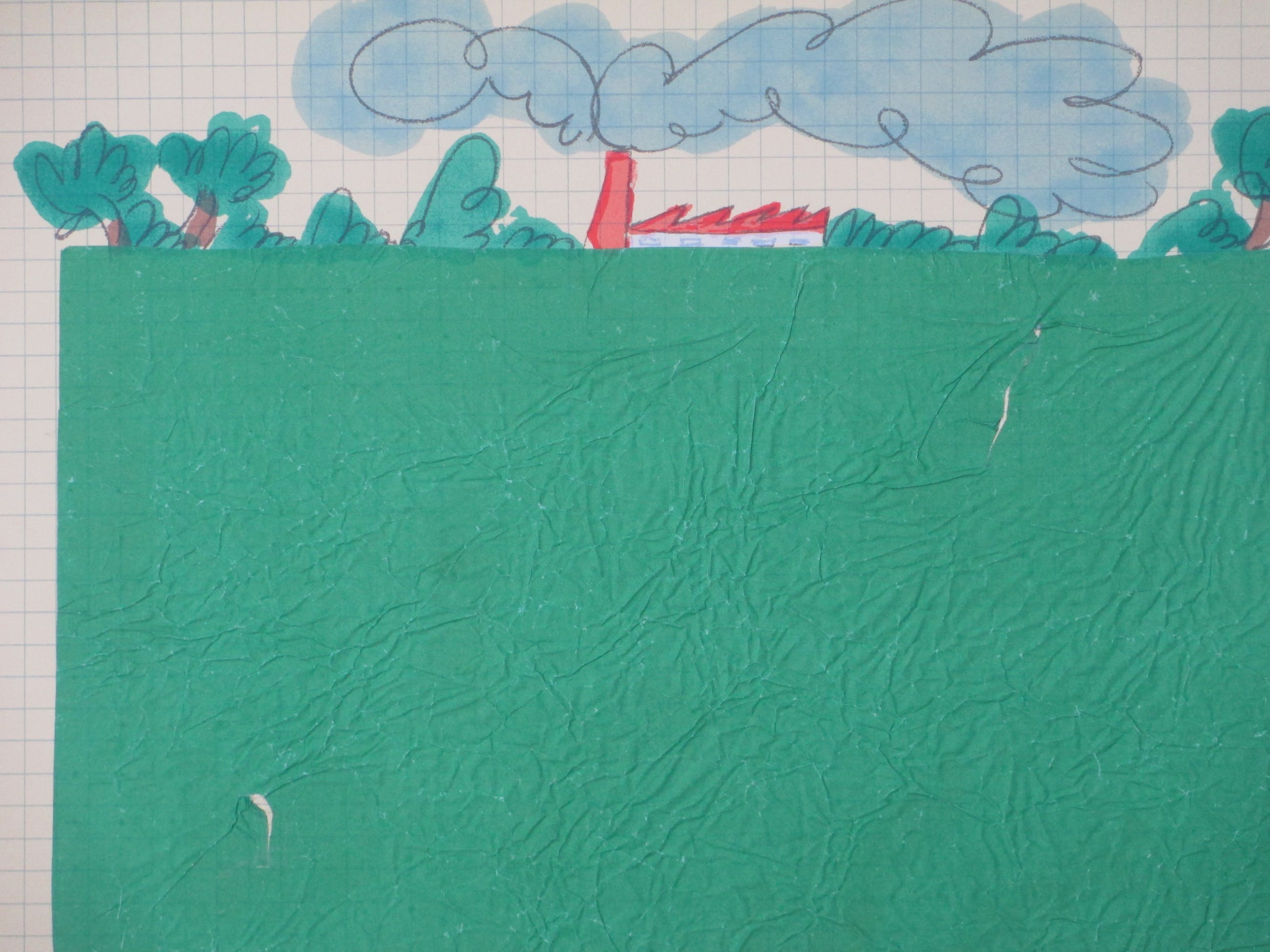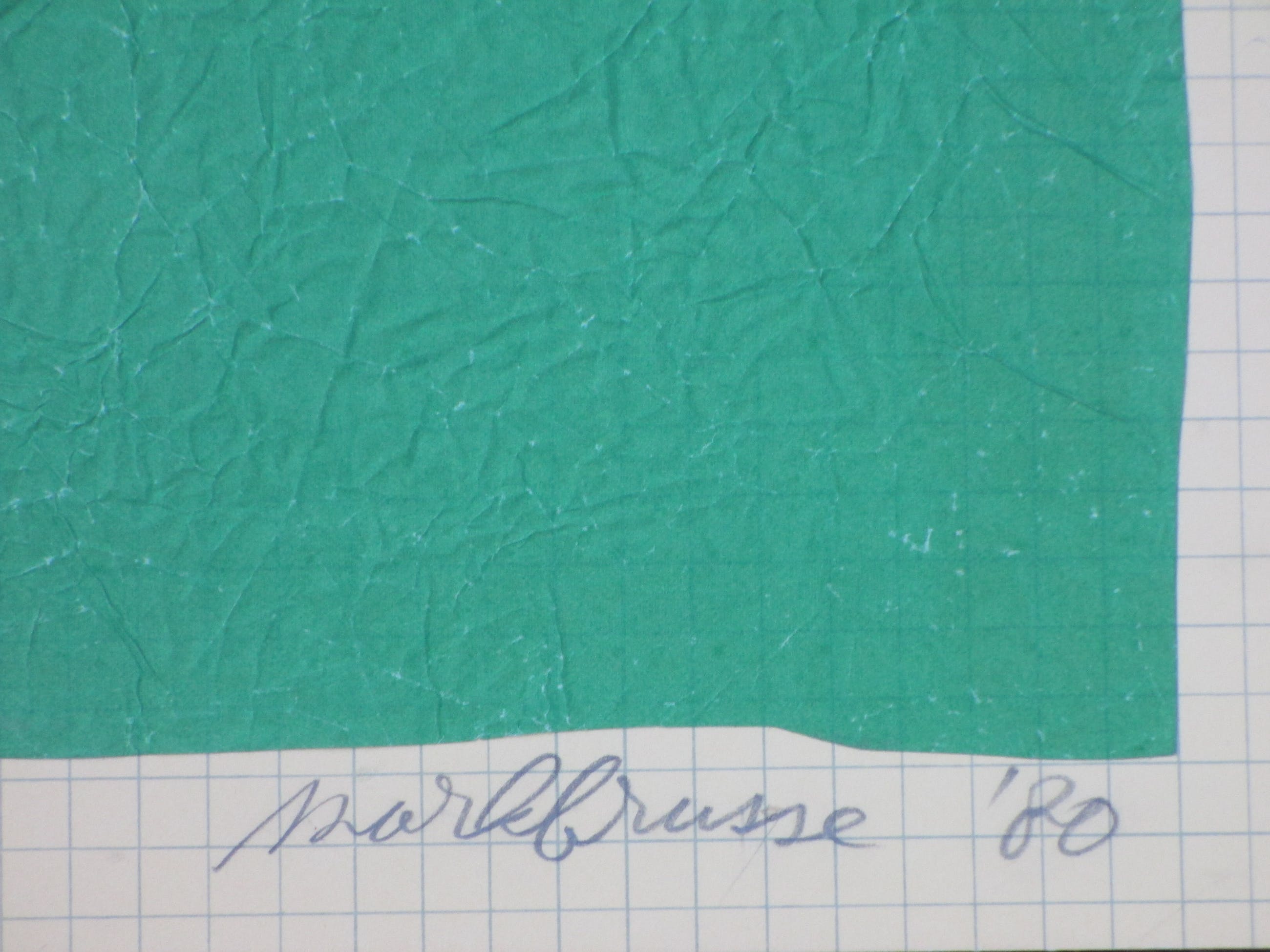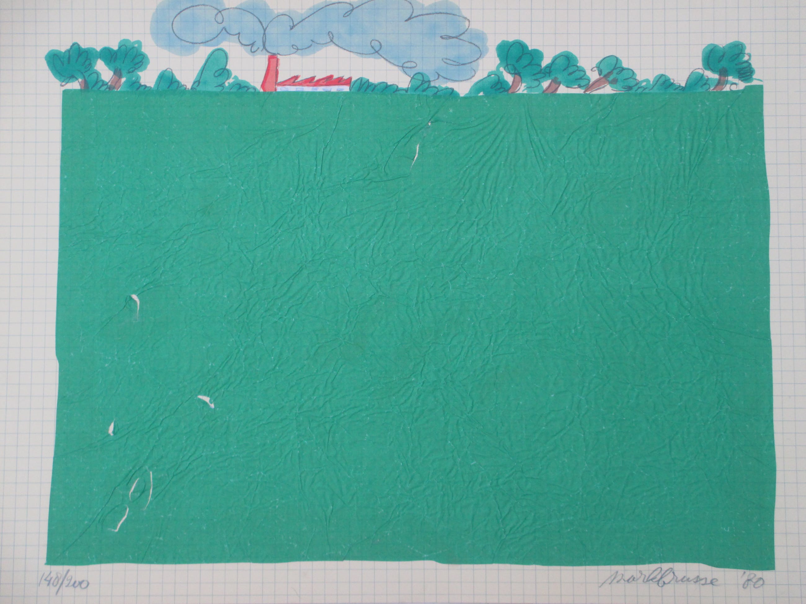 Zeefdruk door Mark BrusseVoorstelling van oprukkende industrieWeiland bijzonder vormgegeven met crêpe-papierLosbladig, beeldmaat 50x70Gesigneerd en gedateerd r.o. ' Mark Brusse ' 80' Genummerd l.o. ' 148/200'Authenticiteit volledig gegarandeerd