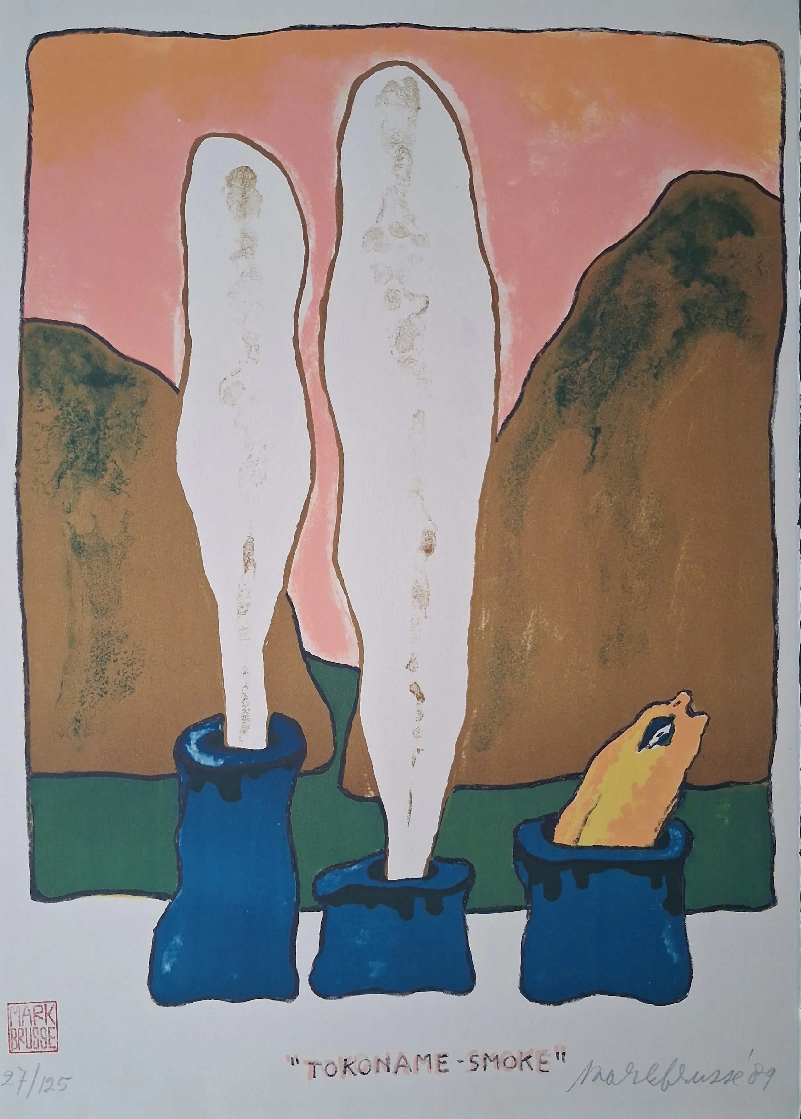 Brusse verbleef enige tijd in Japan. Daar kwam de inspiratie vandaan voor dit werk. De litho is met potlood door de maker gesigneerd, genummerd en gedateerd. Daarnaast een atelierstempel. Afgedrukt op licht getint papier. De conditie van het werk is zeer goed. Op de achterkant een plakstrook waarmee het op een achterblad was gemonteerd.