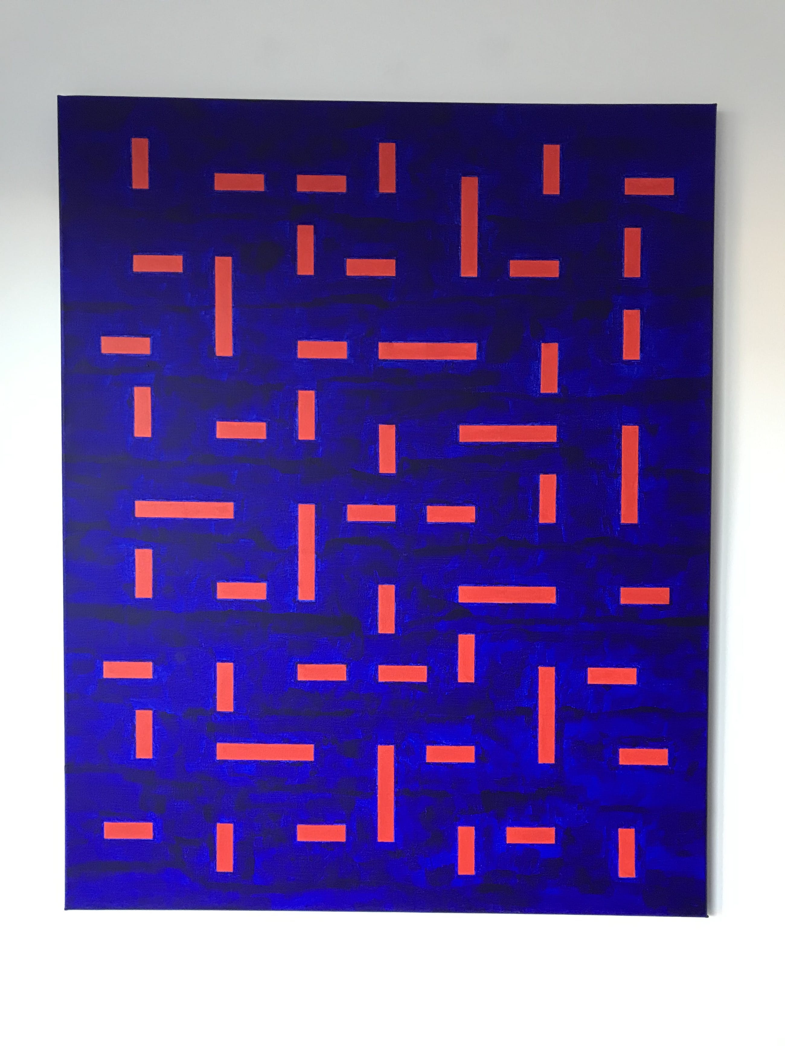 Prachtig abstract schilderij. Het beeld is opgebouwd uit 1 basis ‘tegel’ die continu wordt herhaald en gedraaid. De sfeer van het schilderij verandert sterk bij wijzigende lichtinval.