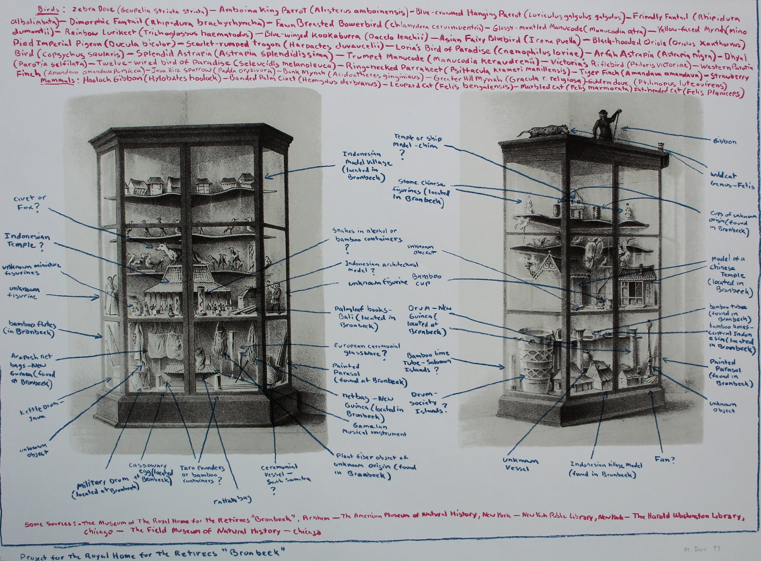 "De leukste "gelegenheidsgever' voor Sonsbeek is het tehuis voor oud-KNIL militairen Bronbeek dat in de loop der tijd ook een museum geworden. De collectie is grotendeels aan hobby's van de bewoners te danken: er zijn verzamelingen krissen, gamelan-instrumenten, vlinders en jachttrofeeën. De jonge Amerikaan Mark Dion vroeg de bewoners voor zijn kunstwerk "voorwerpen af te staan die voor hen een louter intieme waarde vertegenwoordigen. Zonder de toelichting van de kunstenaar kun je niet weten dat een koffieblik (merk Garanda) voor de eigenaar een symbool van zijn leven is; hij liet het zelfs in het interneringskamp tijdens de oorlog ongeopend. Twee houten beeldjes uit Celebes, stal een Hollandse man ooit van zijn inlandse maitresse, zo bekende hij aan de kunstenaar. Wat Dions vitrines inhoud geeft, zijn deze "gestolen' verhalen, niet de ingreep van de kunstenaar."