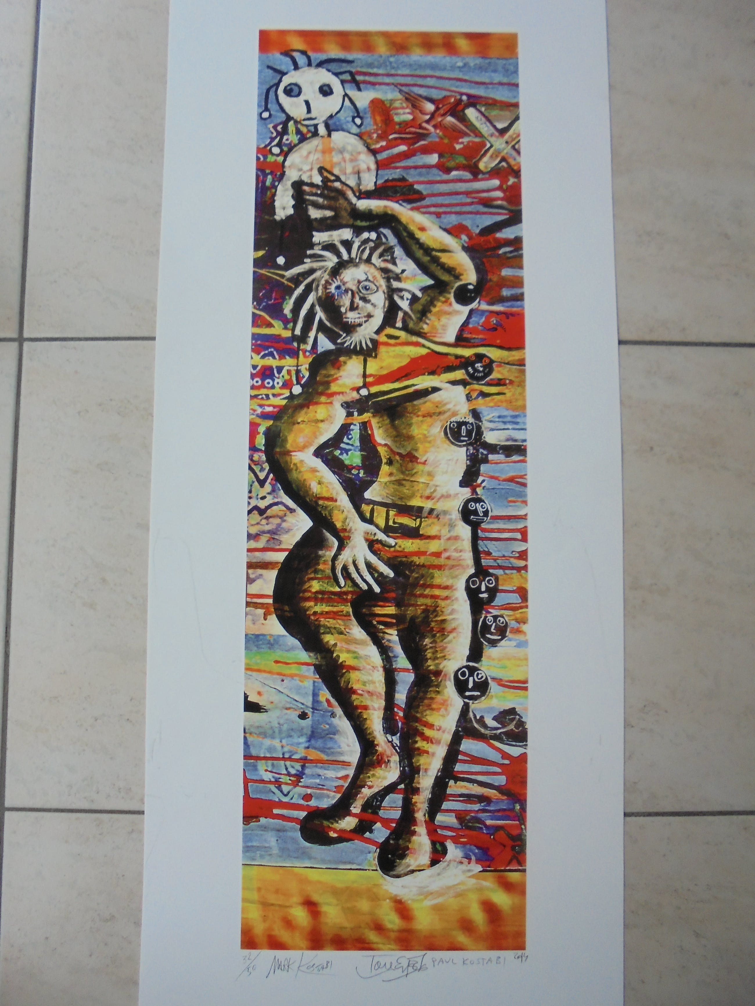 Ik bied een prachtig kunstwerk aan van de gebroeders Mark en Paul Kostabi, in samenwerking met Tony Esposito. Het stamt uit een wat vroegere periode (2014) en wordt nog zelden op de kunstmarkt aangeboden. Dit werk maakt deel uit van een serie van 5 zeefdrukken die samen de reis van Ulysses uitbeelden. Artiesten : Mark Kostabi, Paul Kostabi, Tony Esposito Titel: Eternity now Editie: 32/50 Papierformaat: 111 cm x 44 cm Beeldformaat: 88 cm x 26 cm