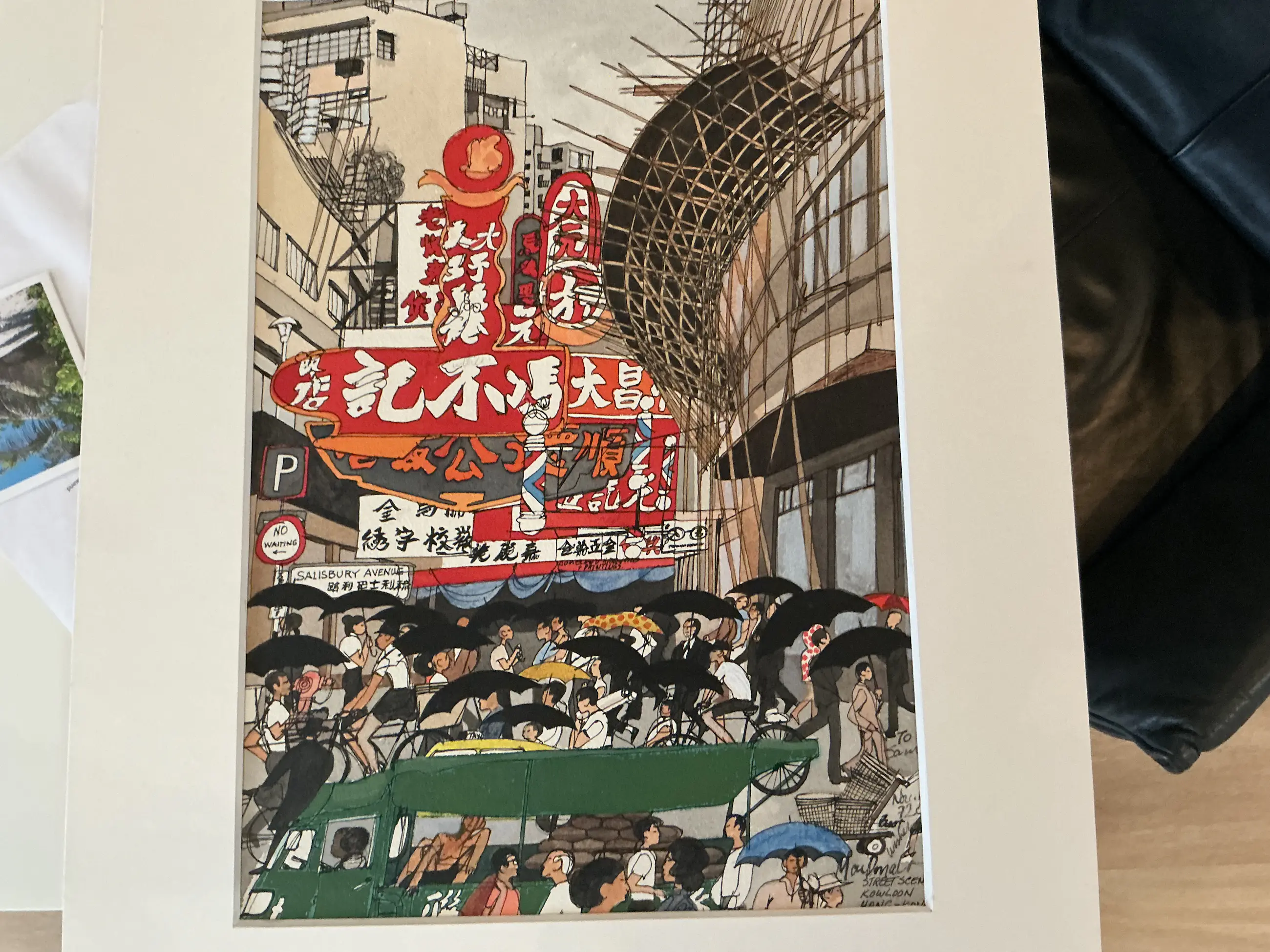 Mooie originele tekening/aquarel van Mark McMahan. Straatscene Hong Kong. Het betreft een uniek werk dus geen editie.