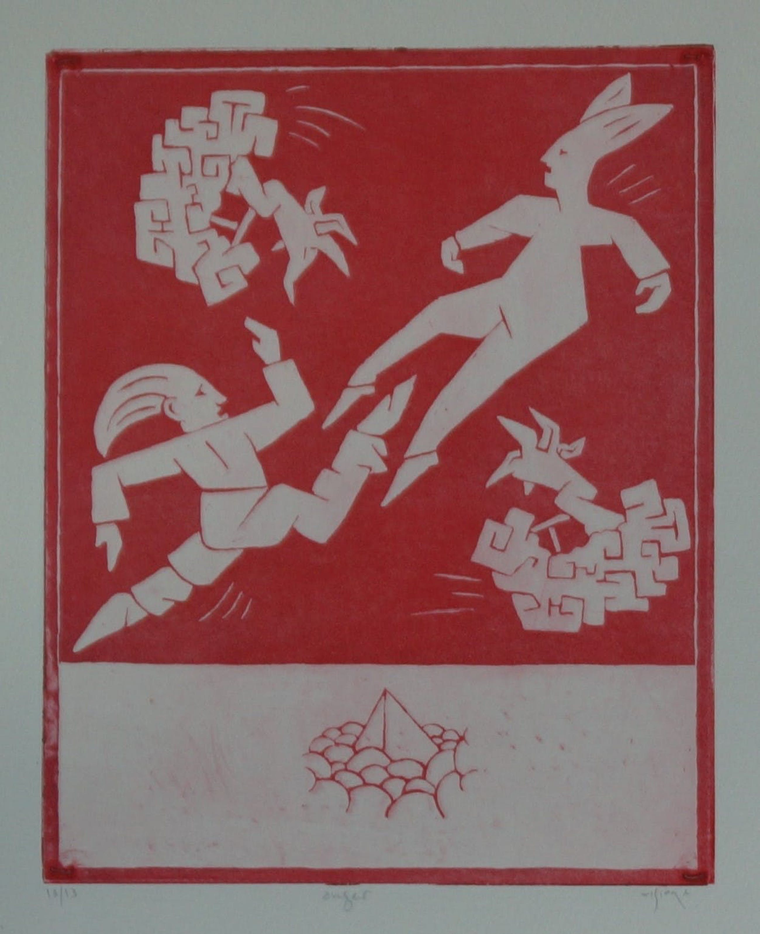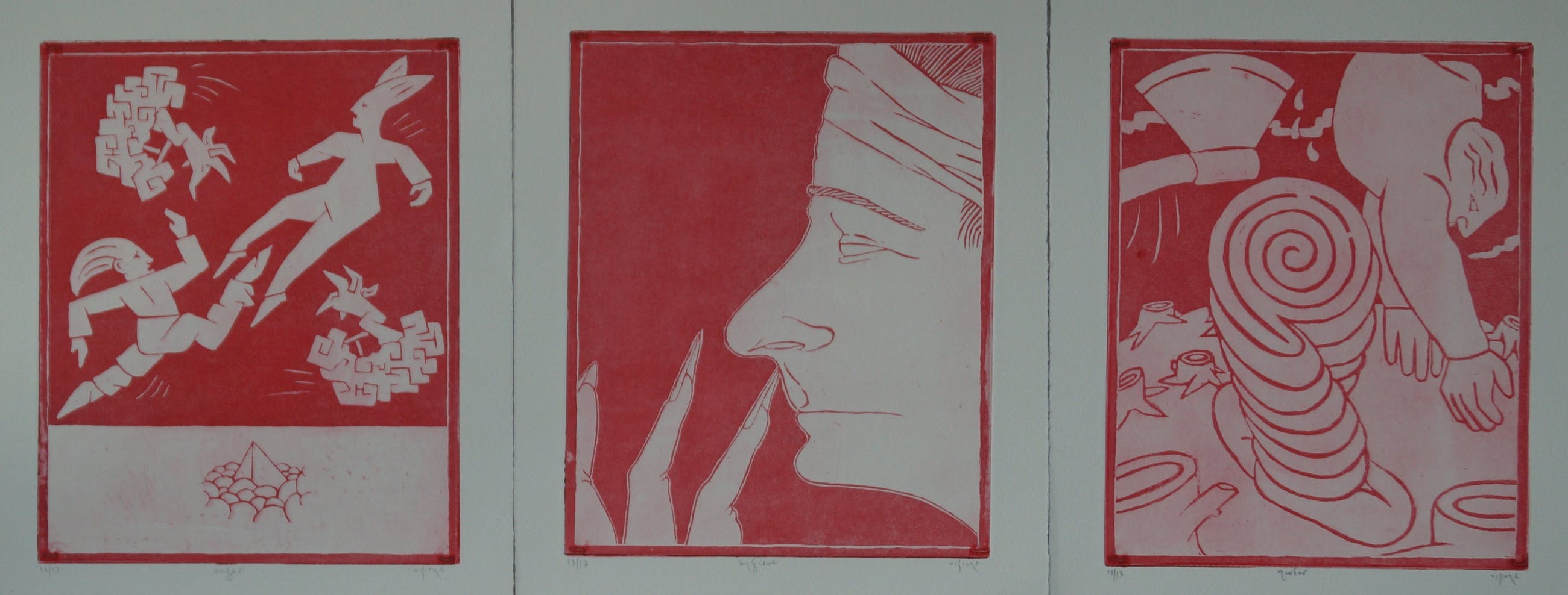 Drie gesigneerde etsen van Mark Visione Oplagenummer van alledrie: 13/ 13 Titel: Murder- Hygiene - Anger Afmeting afbeeldingen: 25 x 20 cm In zeer goede conditie