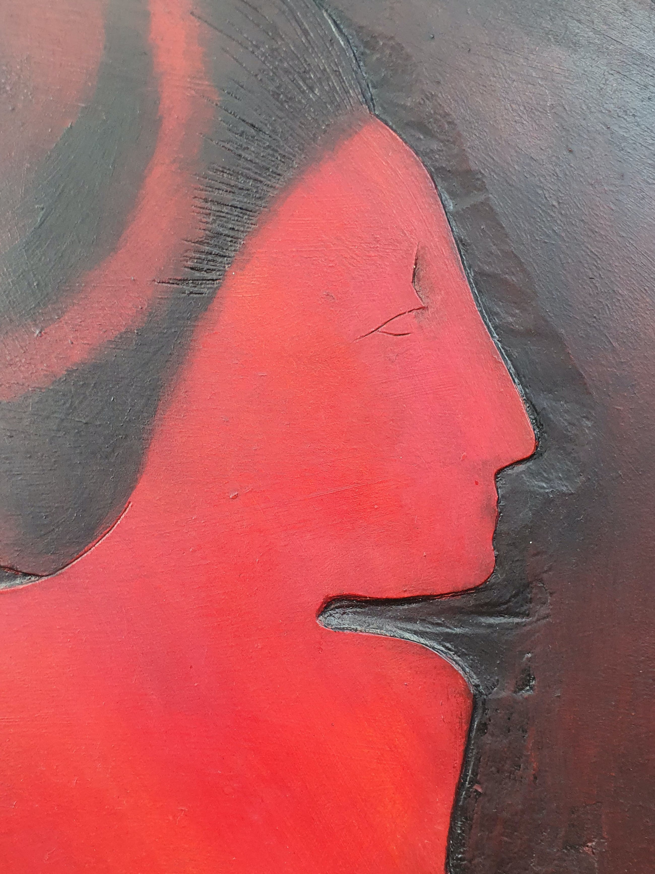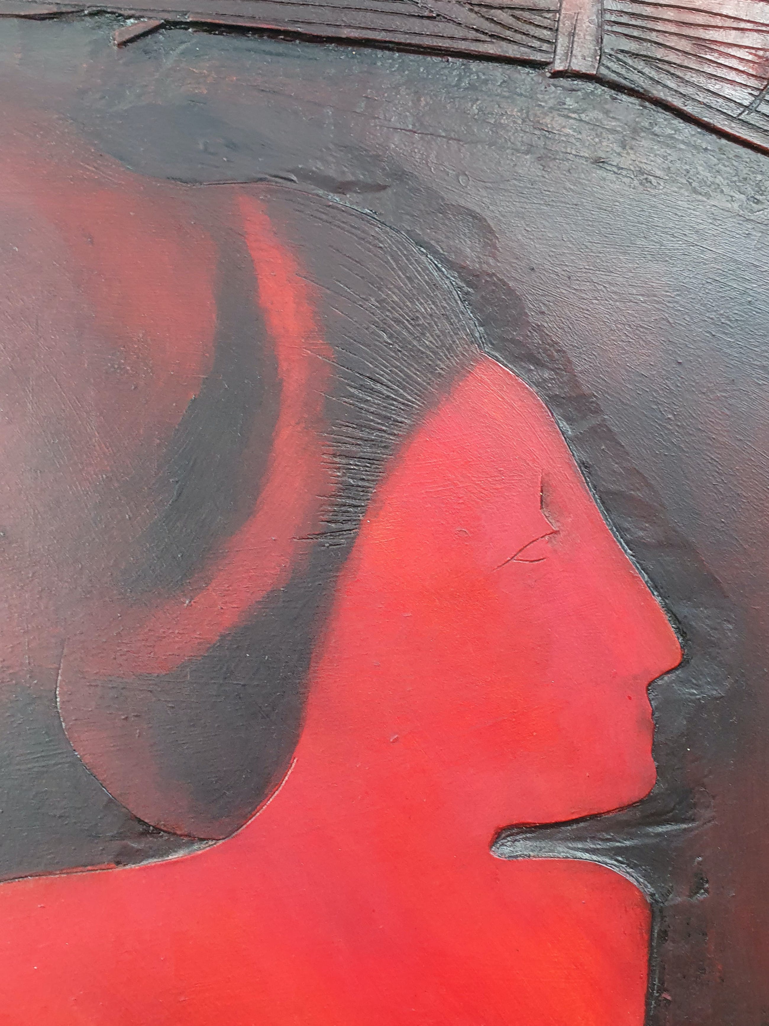 Zeer fraai beschilderd reliëf op board van Mark Visione met de titel: 'Grace'. De lijst is onderdeel van het kunstwerk.