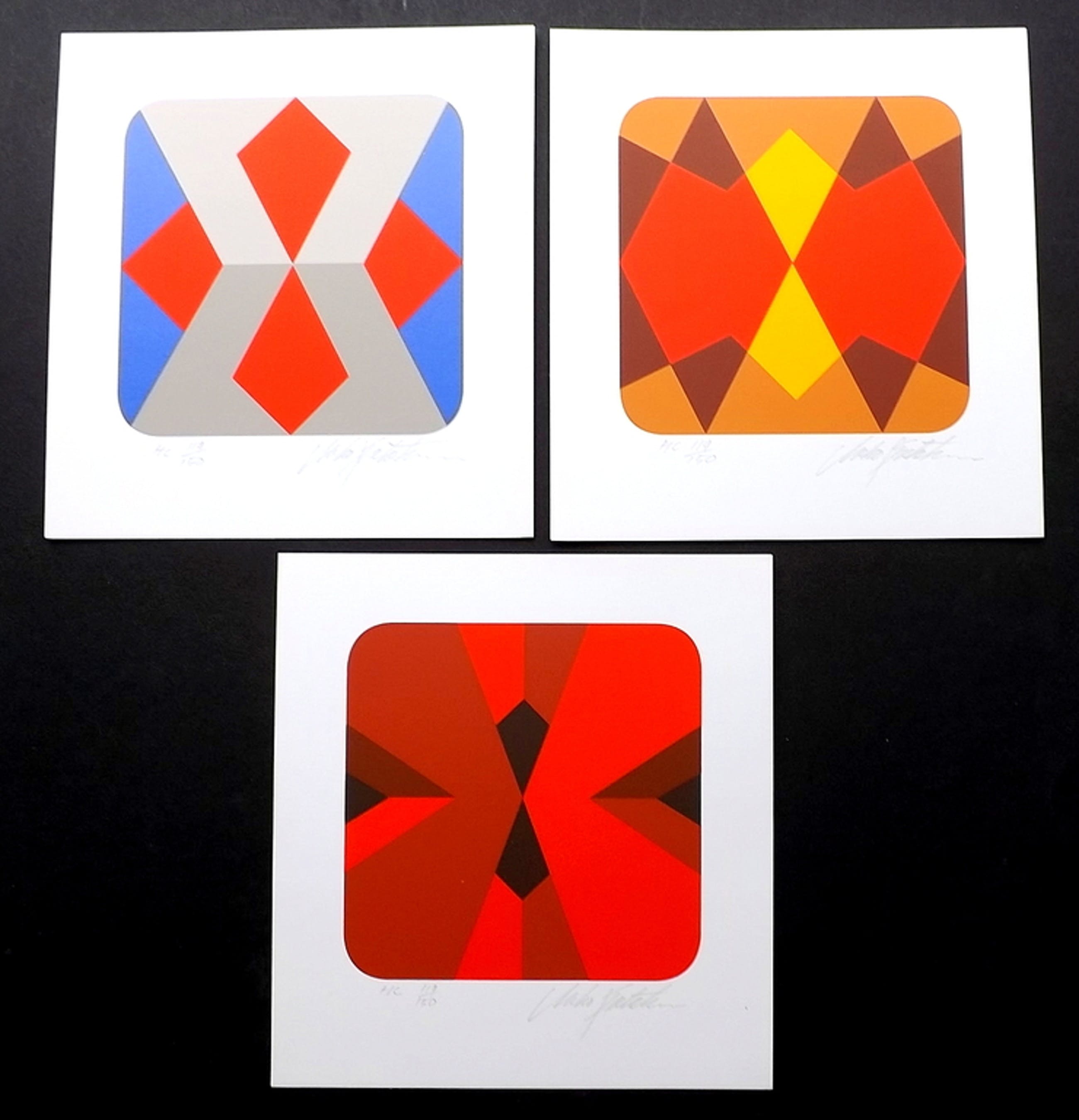 Aangeboden worden 3 abstracte geometrische werkjes in heldere kleuren, afdrukt op karton-achtig glanzend papier.