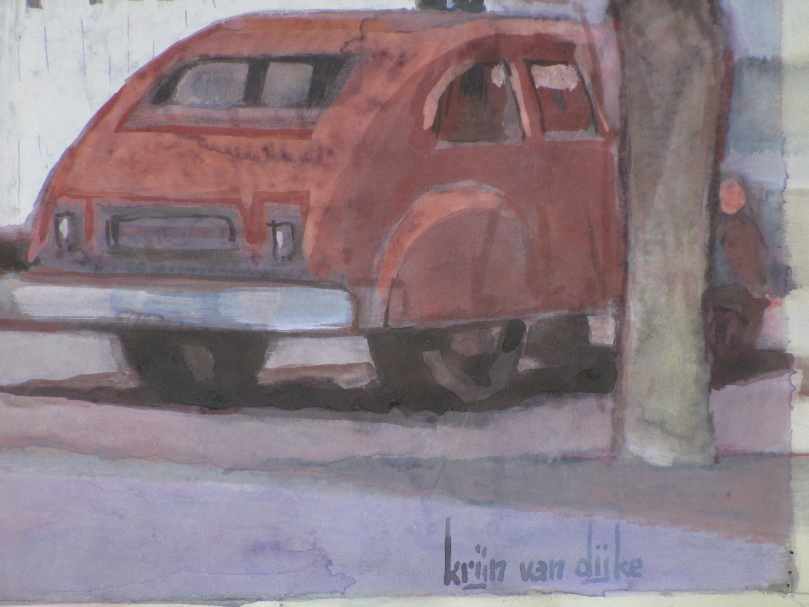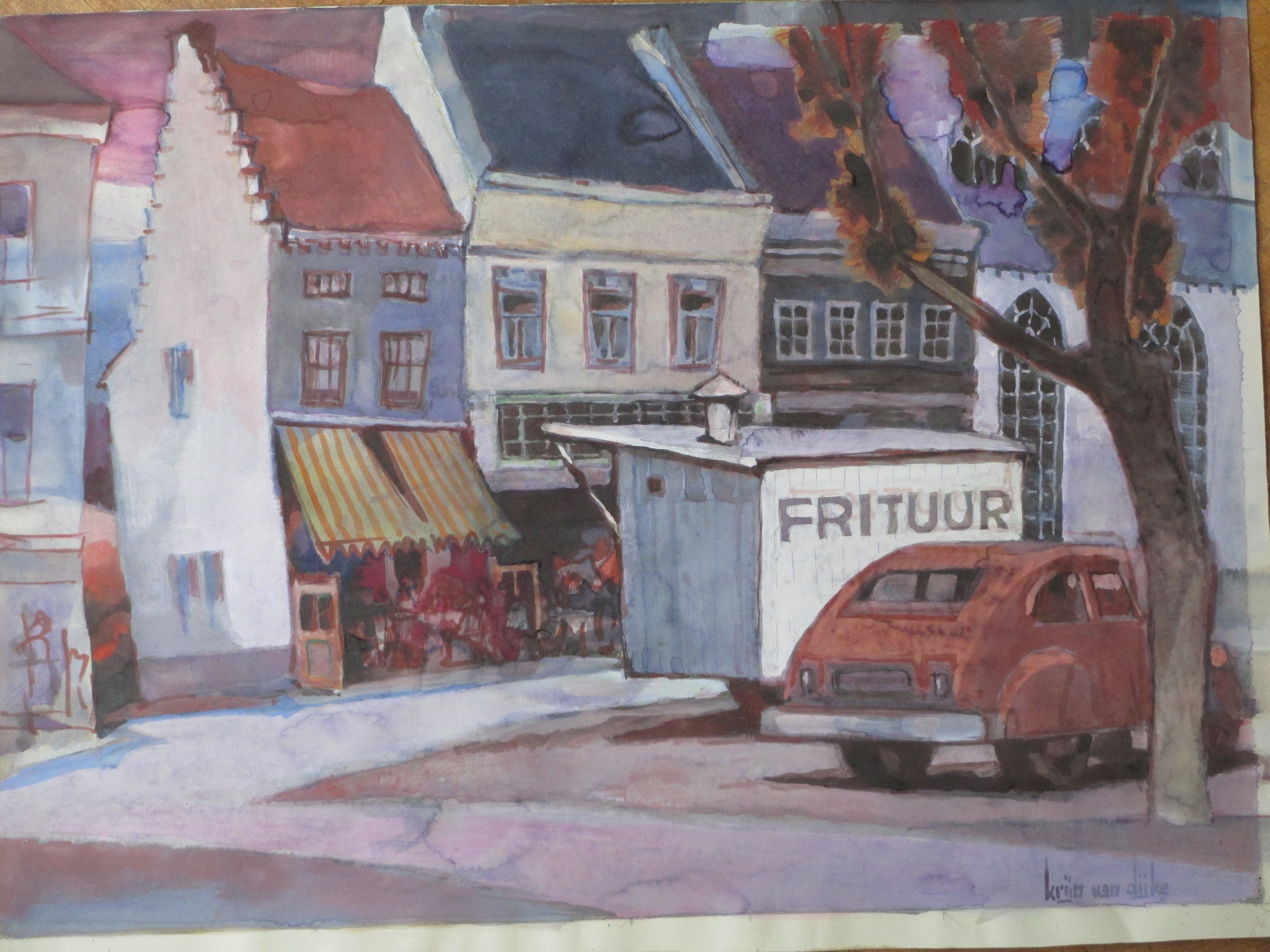 Aquarel door Krijn van DijkeVoorstelling van een marktplein met een ftituurLosbladig, beeldmaat 40x56Gesigneerd r.o. Authenticiteit volledig gegarandeerd