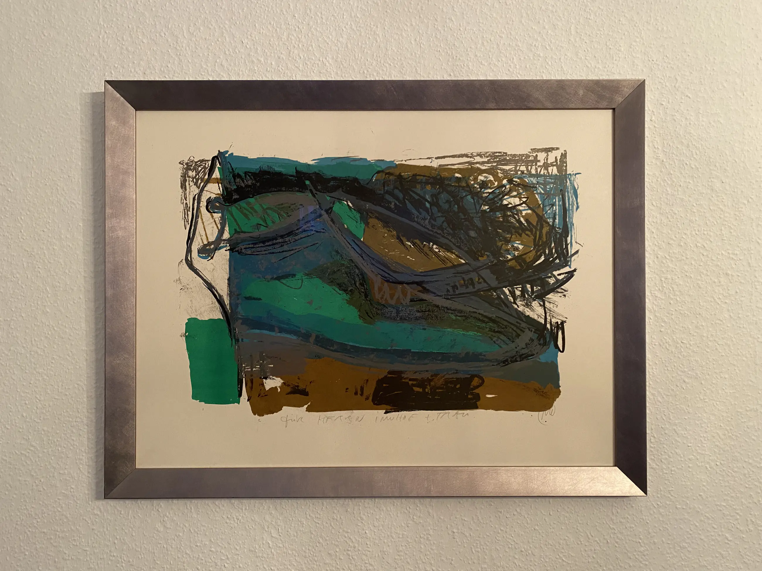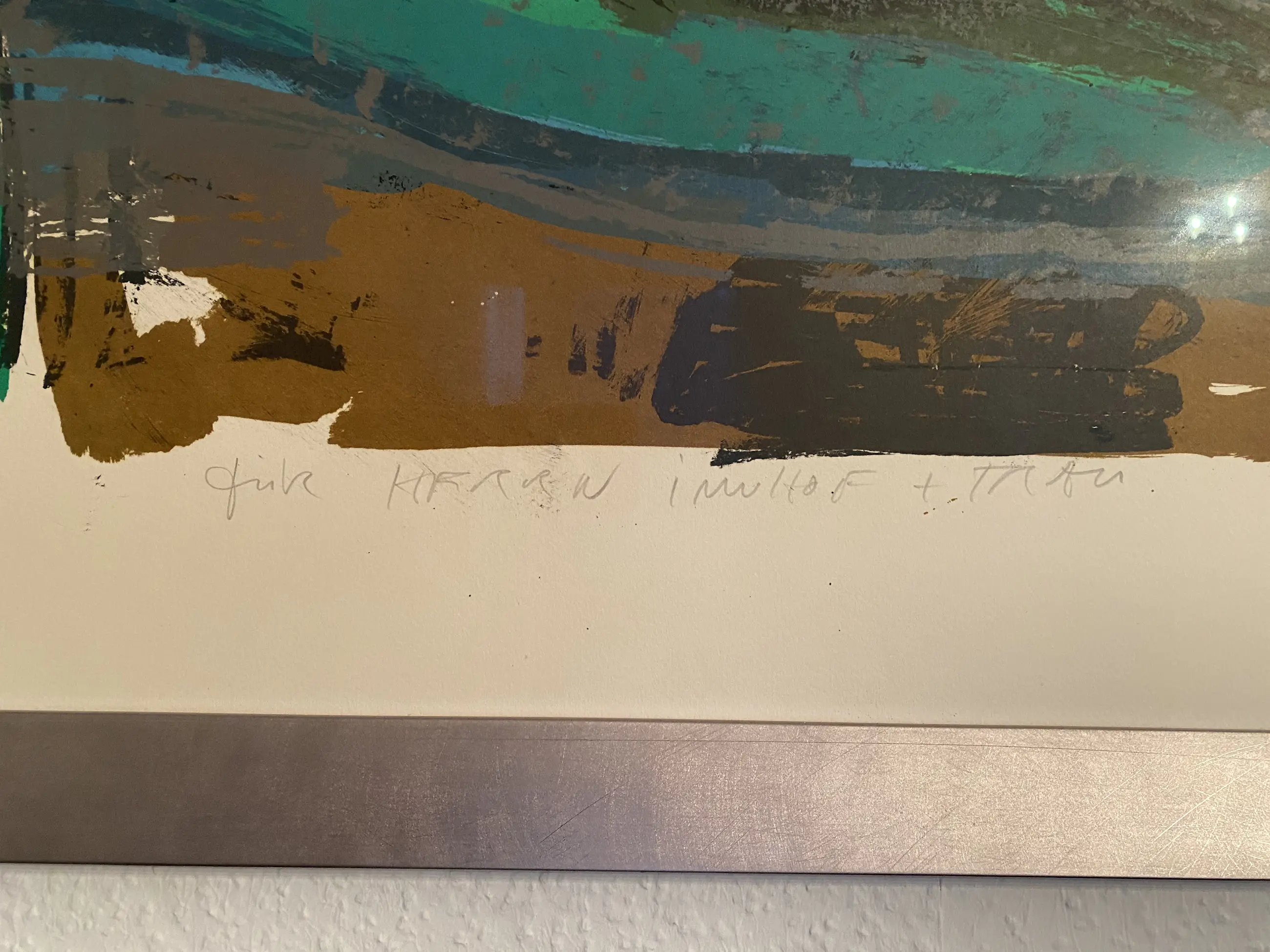 Kleurenlitho in 7 kleuren (groen, turquoise, bruintinten en zwart) van aluminiumplaten op perkament.
