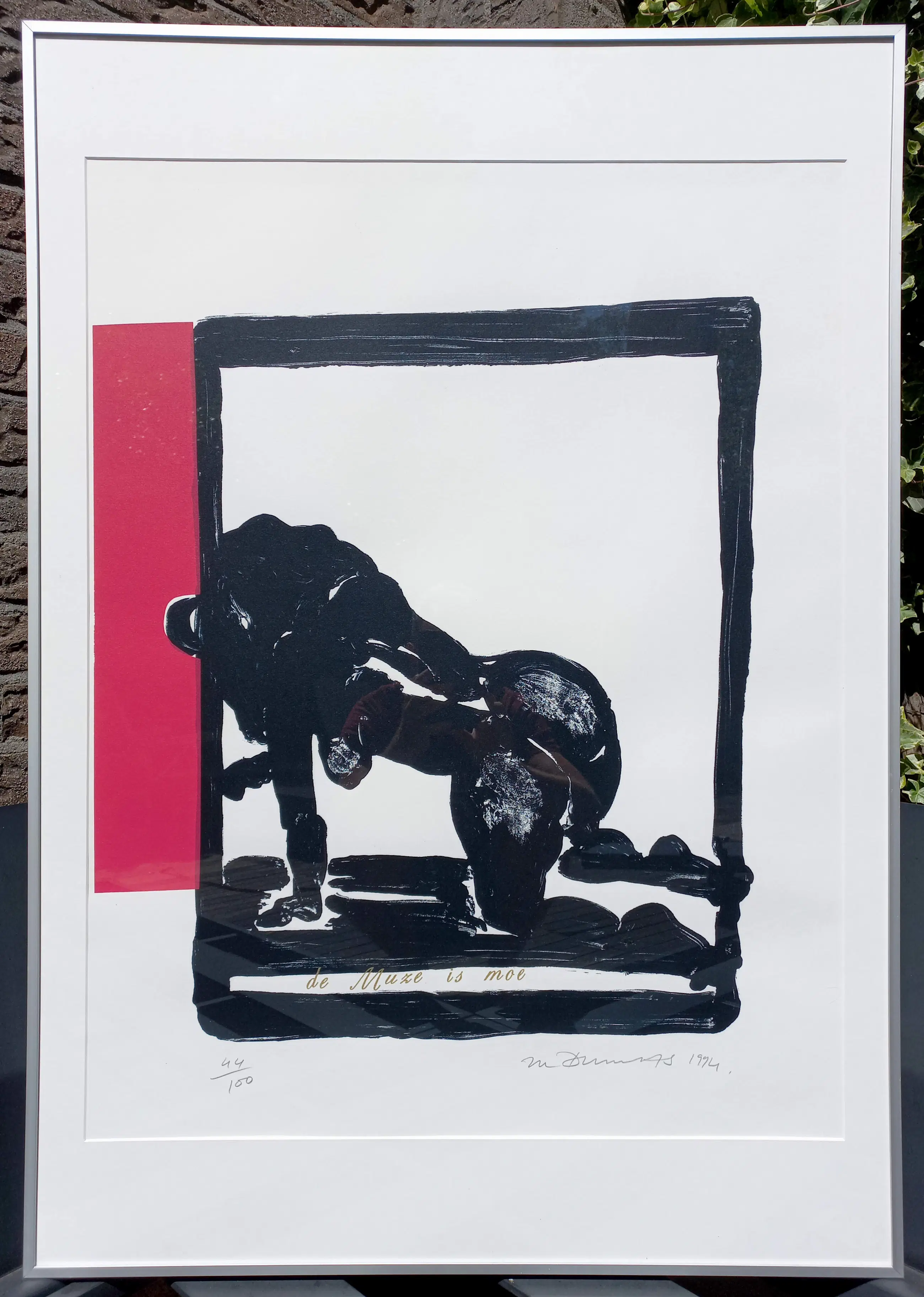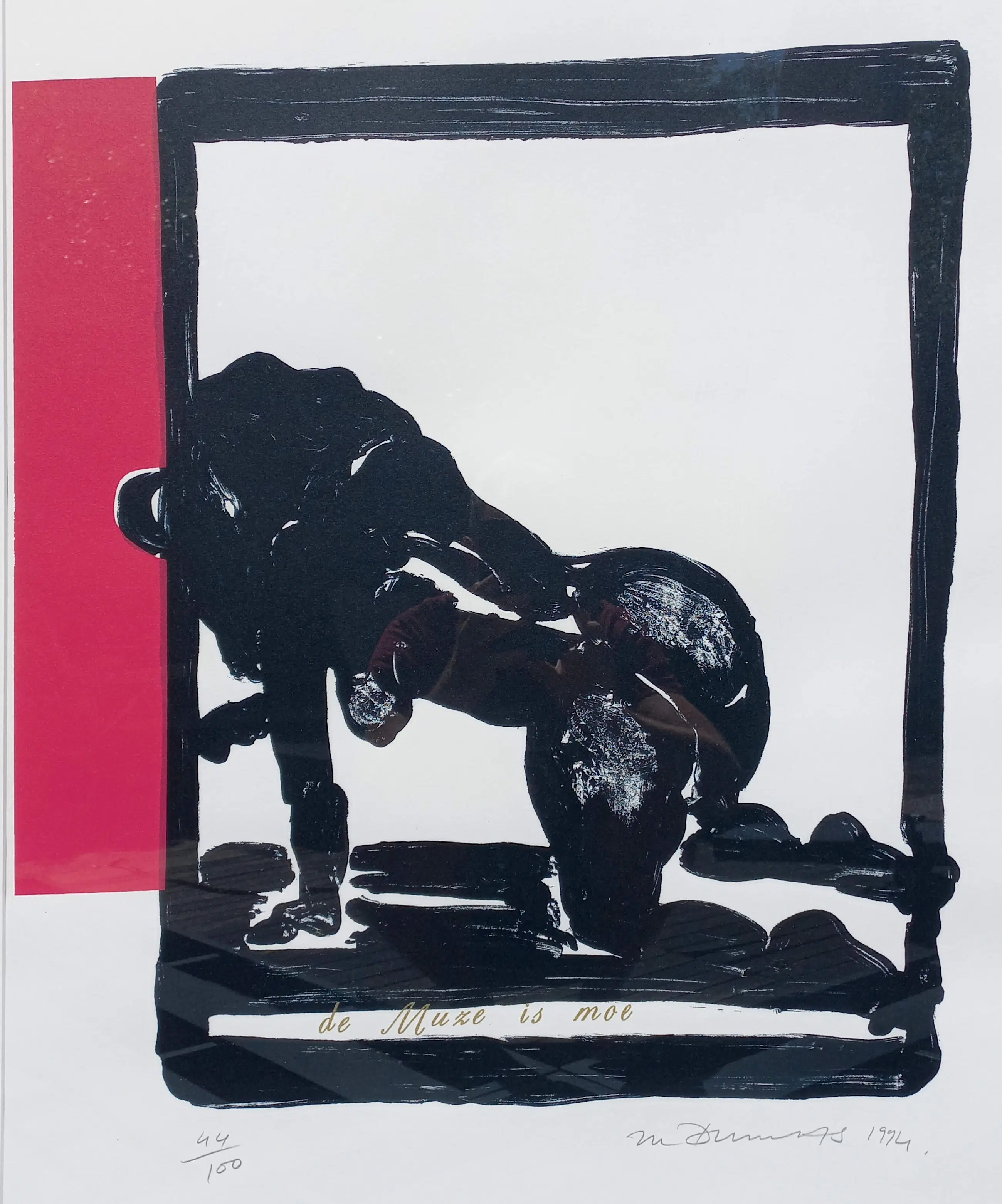 Bekende, grote compositie van Marlene Dumas die heel recent nog in het nieuws was met haar magnum opus Miss January dat bij Christie’s voor een record geveild werd (13,6 miljoen USD). De hoogste opbrengst ooit voor een werk van een kunstenares bij leven.
