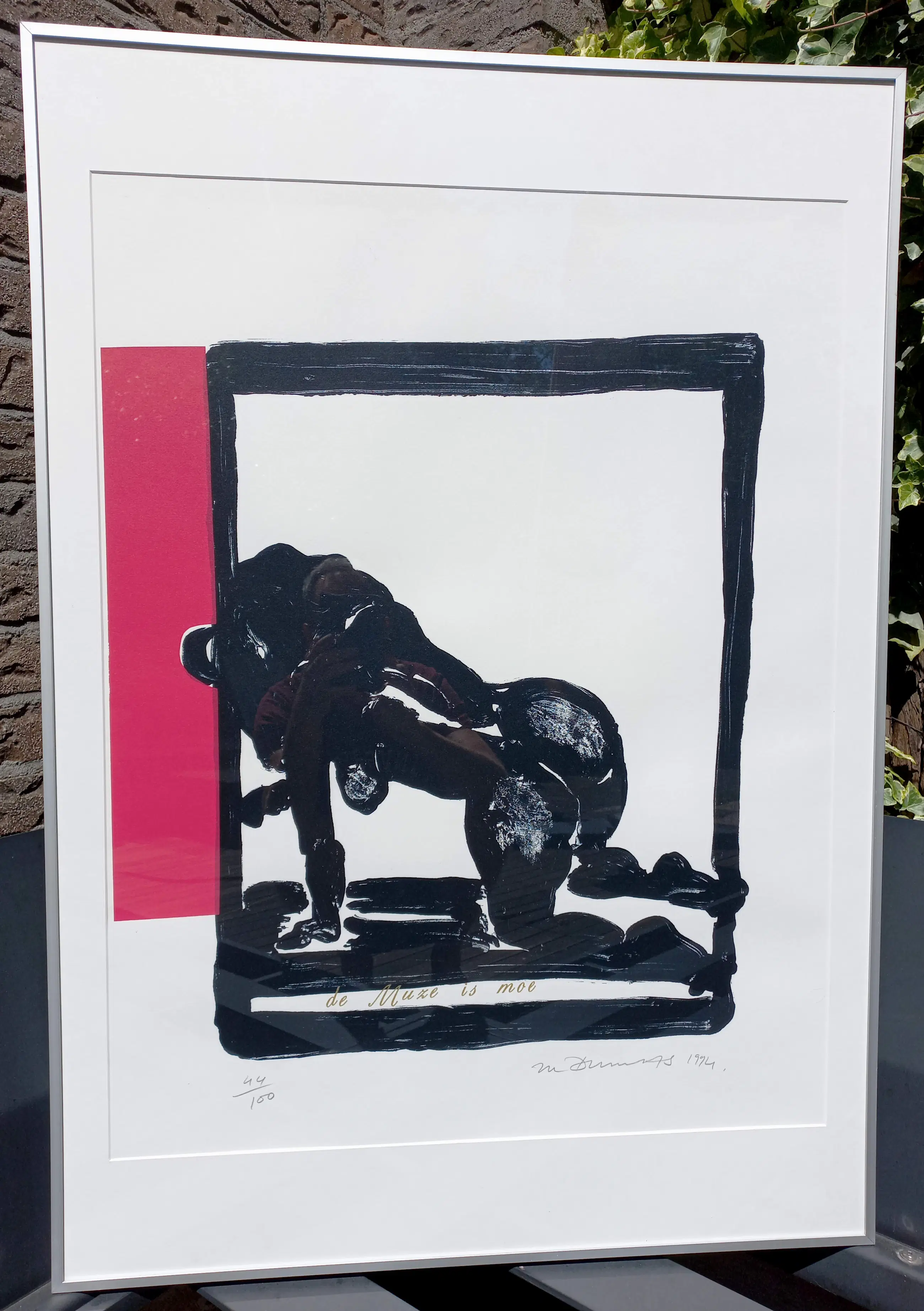 Zeefdruk op Rives papier, met potlood gesigneerd, gedateerd (1994) en genummerd (44/100) en getiteld in de druk. In strakke, aluminium lijst, achter glas en met smetteloos, zuurvrij passe-partout. Alles in uitstekende conditie. (Eventuele vlekjes of verkleuringen die u ziet op de foto's zijn reflecties in het glas tijdens het fotograferen)