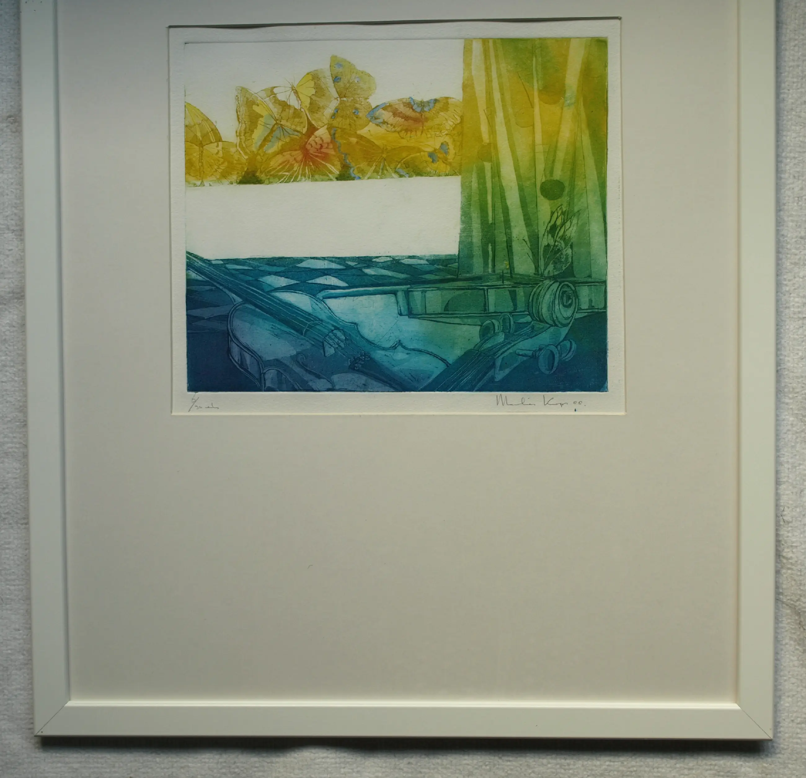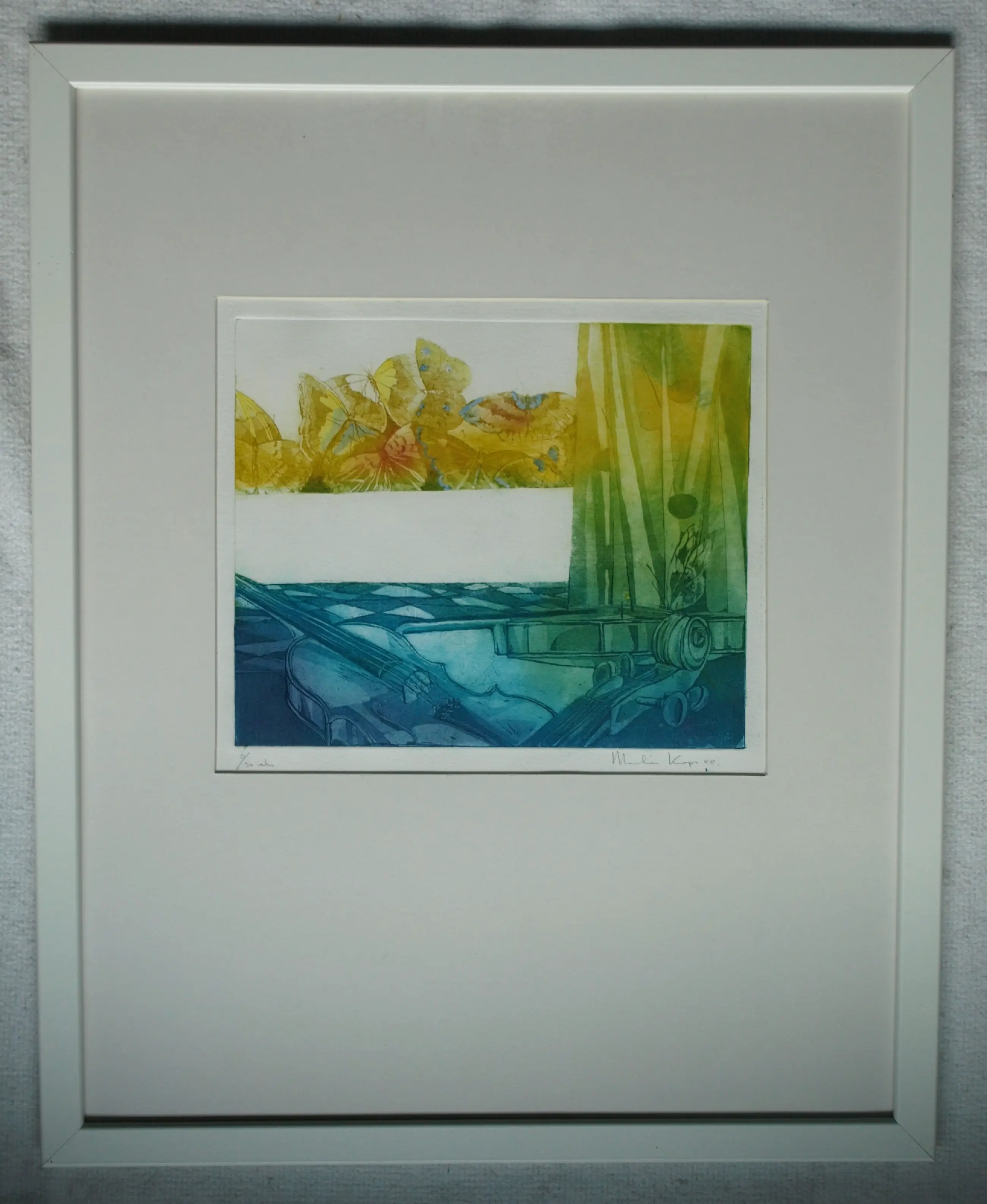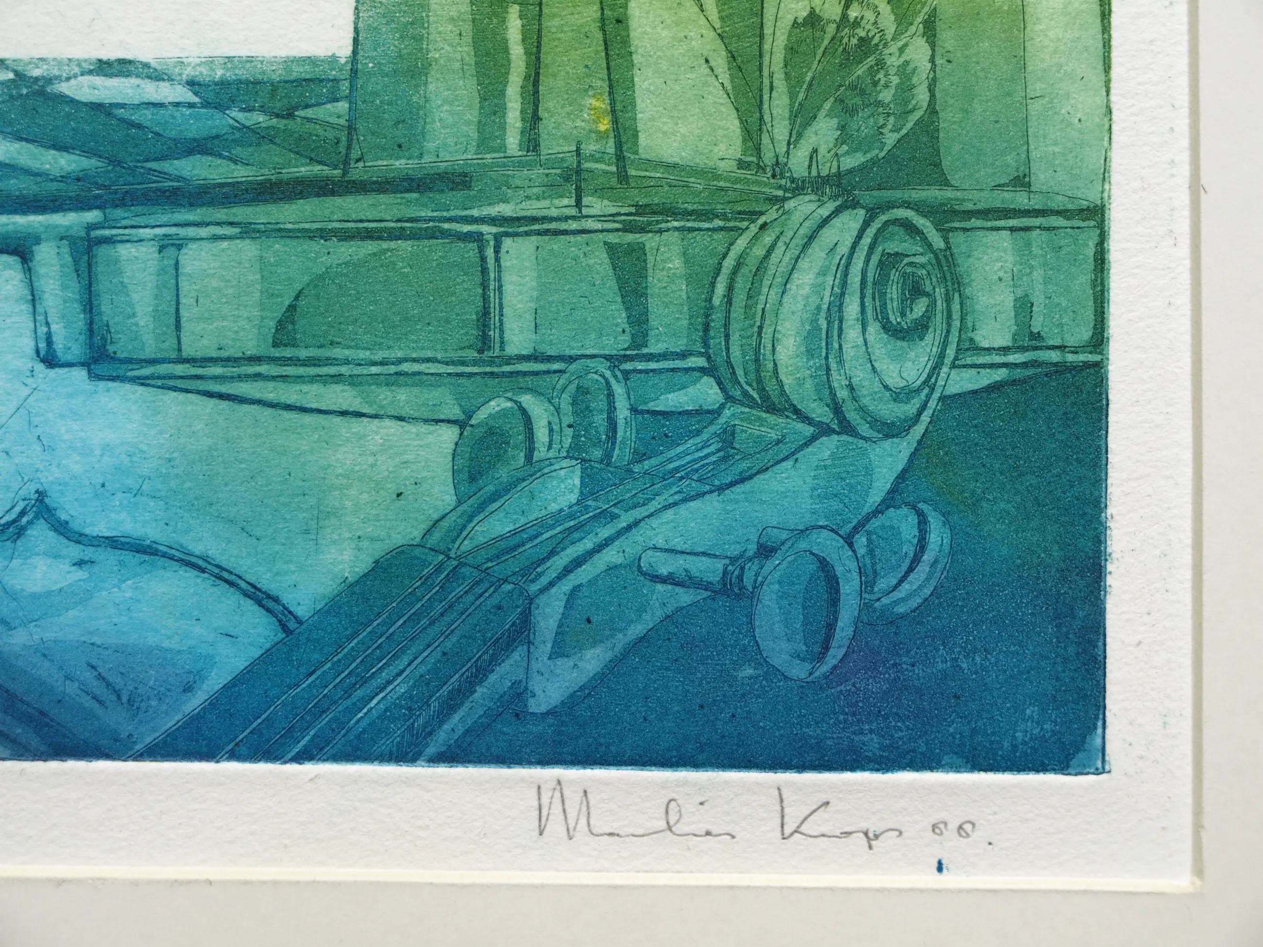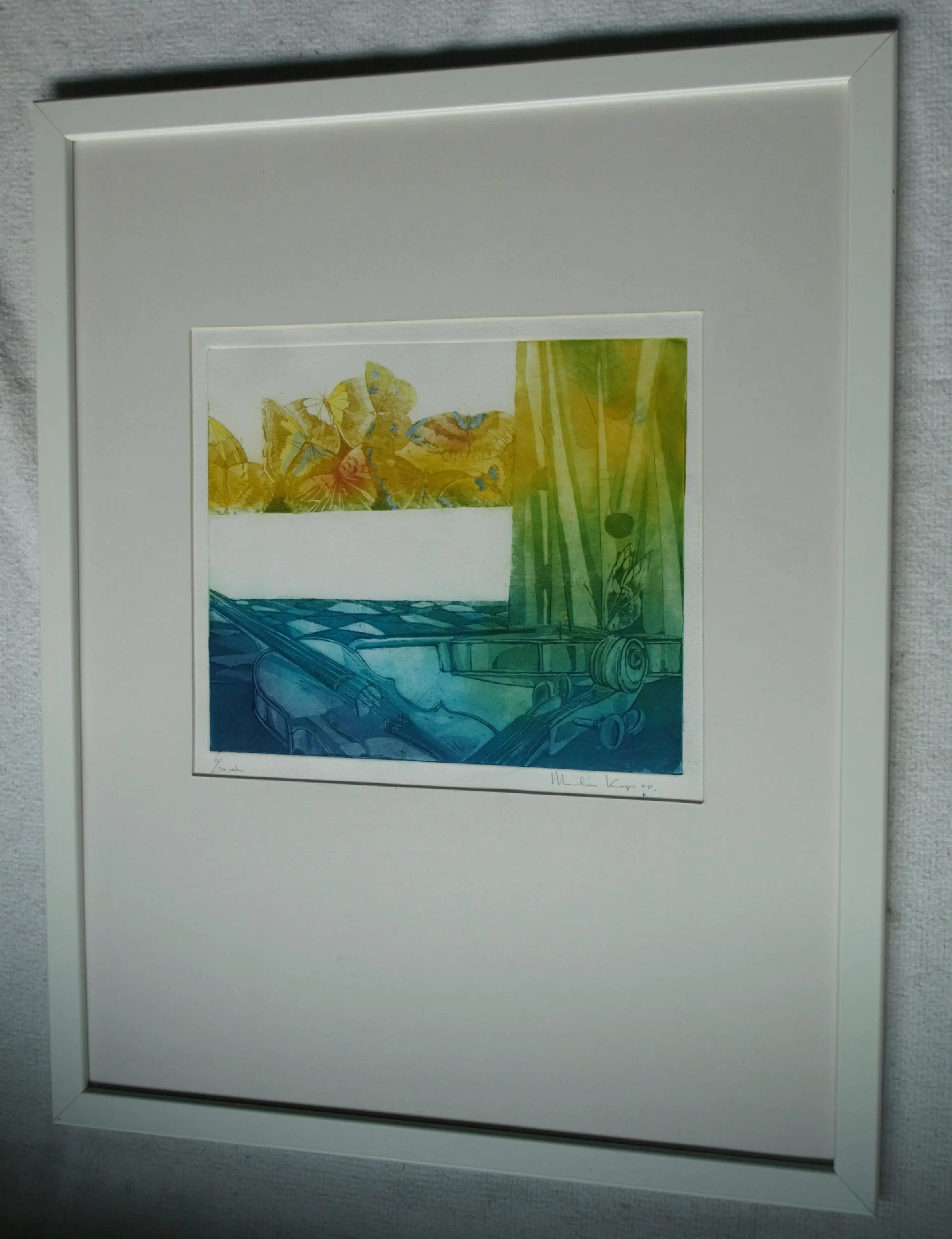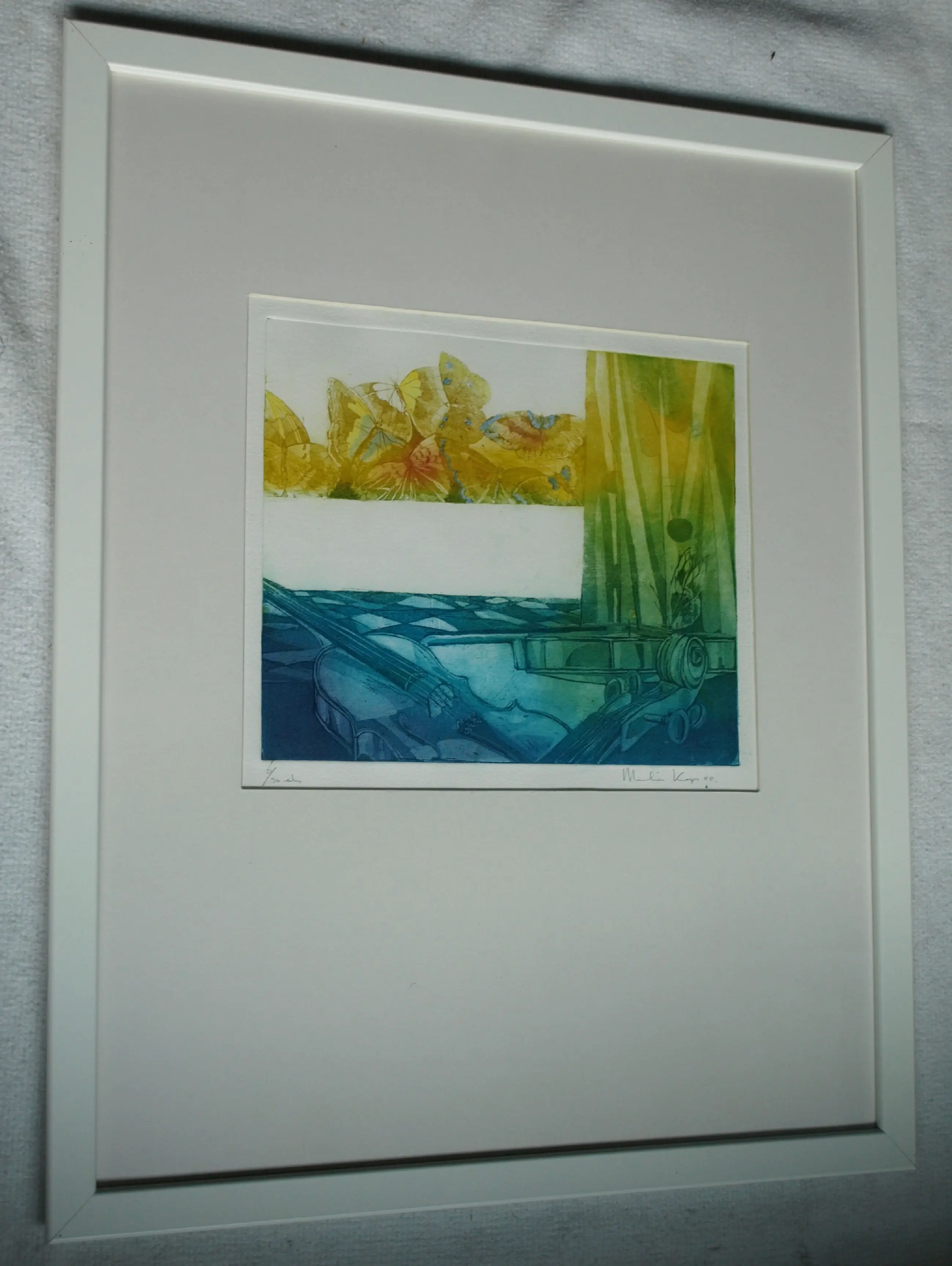 Een ingelijste ets uit 1988 van de Nederlandse / Limburgse kunstenares Marlies Knops (1950). -Handgesigneerd, -gedateerd en -genummerd met potlood. Nr. 6 van een oplage van 30. -Ingelijst in een eenvoudige witte kunststof lijst met passe-partout en plexiglasplaat. -Afmetingen: Lijst, 53½ x 43½ x 1 cm. Beeld / ets, 20 x 24½ cm. -Herkomst: Uit een inboedel. -Conditie: In zeer goede staat. Zie ook alle foto’s. Kan zo aan de muur.