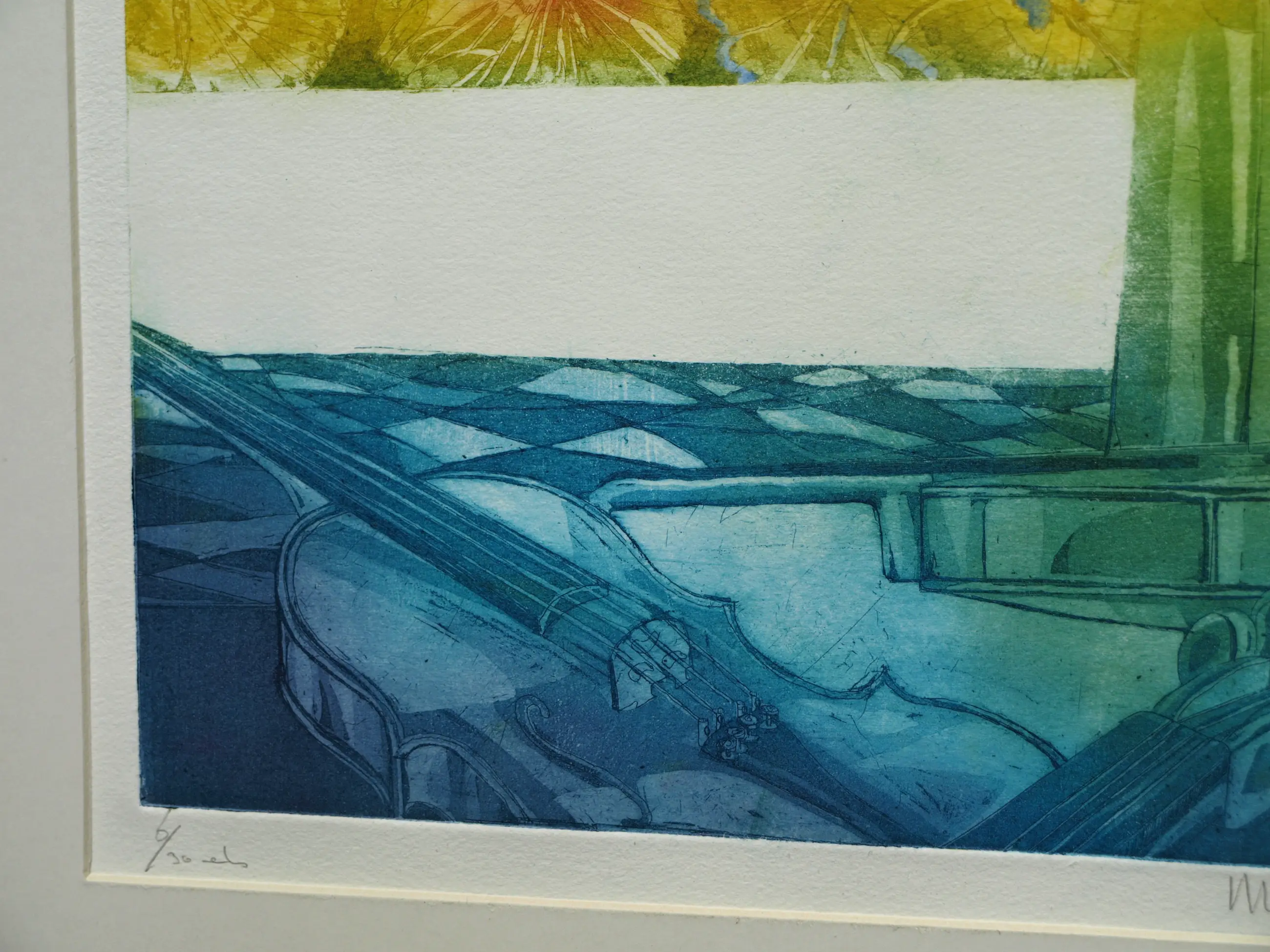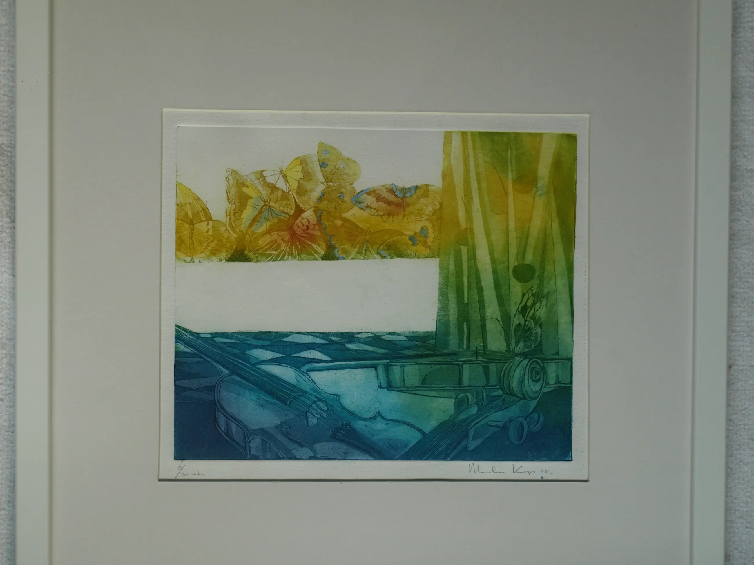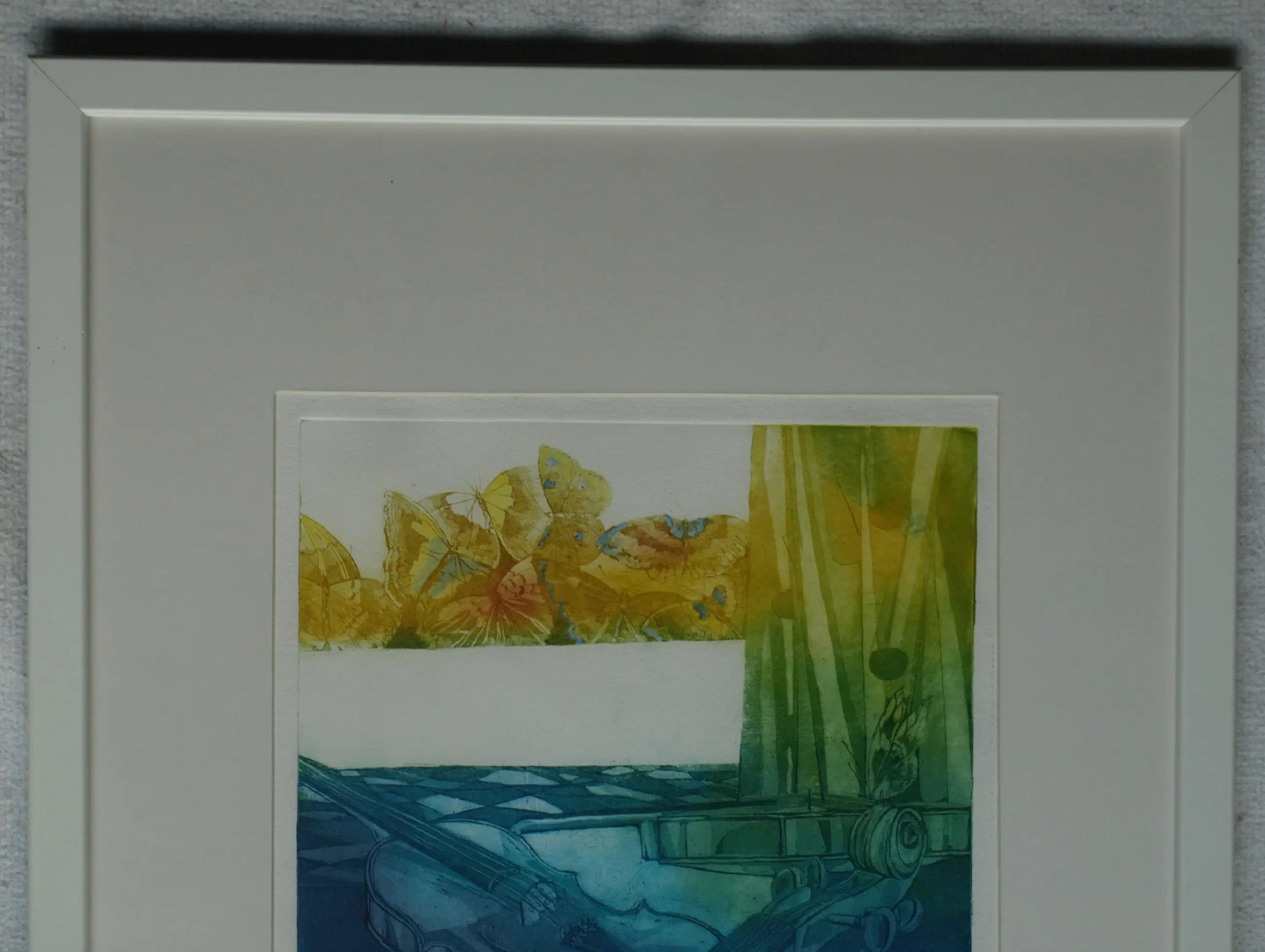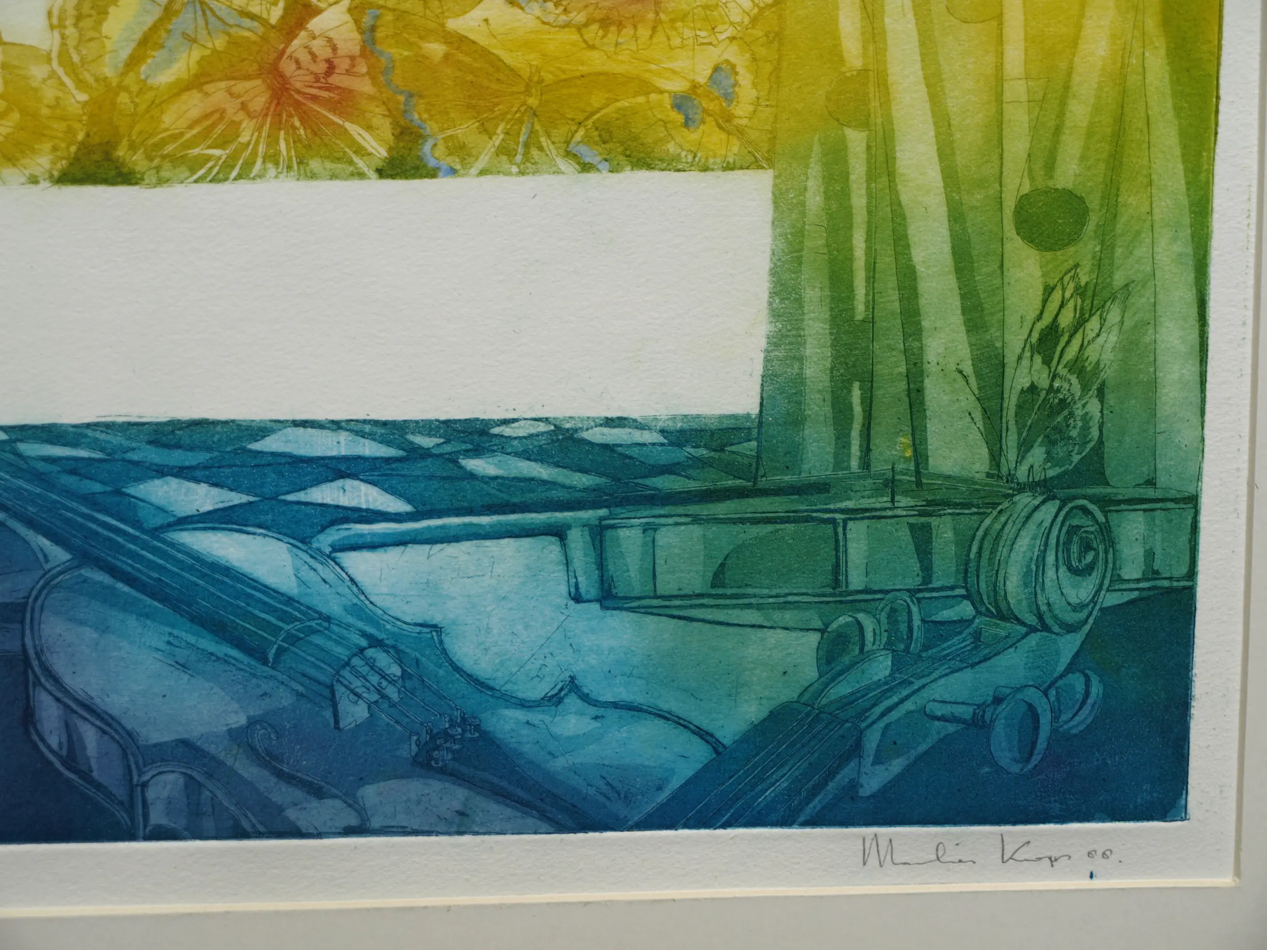 Een ingelijste ets uit 1988 van de Nederlandse / Limburgse kunstenares Marlies Knops (1950). -Handgesigneerd, -gedateerd en -genummerd met potlood. Nr. 6 van een oplage van 30. -Ingelijst in een eenvoudige witte kunststof lijst met passe-partout en plexiglasplaat. -Afmetingen: Lijst, 53½ x 43½ x 1 cm. Beeld / ets, 20 x 24½ cm. -Herkomst: Uit een inboedel. -Conditie: In zeer goede staat. Zie ook alle foto’s. Kan zo aan de muur.