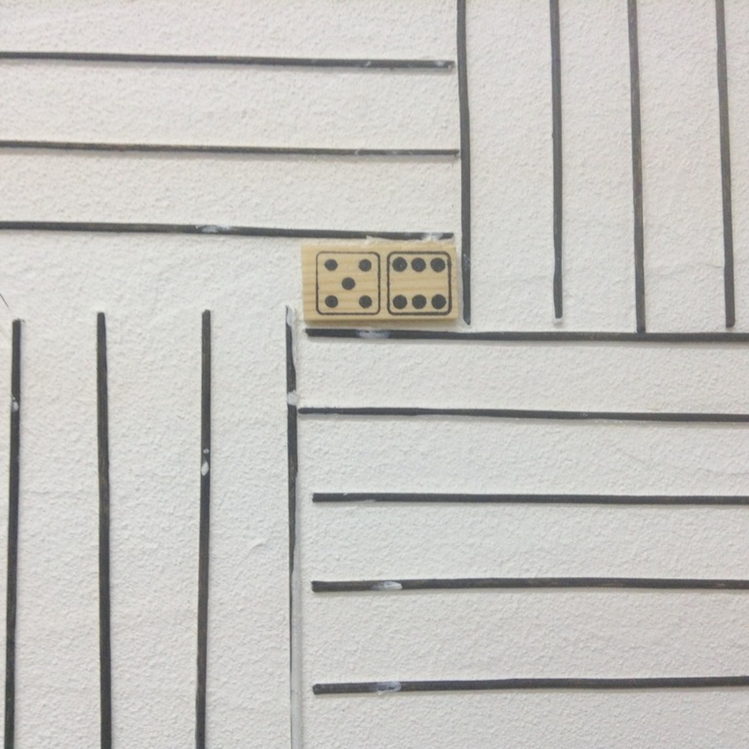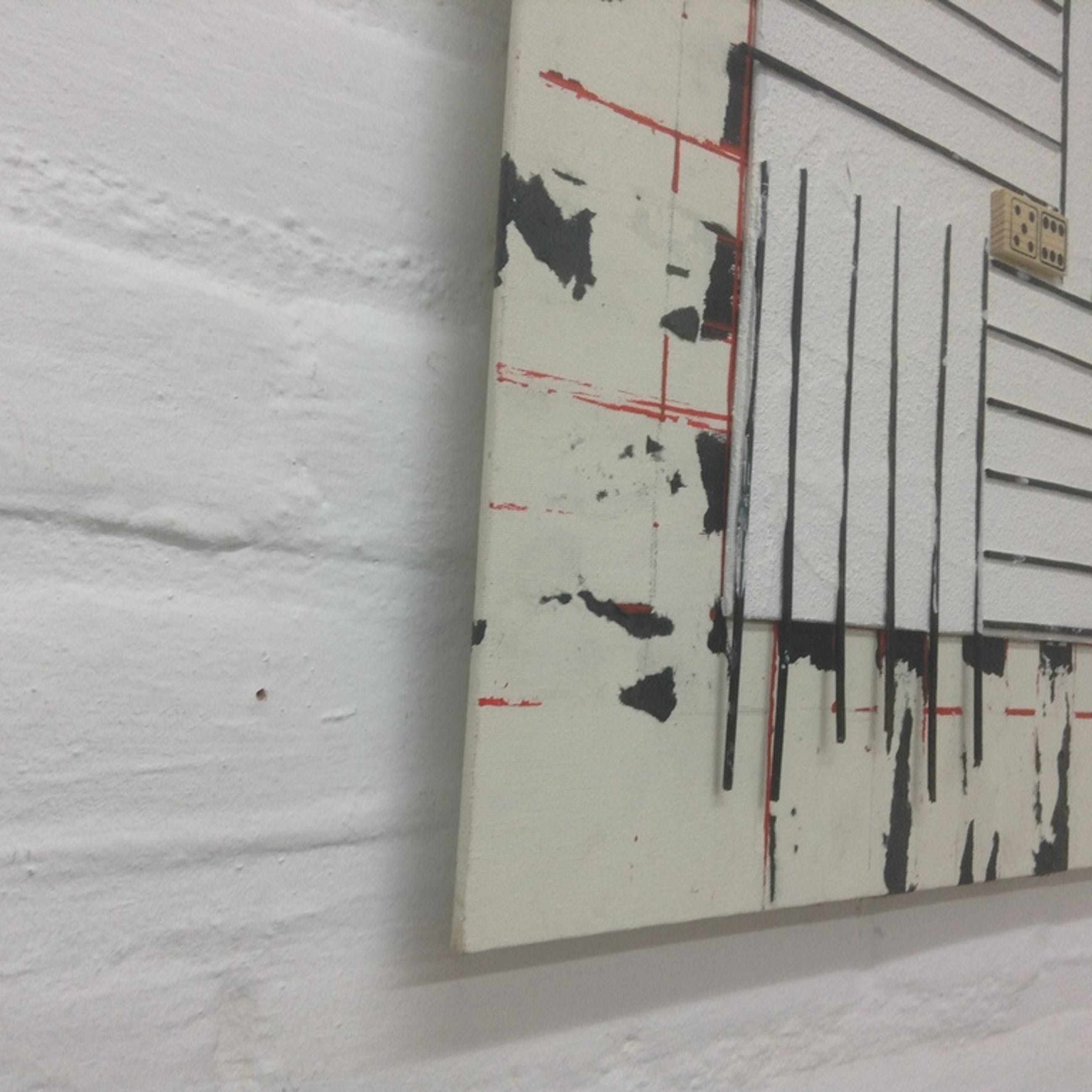 een uniek werk, mer reliëf, 40 x40 x 4 cm. Het werk komt van de wand, door ophoging aan de achterzijde. Diverse schildertechnieken, zwarte lijnen zijn ronde stokjes, en gedrukt in spierwitte ondergrond 20 x 20 cm. Deze plaat is bevestigd op de crèmekleurige onderste plaat.40 x 40 cm