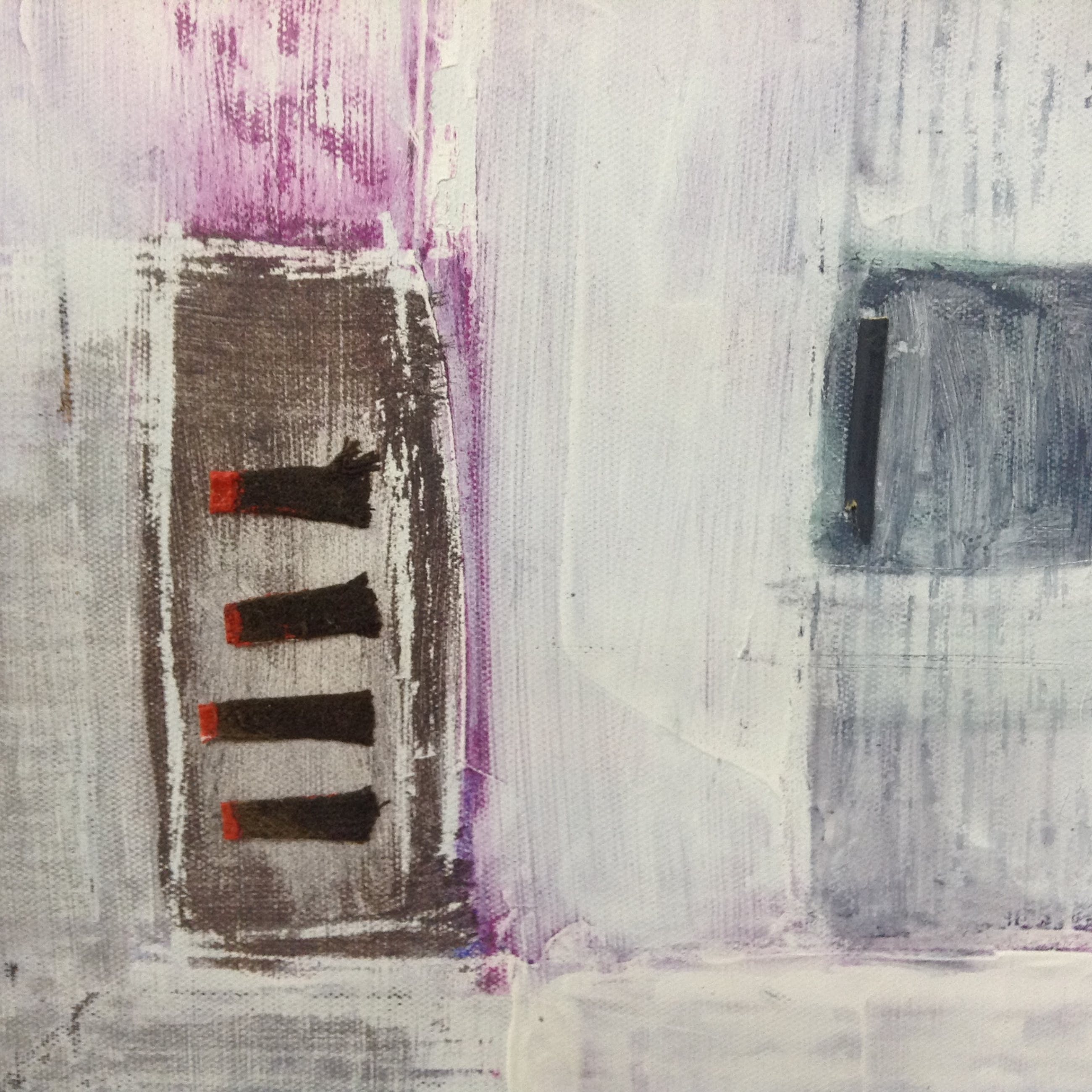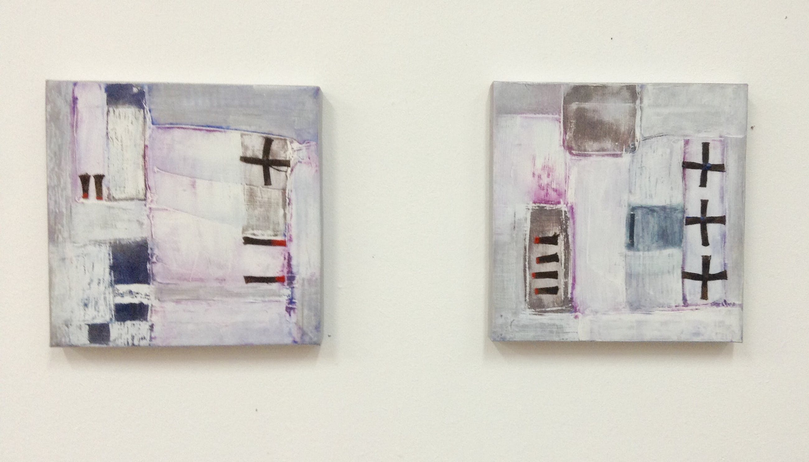 Twee kleine schilderijtjes, met applicaties ( kruisen en bruine strips) passen in elk interieur. gesigneerd aan de achterkant