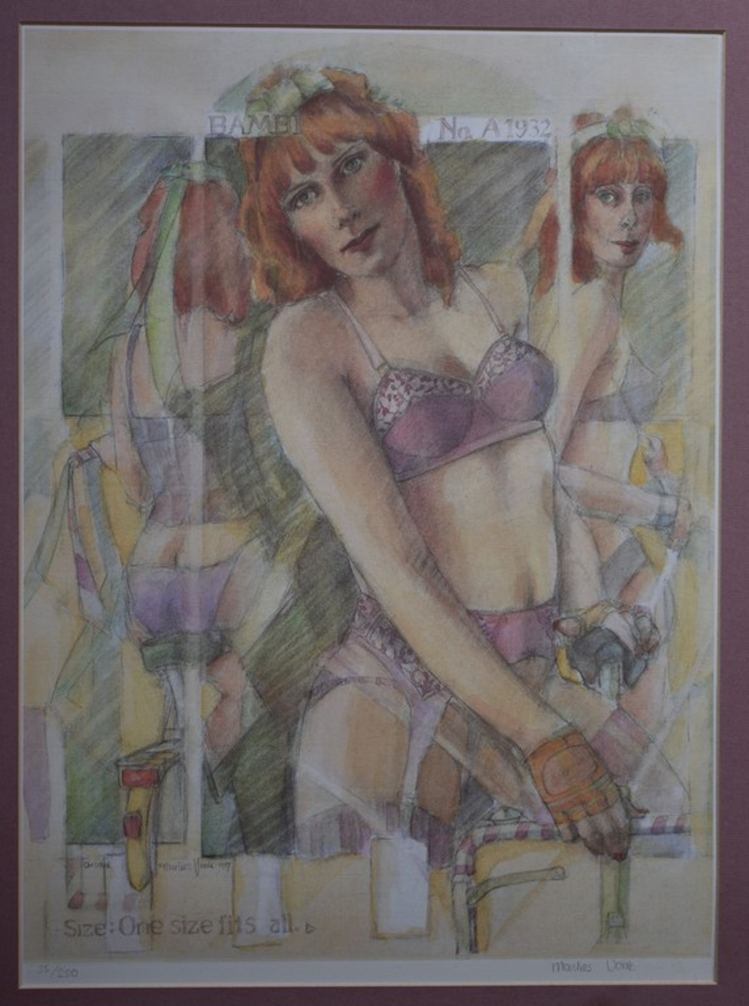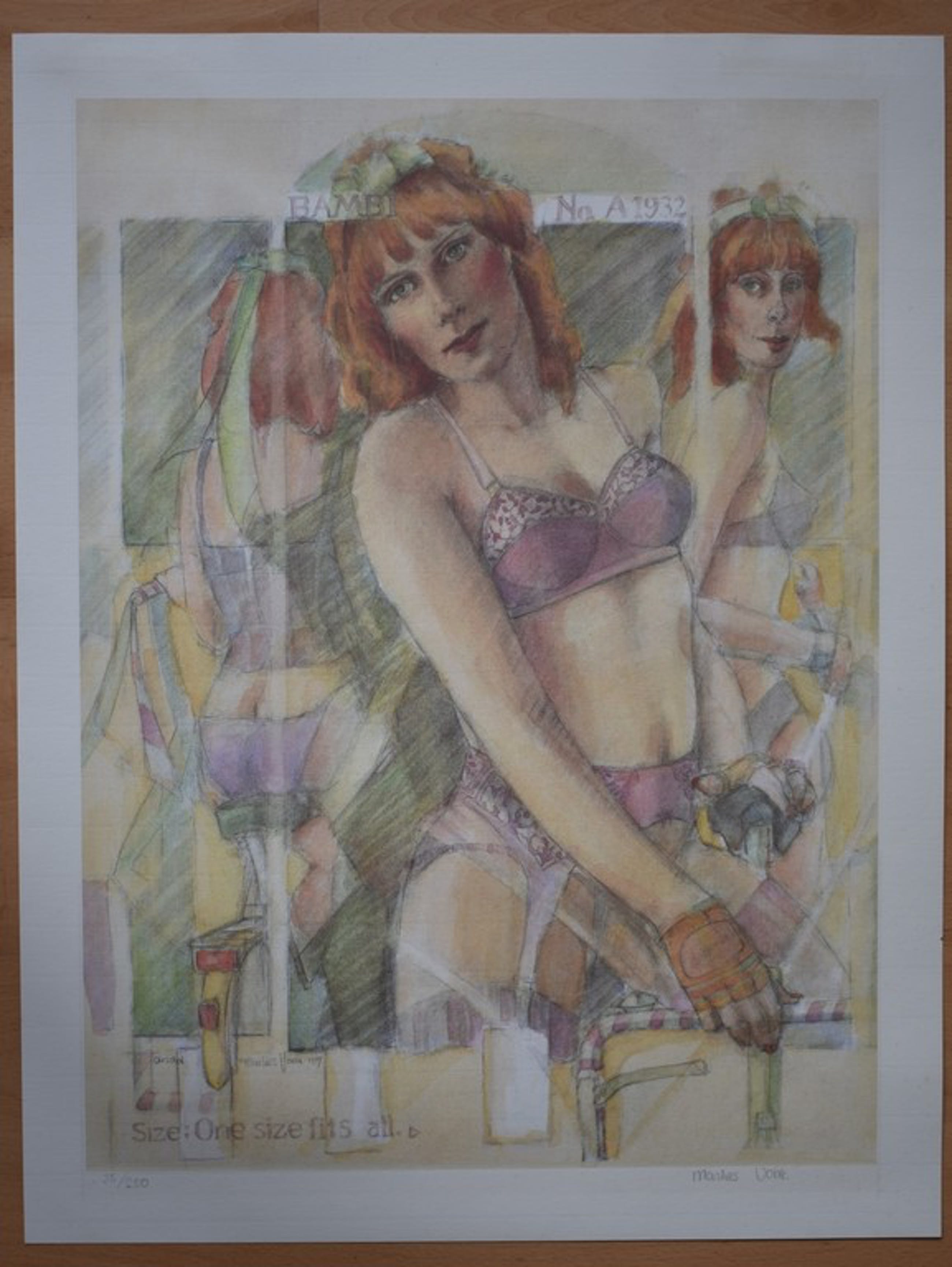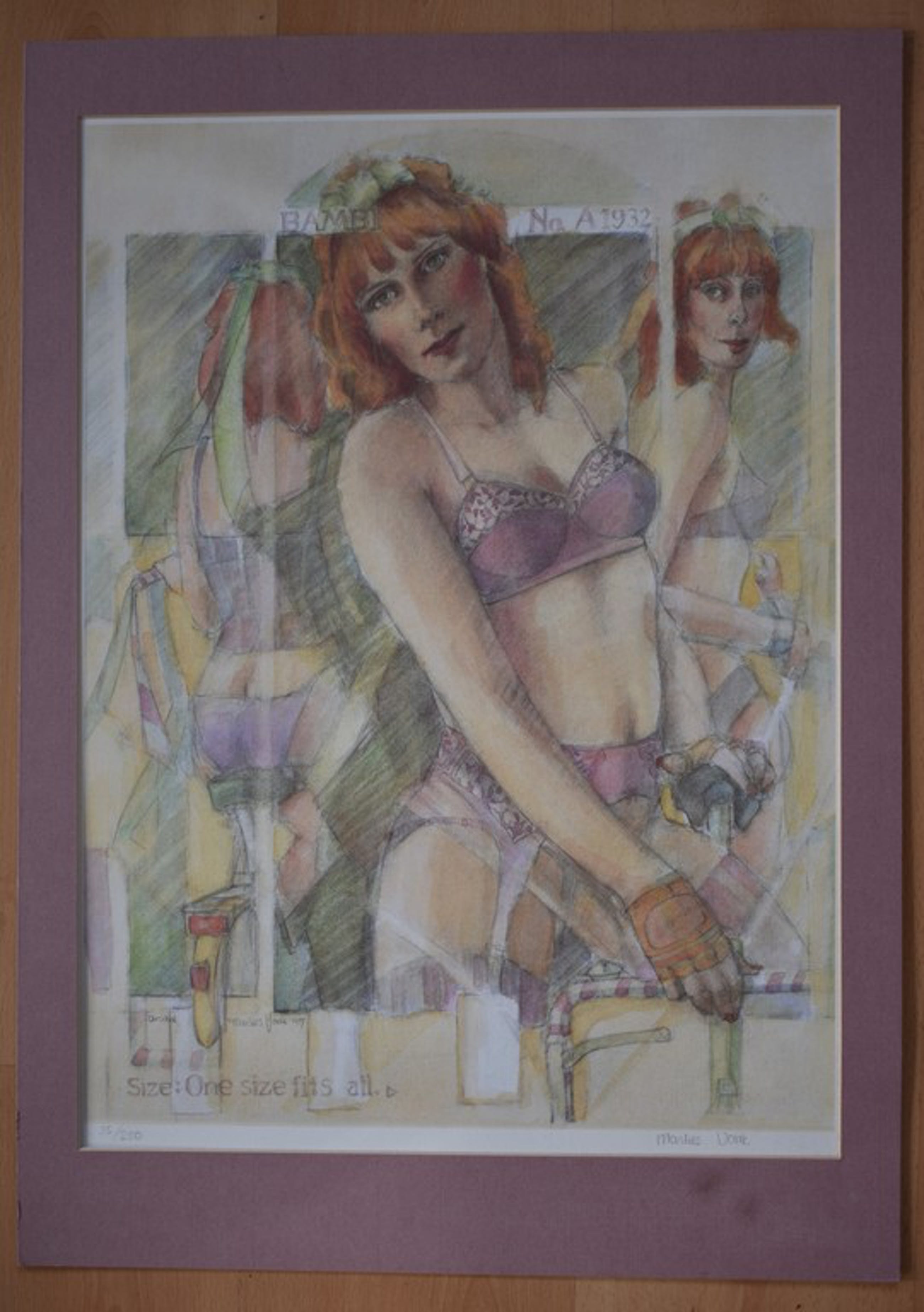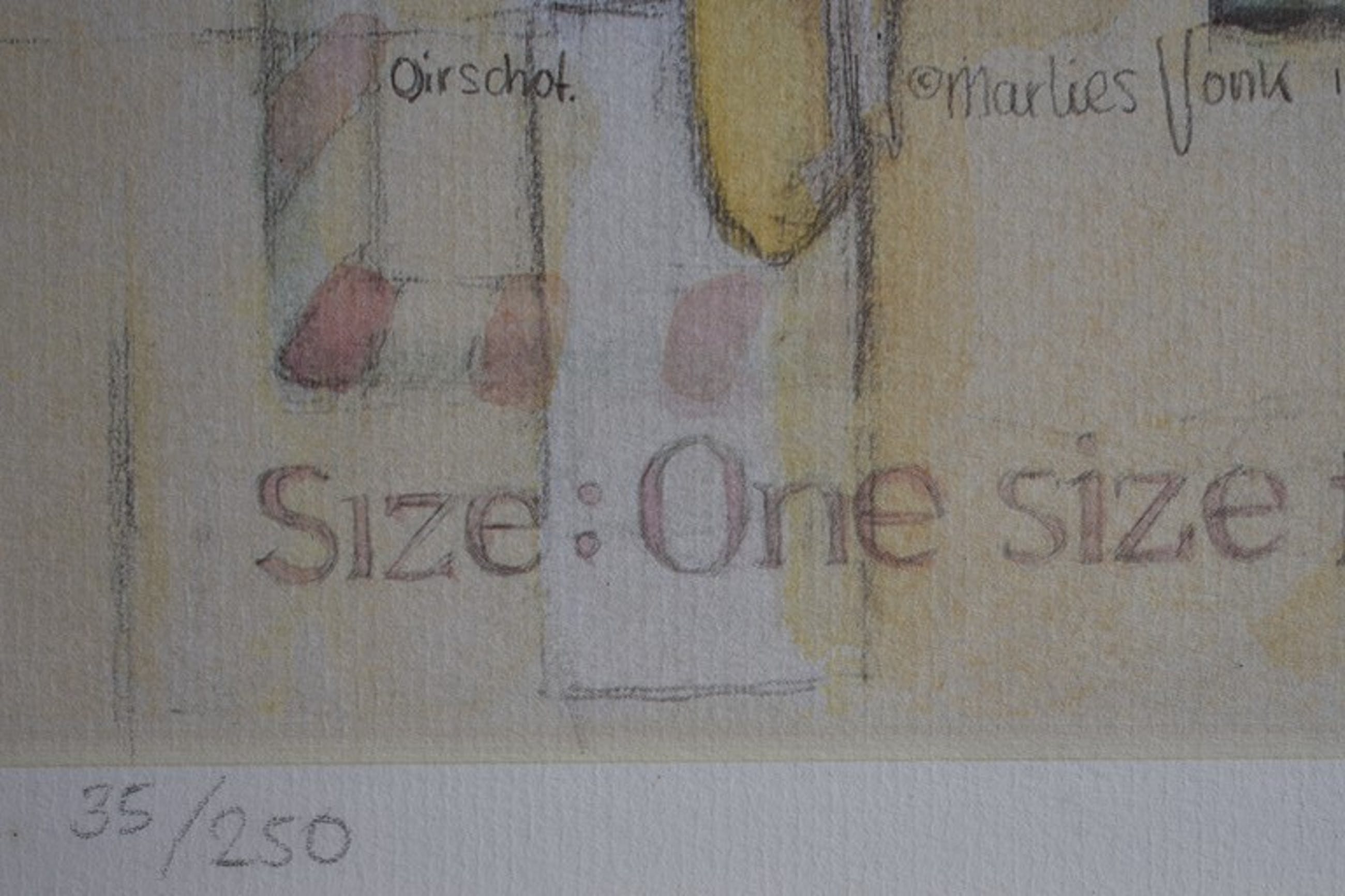 Marlies Vonk haar repertoire draait rondom haarhelf en haar vriendinnen. "eerlijk, treffend en soms licht erotisch" Deze litho betreft het laatste. Heel fraaie en treffende voorstelling. De litho is gesigneerd enheeft een beperkte oplage. Maat : 64x50 cm. Papier gestreept watermerk. Het werk kan aangetekend worden verzonden in koker of afgehaald in Heemstede. Alleen dan is er een lila passepartoutje bij.