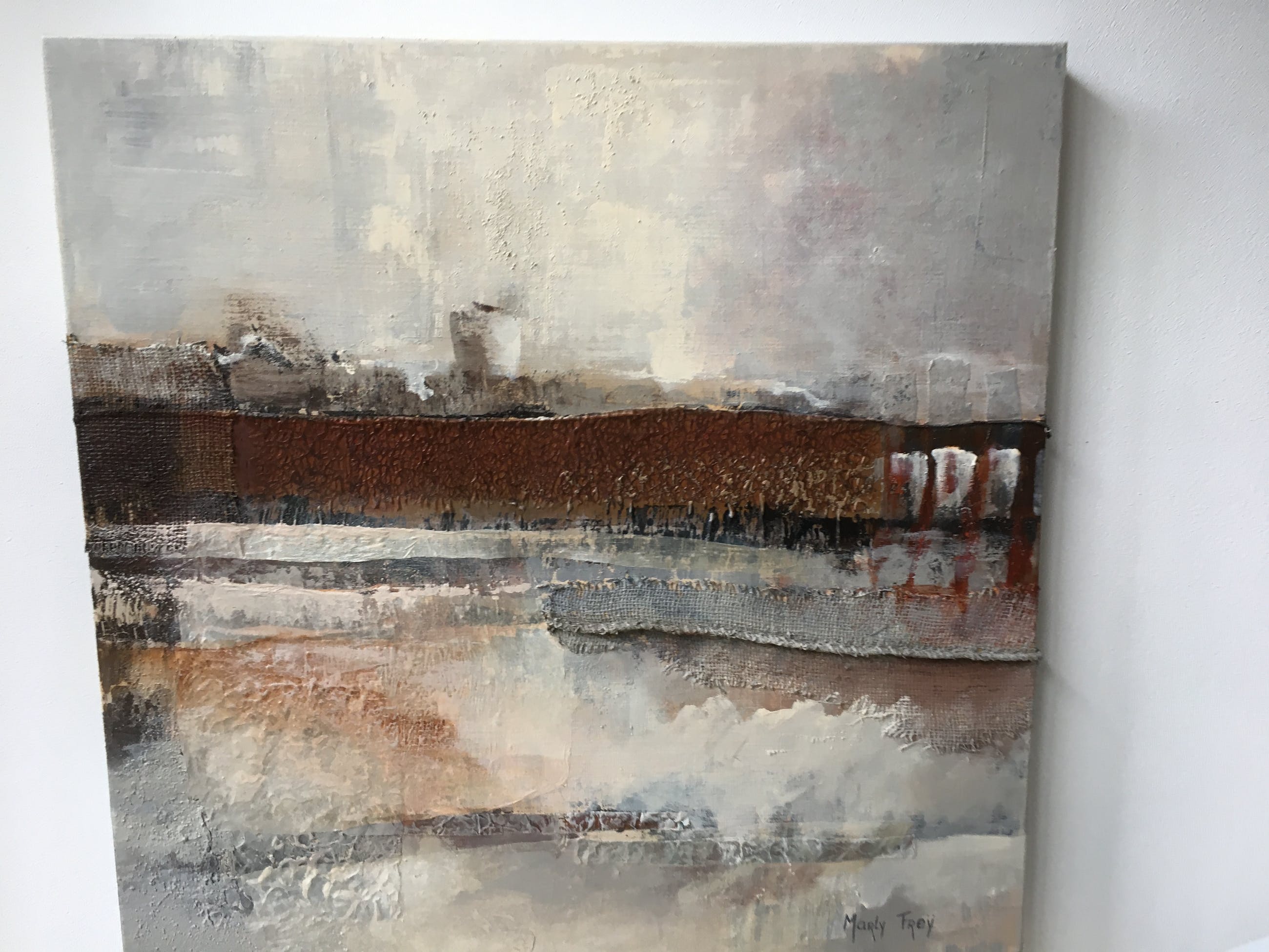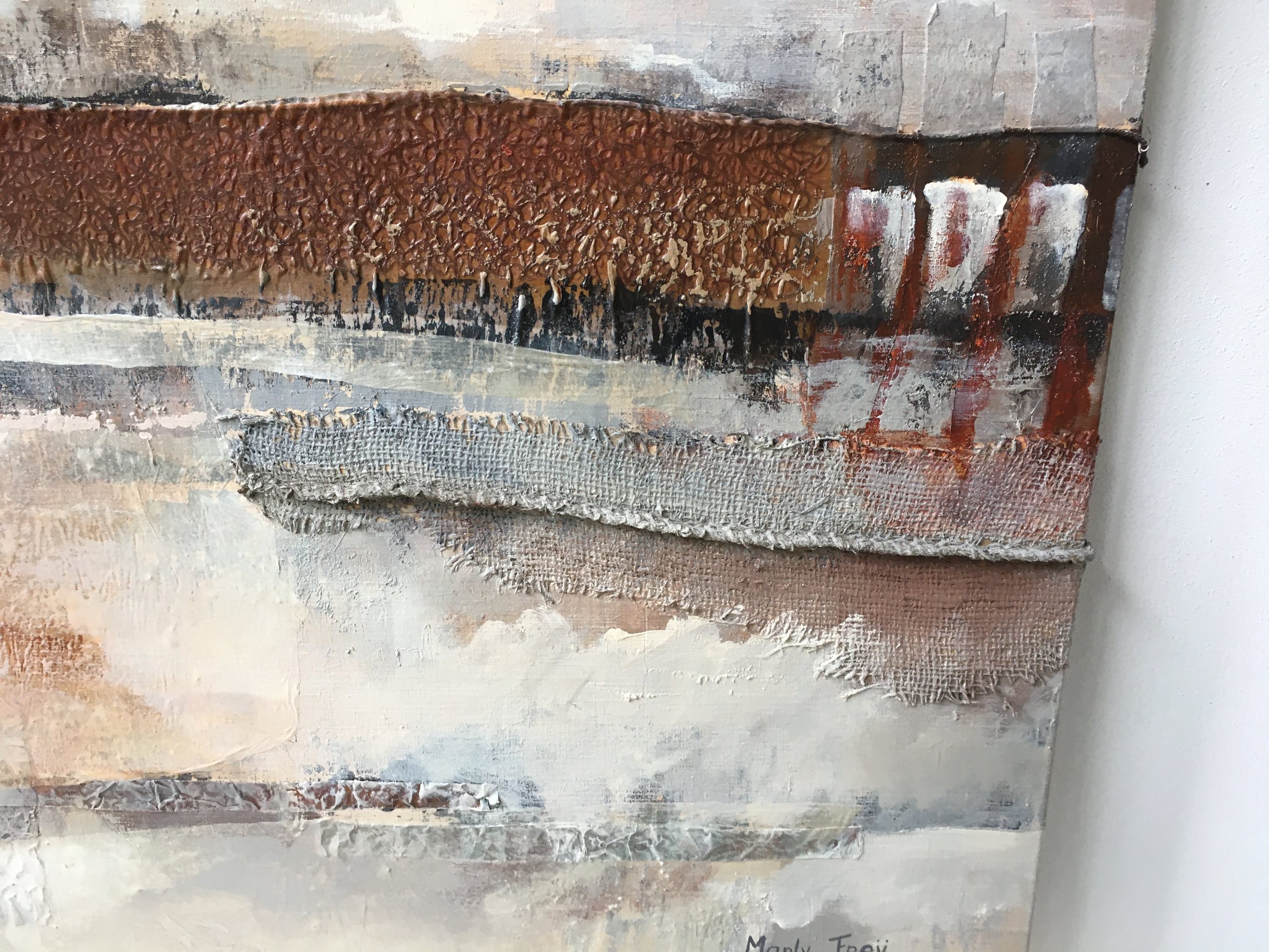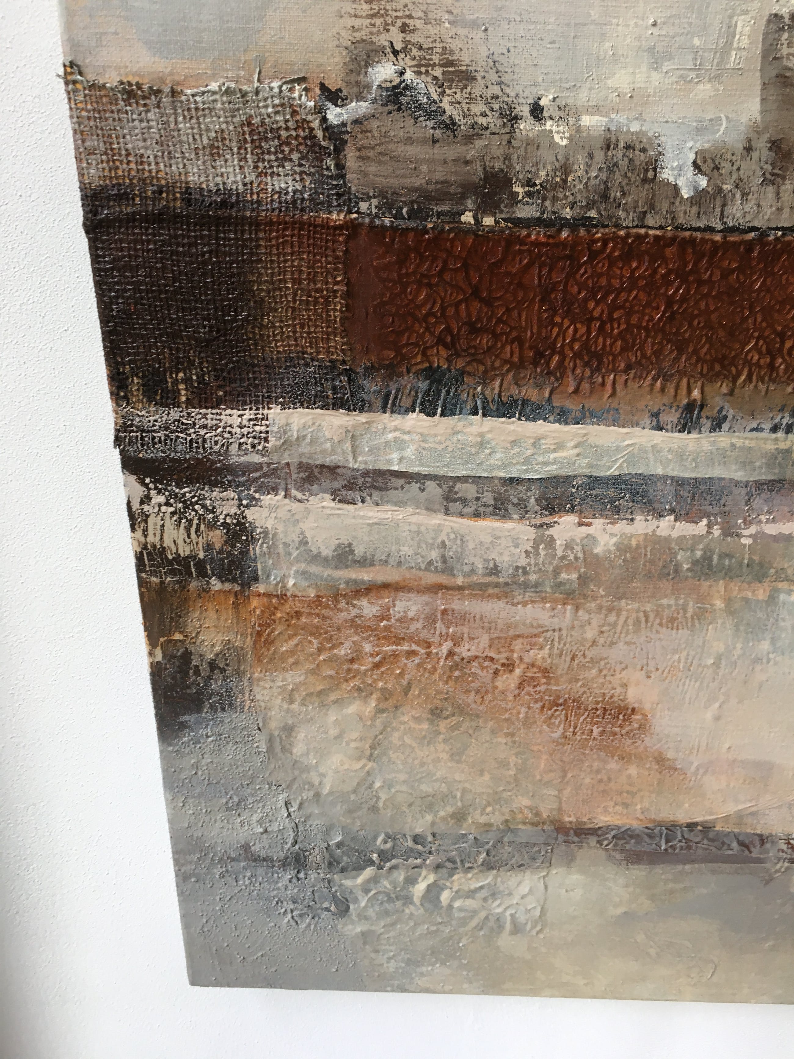 Prachtig materieschilderij in aardse kleuren. Op aluminium spieraam. Zijkanten (5cm) in werk meegenomen. Rechtstreeks van Marly Freij betrokken. Bezorging/afhalen in overleg.
