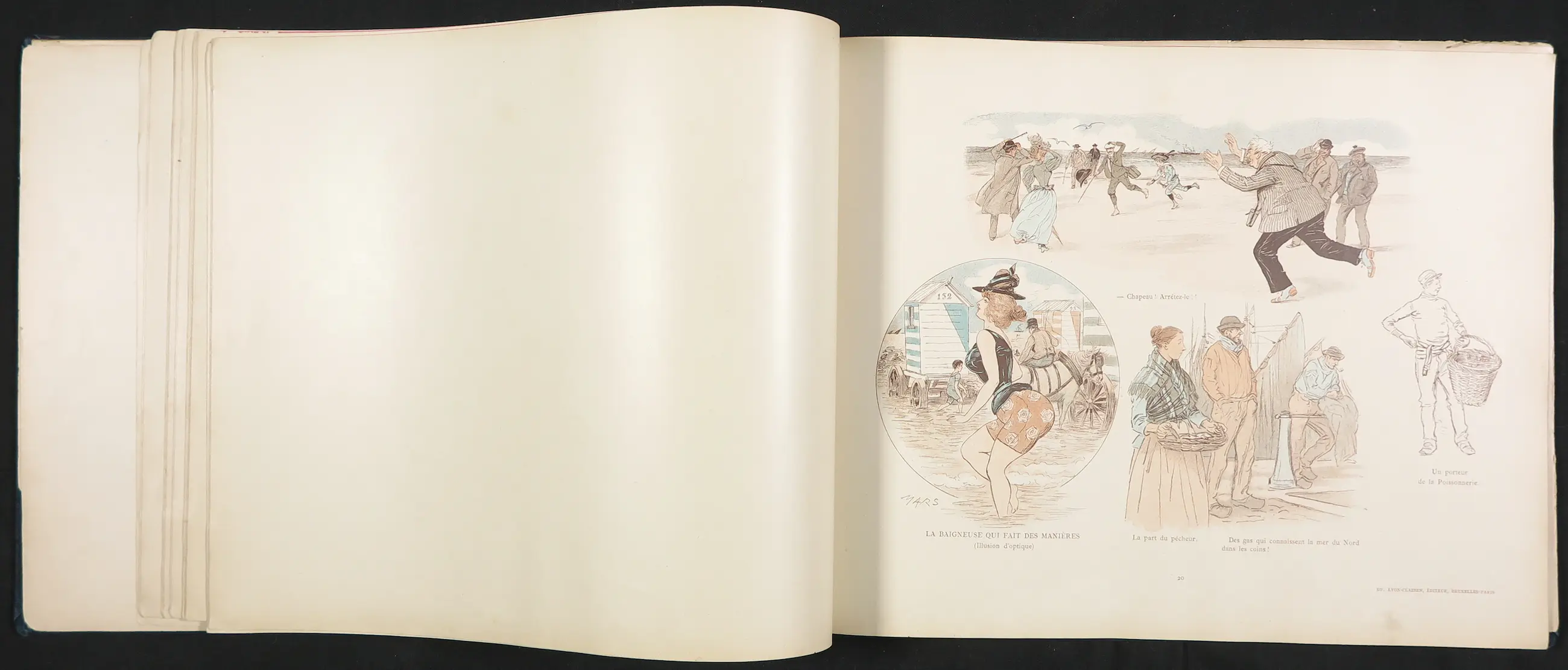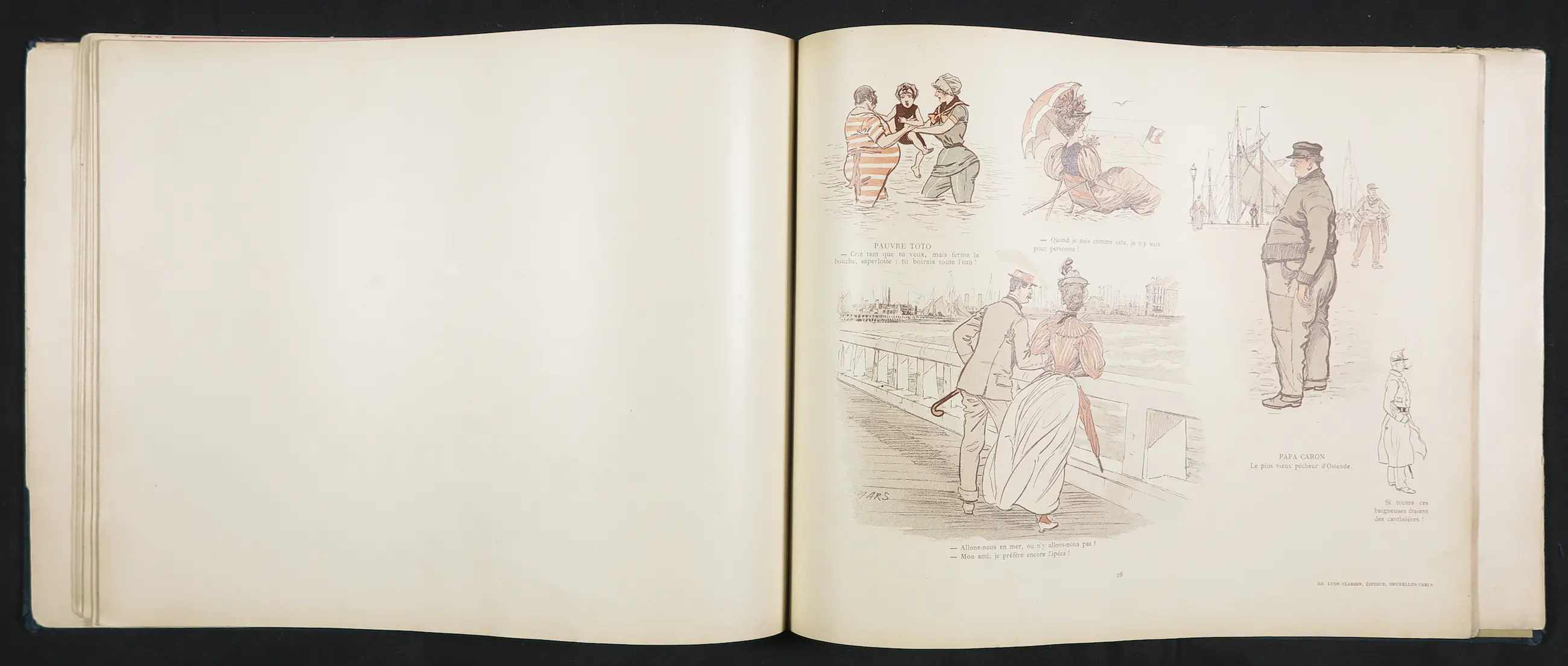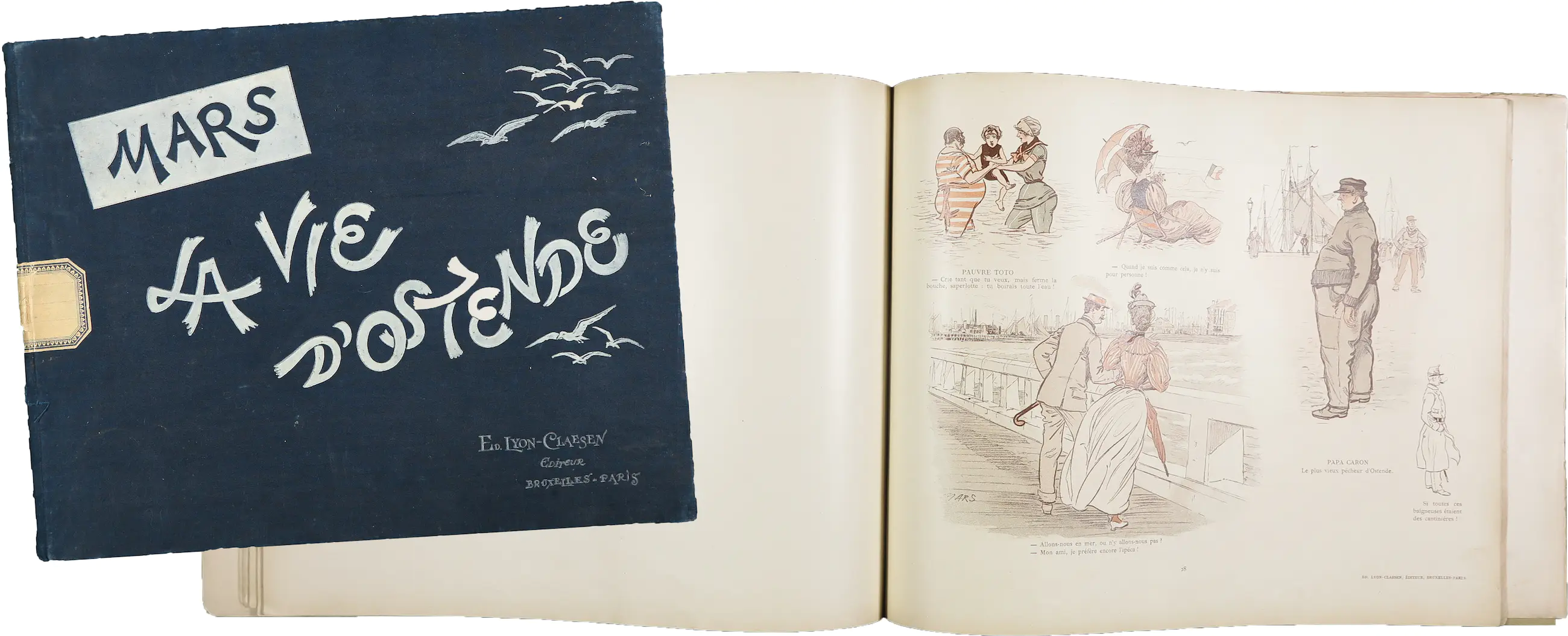 Rijkelijk geïllustreerde uitgave van La vie d'Ostende, voorzien van litho's door Mars (Maurice de Bonvoisin), over het leven in de Belgische kustplaats Oostende. Uitgegeven door Editions Lyons-Clausen (Brussel en Parijs) aan het einde van de 19e eeuw.