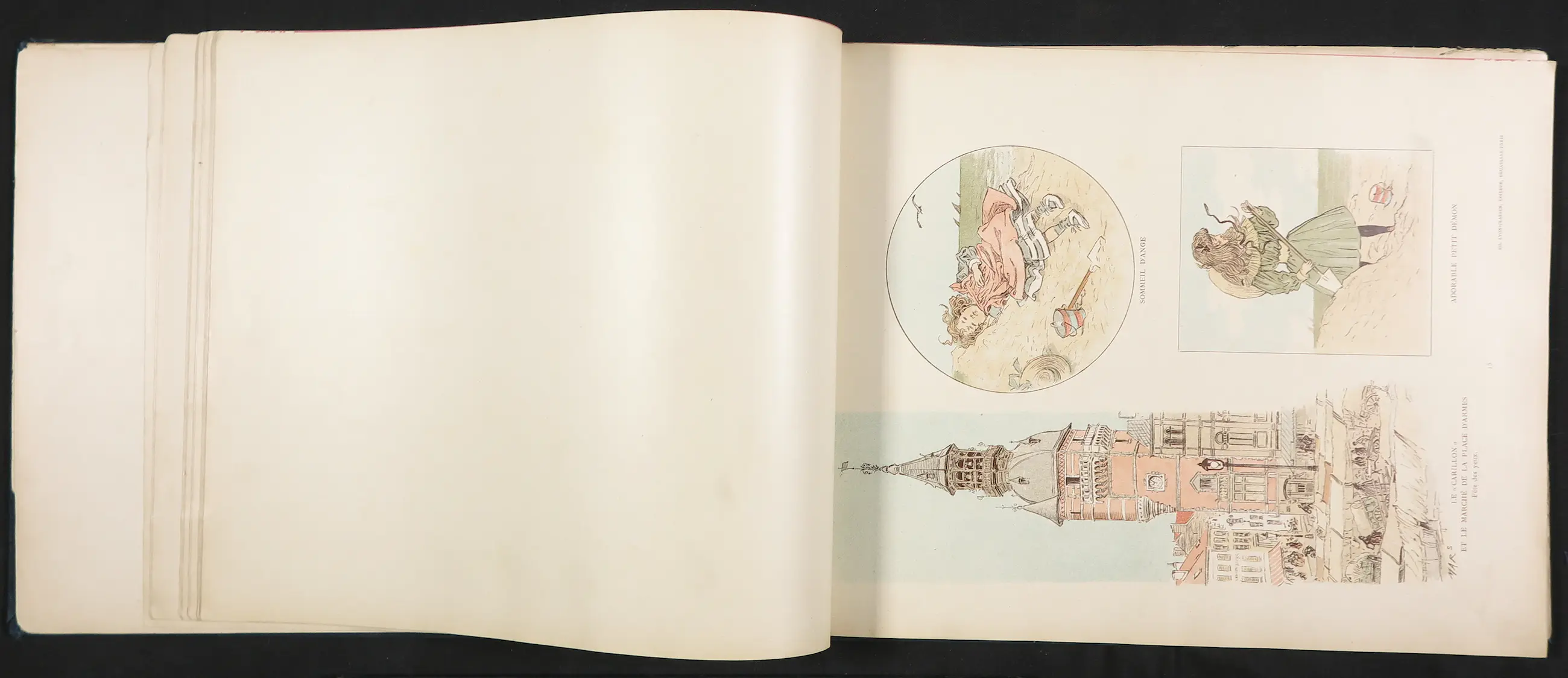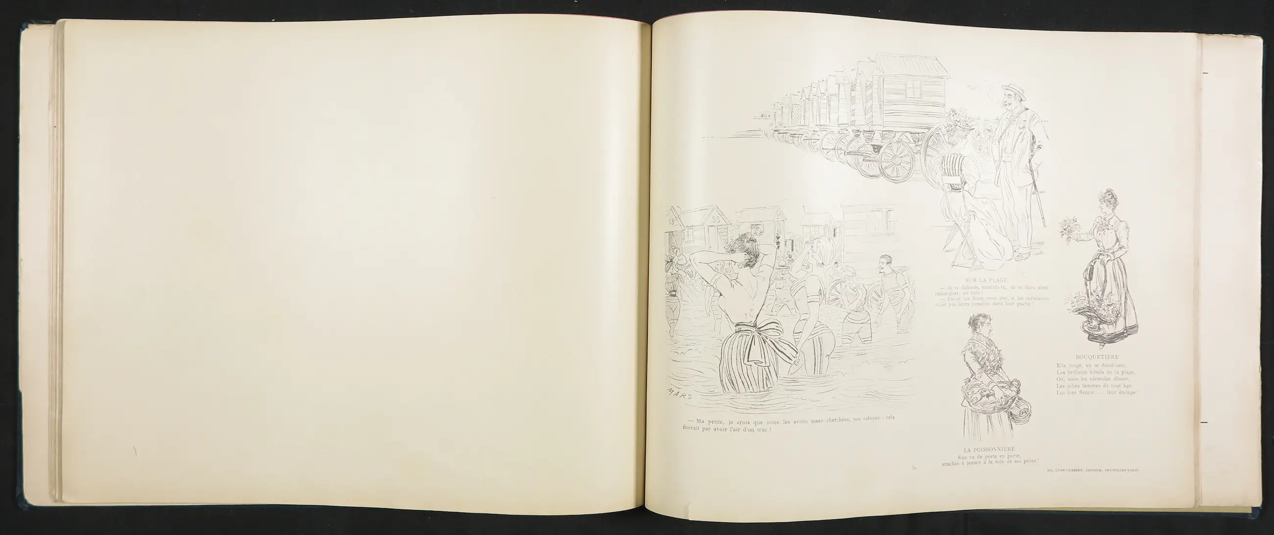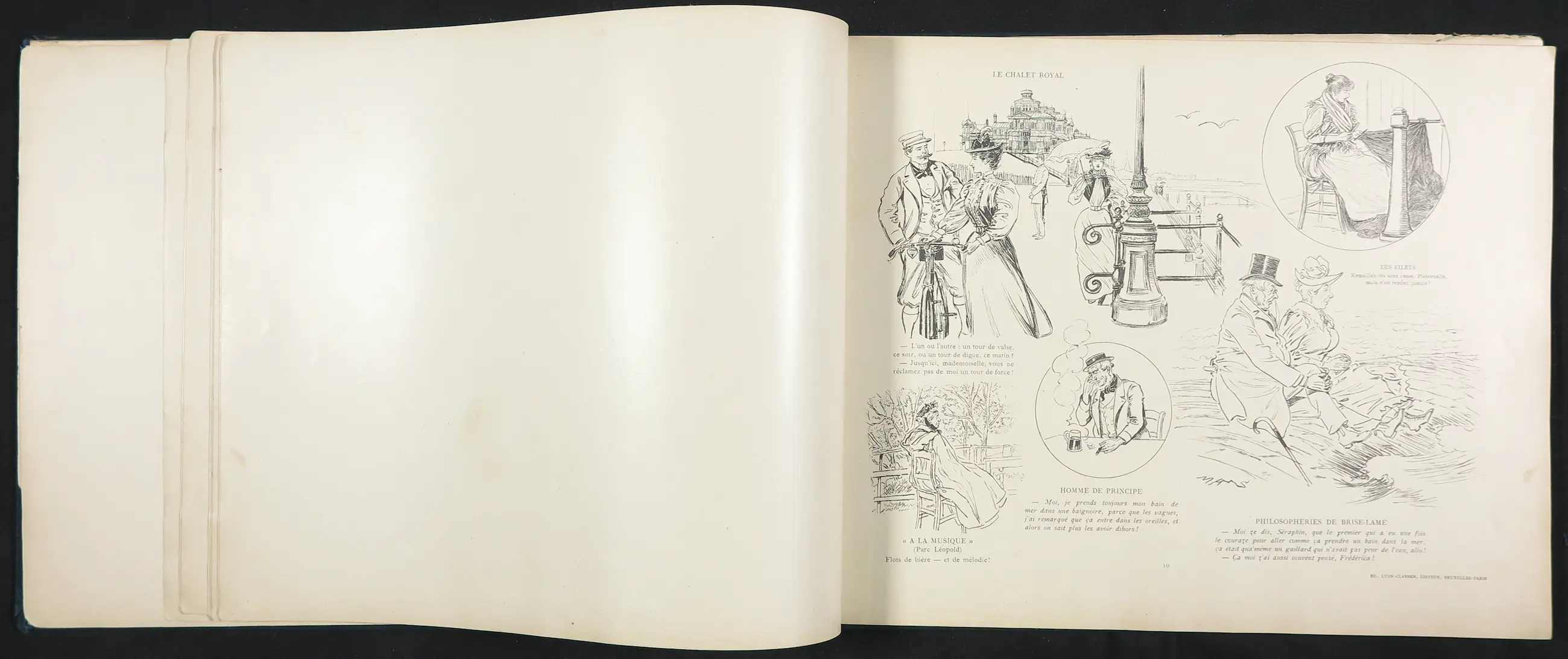 Rijkelijk geïllustreerde uitgave van La vie d'Ostende, voorzien van litho's door Mars (Maurice de Bonvoisin), over het leven in de Belgische kustplaats Oostende. Uitgegeven door Editions Lyons-Clausen (Brussel en Parijs) aan het einde van de 19e eeuw.