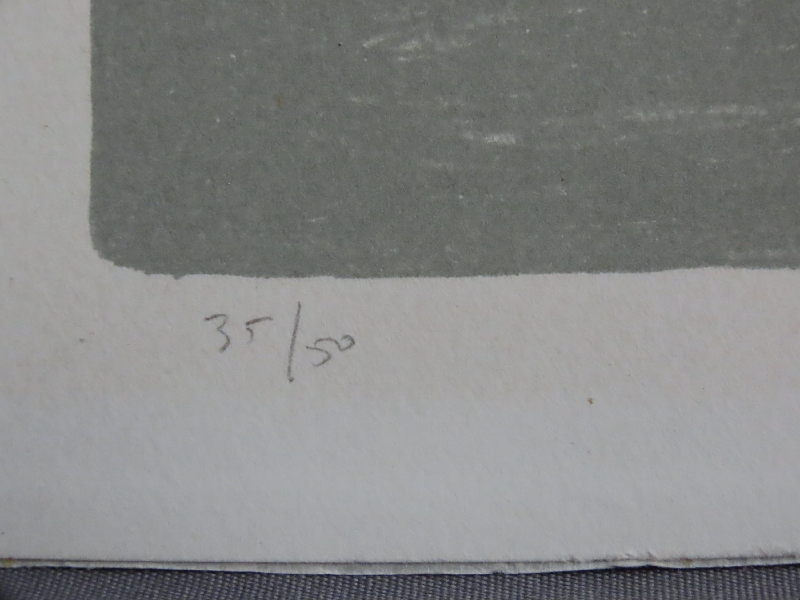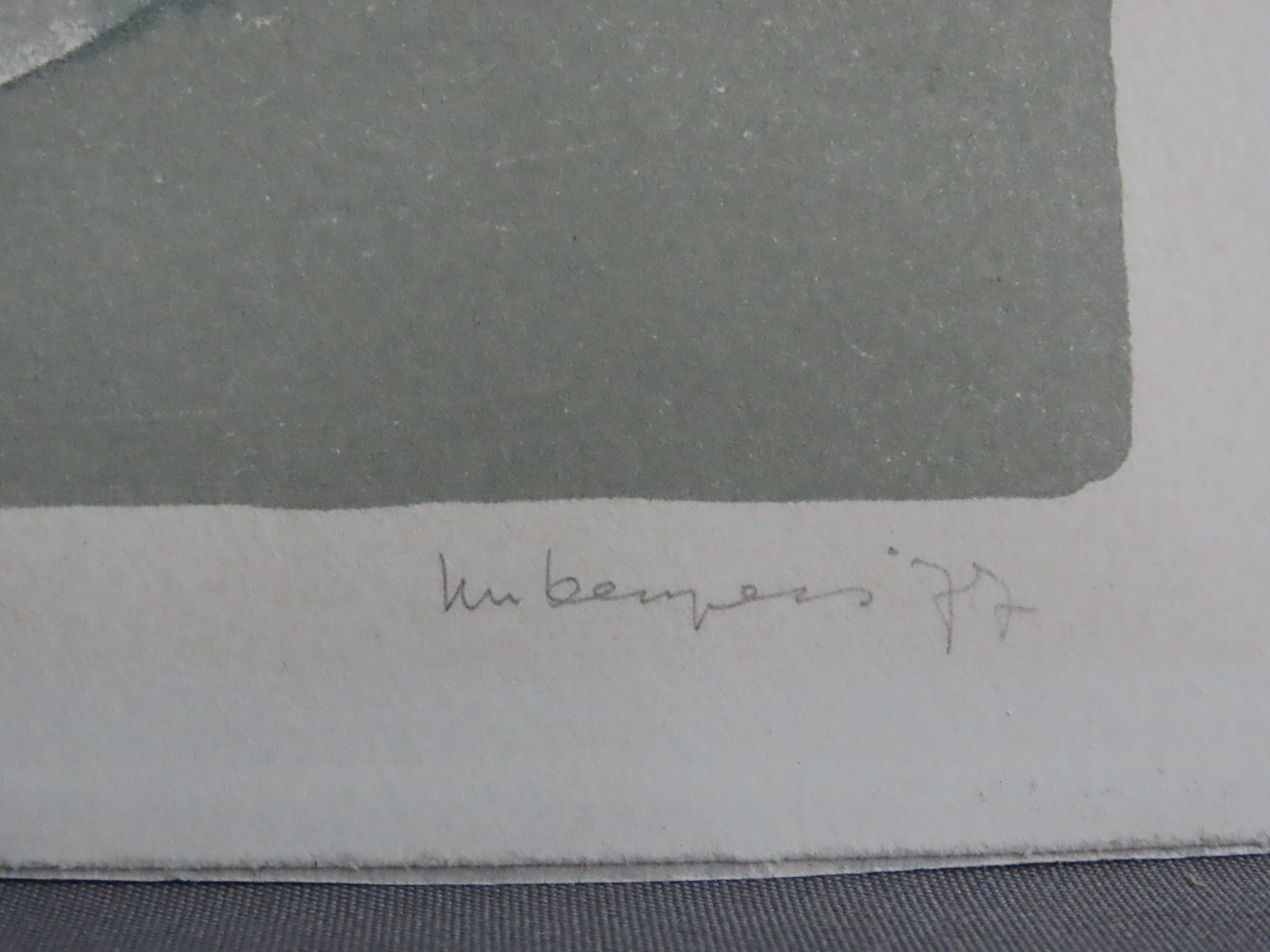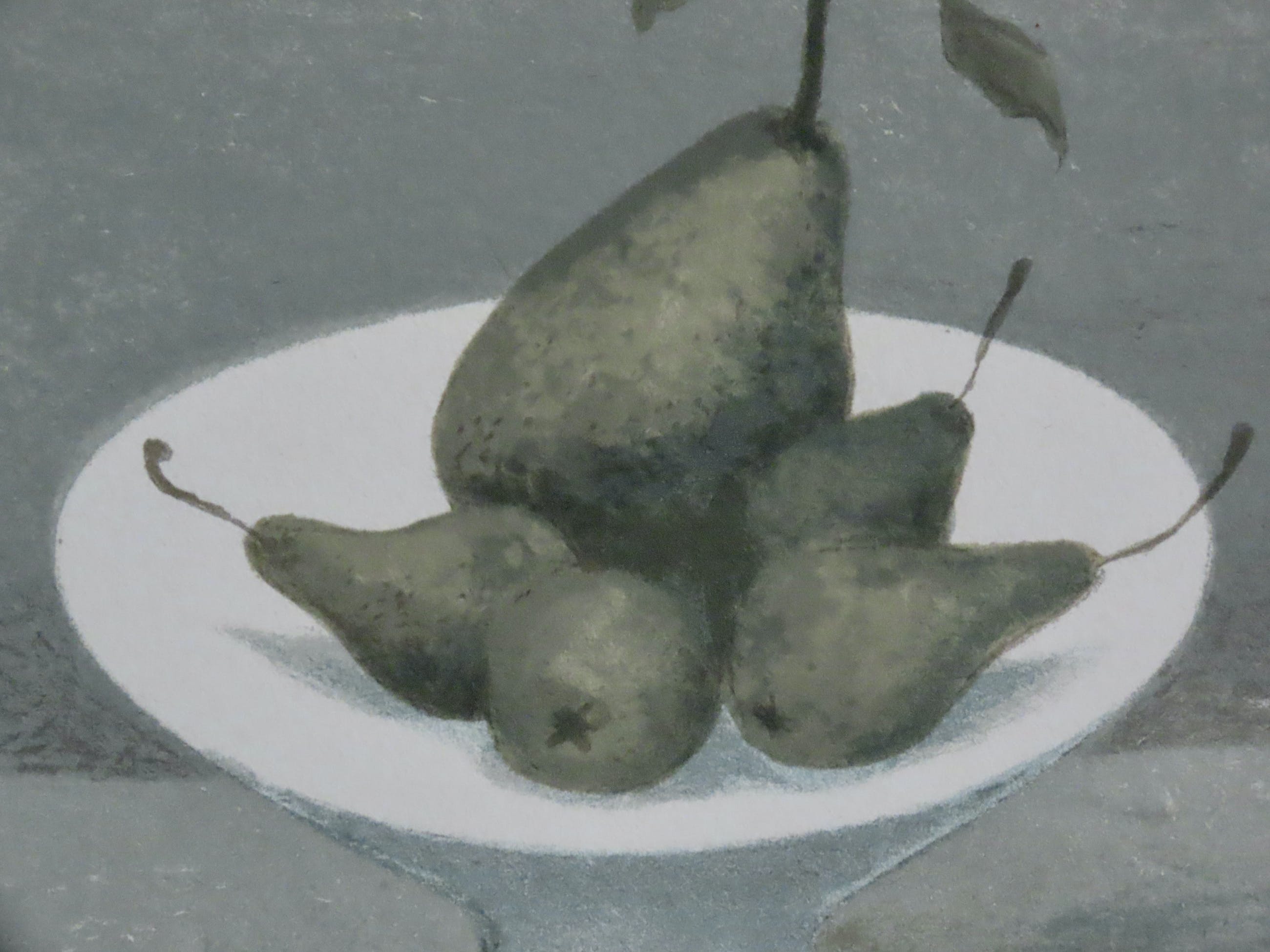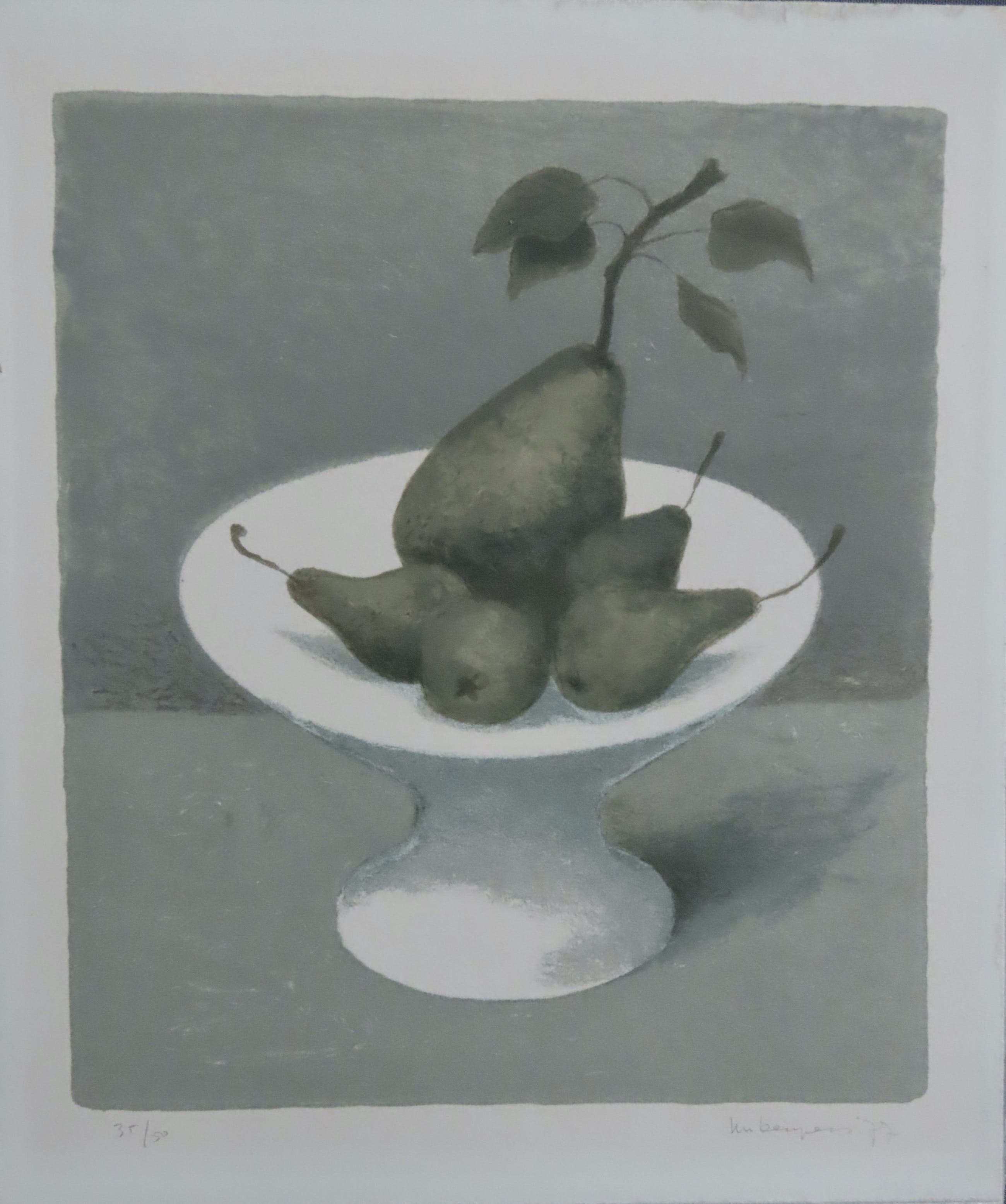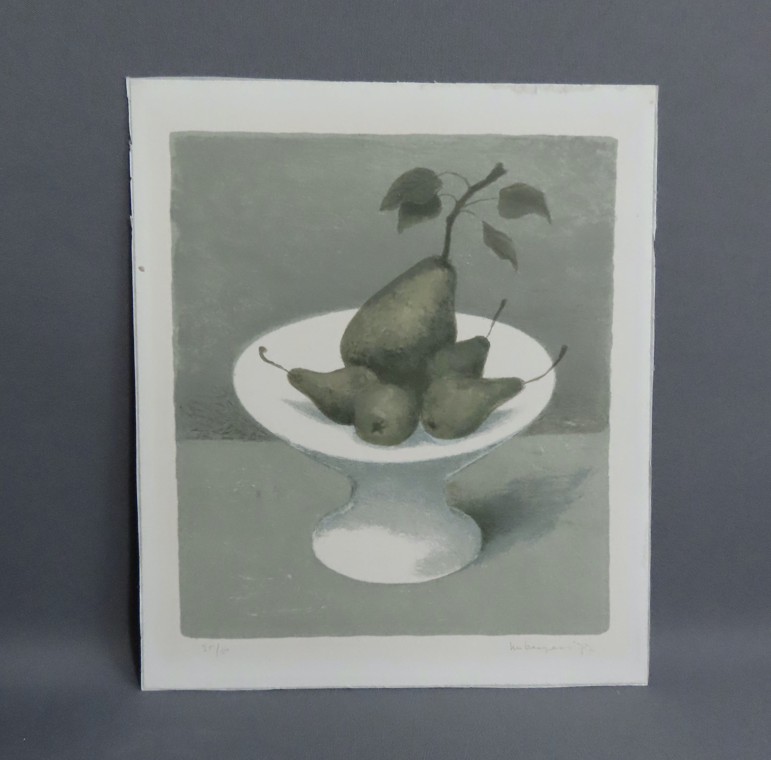 Fraai verstild werk - een fruitschaal vol peren - van Mart Kempers. Nummer 35/50 uit 1977. Goed gesigneerd rechtsonder met potlood.