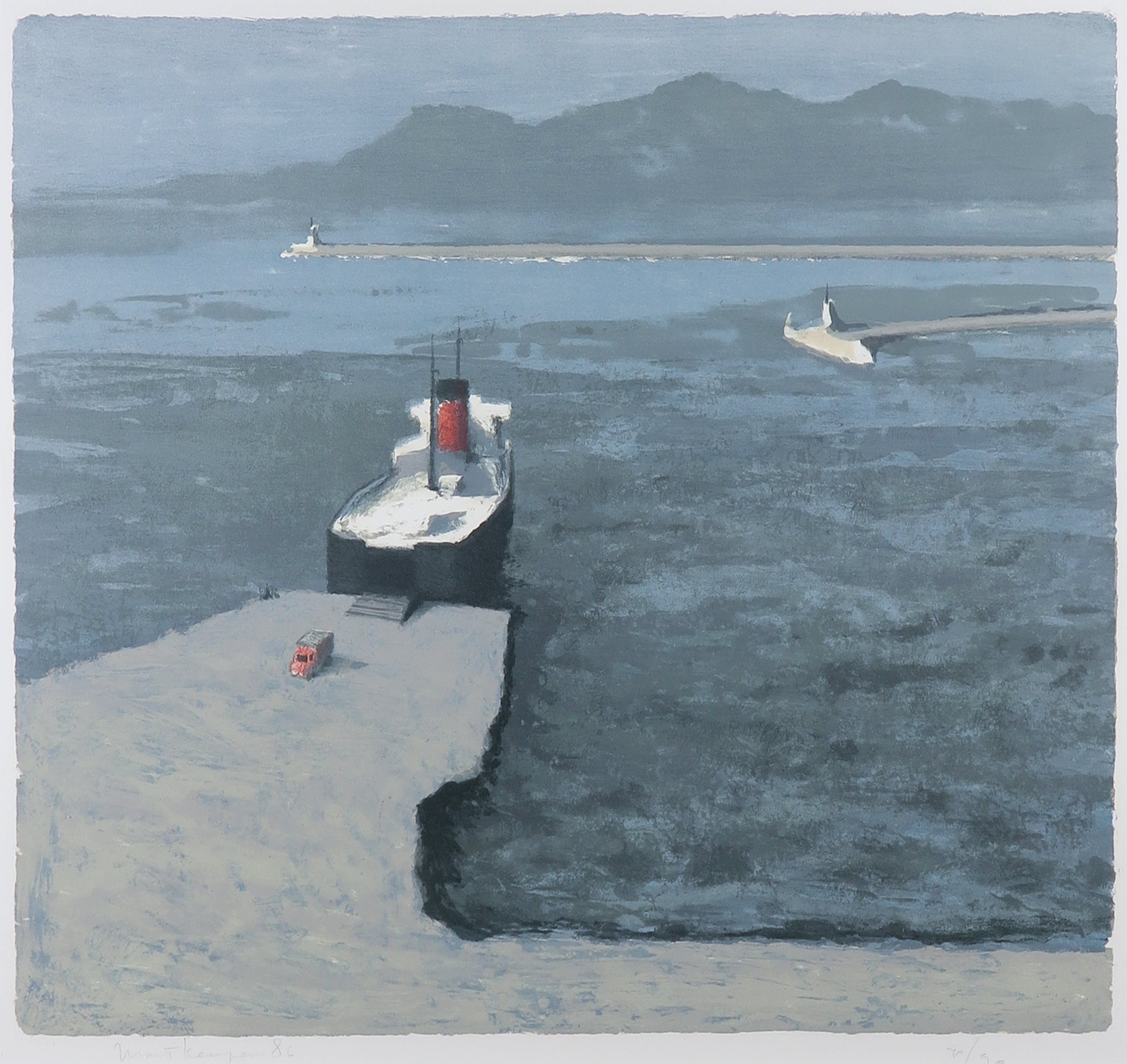 Ingelijste litho van Mart Kempers, met een sfeervolle havenvoorstelling in - vermoedelijk - Italië.