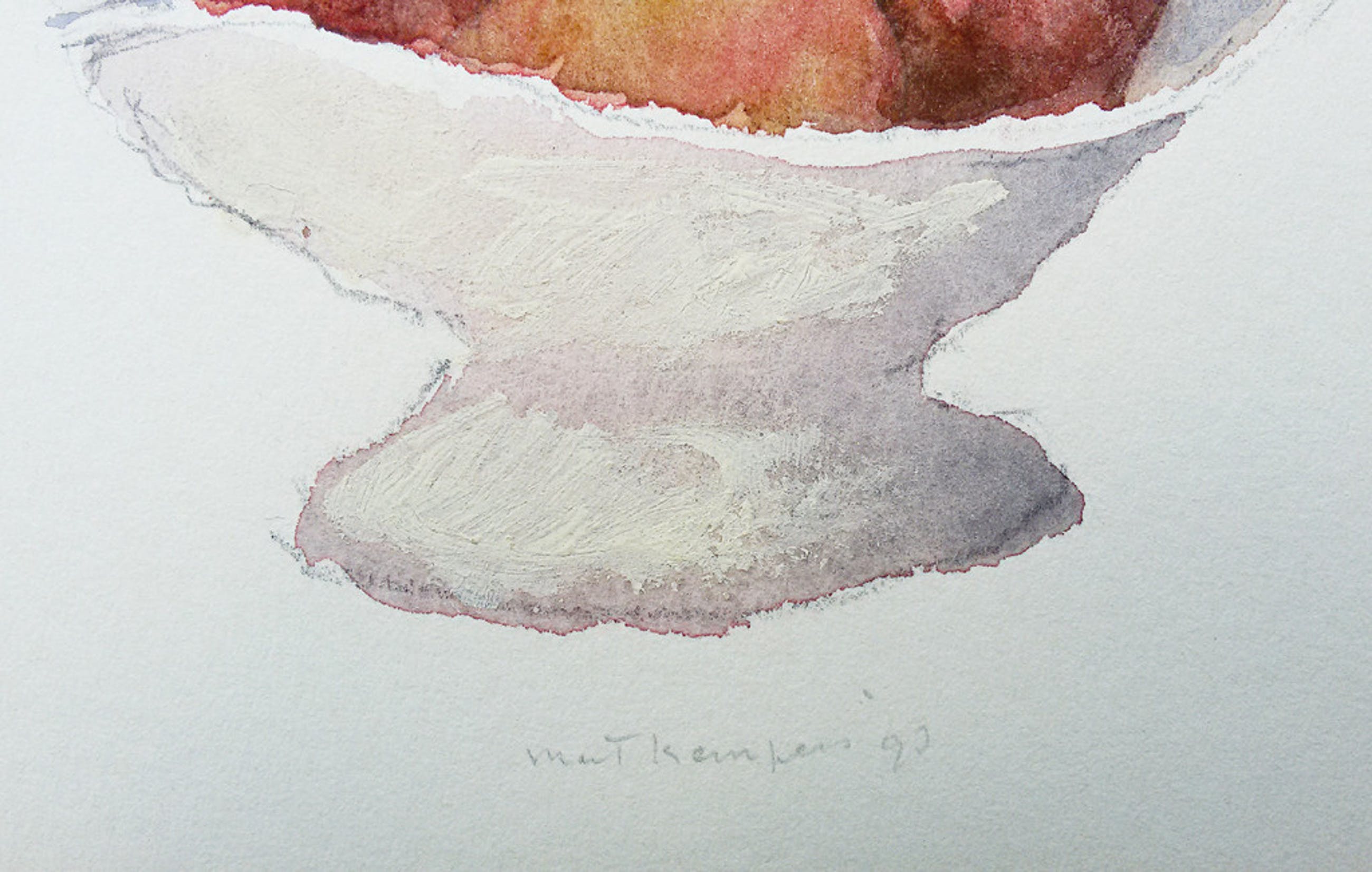 Zeer mooi stilleven van Mart Kempers uit 1993, waarschijnlijk een van zijn laatste werken. Met potlood gesigneerd en gedateerd. Afkomstig uit de kunstcollectie van ABNAMRO; in zeer goede conditie. Werk heeft ingelijst gezeten want er is een lichte verkleuring binnen het voormalige passe-partout, opnieuw ingelijst met een goed passend passe-partout valt dit niet meer op.