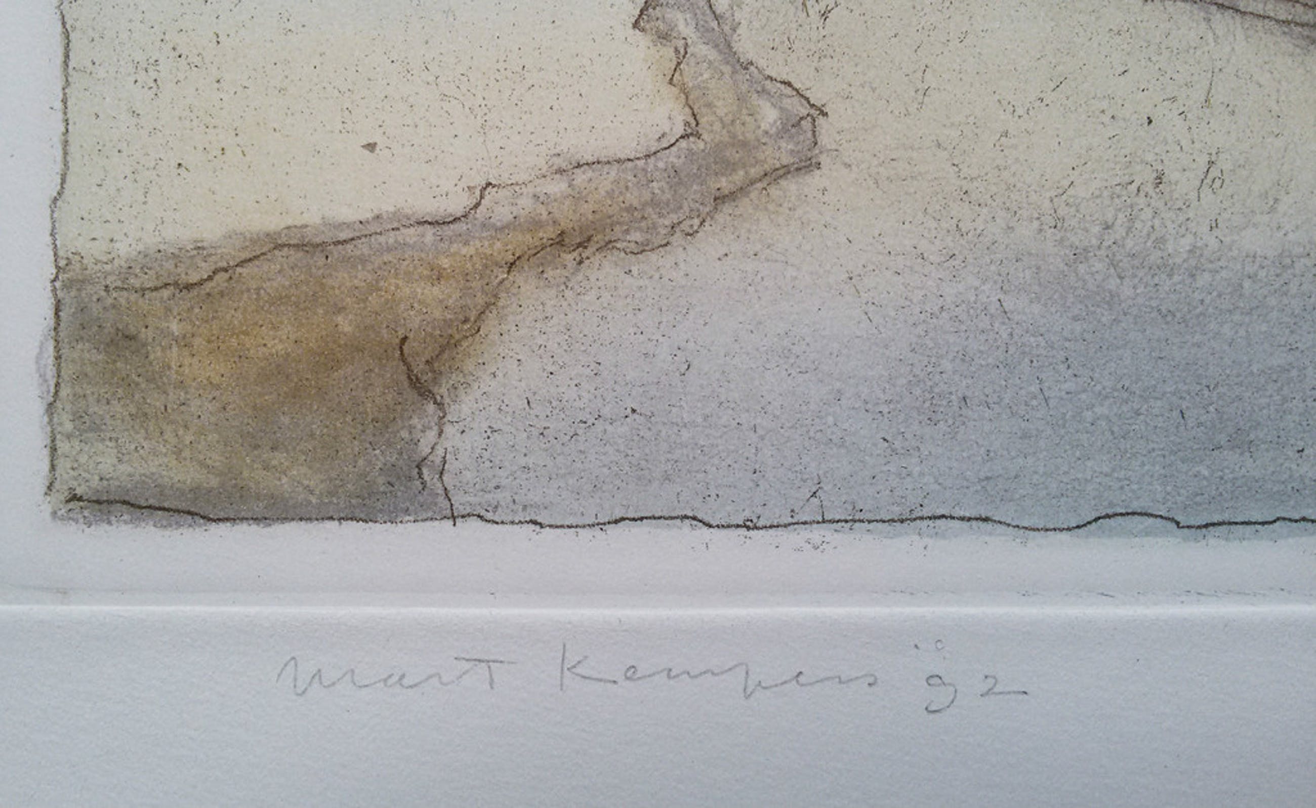 Mooi, grappig werk van Mart Kempers. “Tongue in cheek” Hollands landschap met schaatser bij een scherpe bocht. Aquatint ets op geschept papier, met potlood gesigneerd, gedateerd (‘92) en genummerd (32/60). In uitstekende conditie.