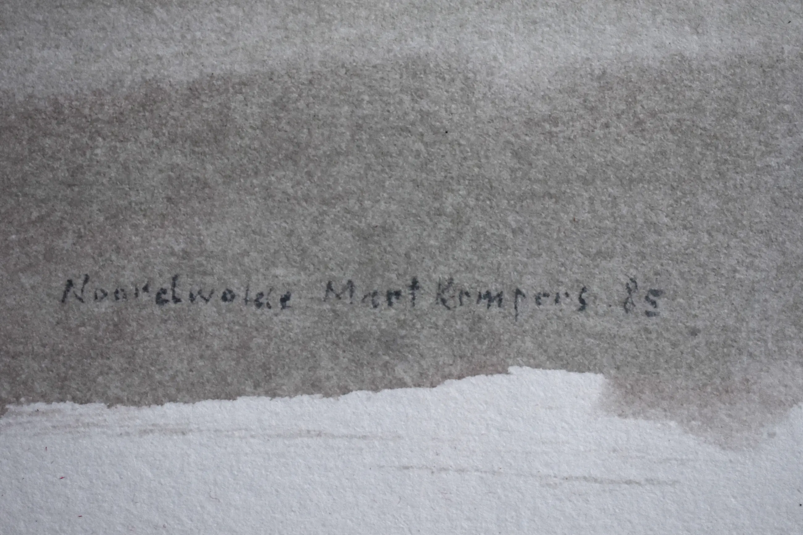 Deze boerderij staat in Noordwolde Friesland, waar Mart Kempers regelmatig verbleef gedurende de jaren 70-80 van de 20ste eeuw. Het werk draagt zijn signatuur en datum ’85. Het werk is in zeer goede conditie. De aquarel is perfect ingelijst maar zou eventueel nog ruimer ingelijst kunnen worden. De echte maat is 29x39 cm, en bevindt zich dus deels onder het passepartout. Kempers is een niet te onderschatten kunstenaar en bevindt zich in menig museumcollectie. Hij wordt gezien als een Friese kunstenaar. Daar verbleef hij vele jaren , evenals in Frankrijk. De Italiaanse kunstenaar Giorgio Morandi was zijn inspiratiebron. Kempers was jarenlang docent aan de ABK Den Haag.