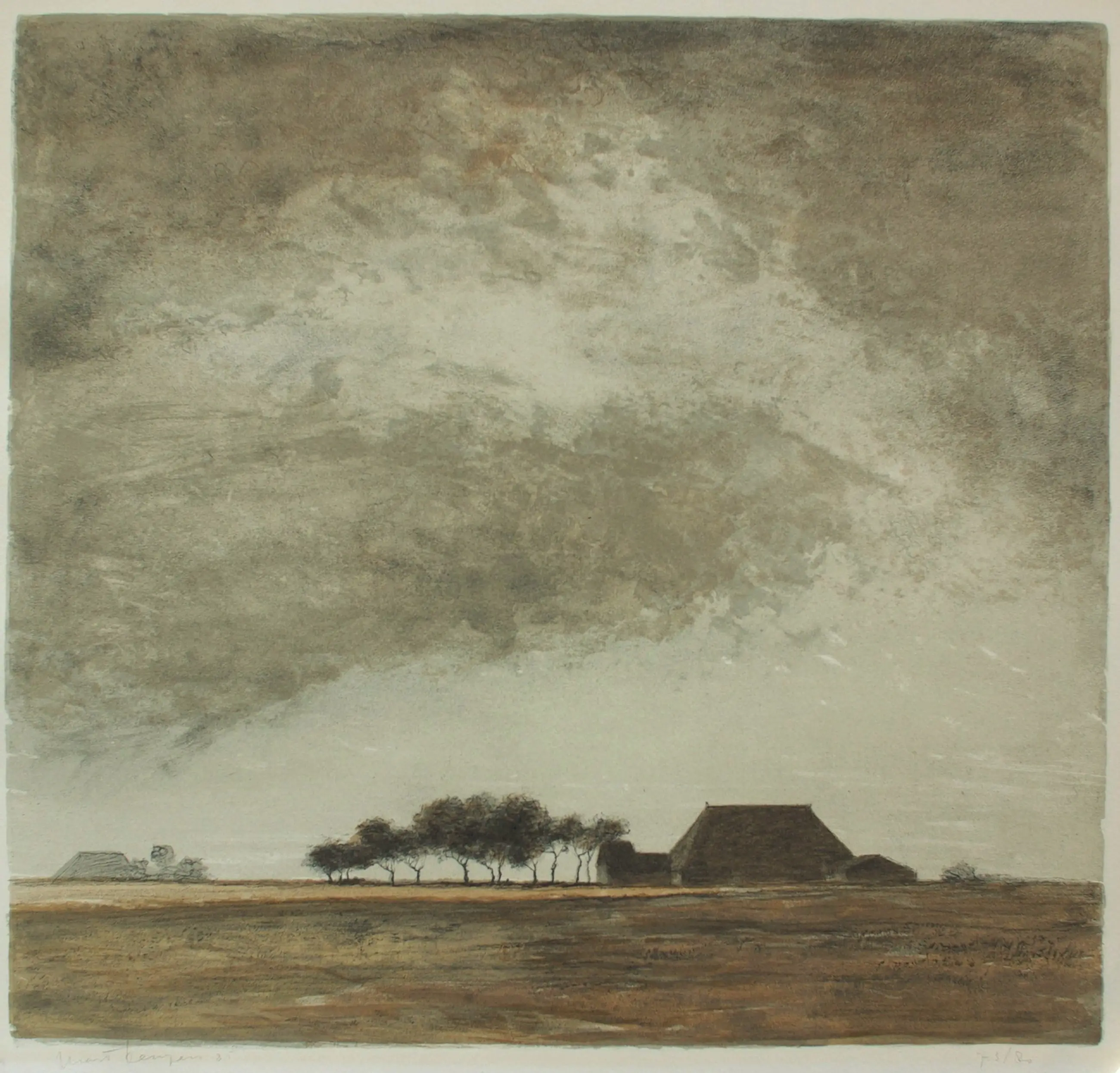Mart Kempers [ Enschede 1924-1993] Wijds landschap met boerderijen en hoge lucht.Kleurenlitho 40 x 42 cm. op vel van 62 x 55 cm. De litho is in perfecte staat, nog erg mooi van kleur. Linksonder gesigneerd en gedateerd in potlood ; Mart Kempers '85 rechtsonder ; 73/80 Als los vel in een koker goed te versturen. Eventueel te leveren in zijn originele degelijke aluminium wissellijst [70 x 65 cm.], maar dan alleen afhalen.