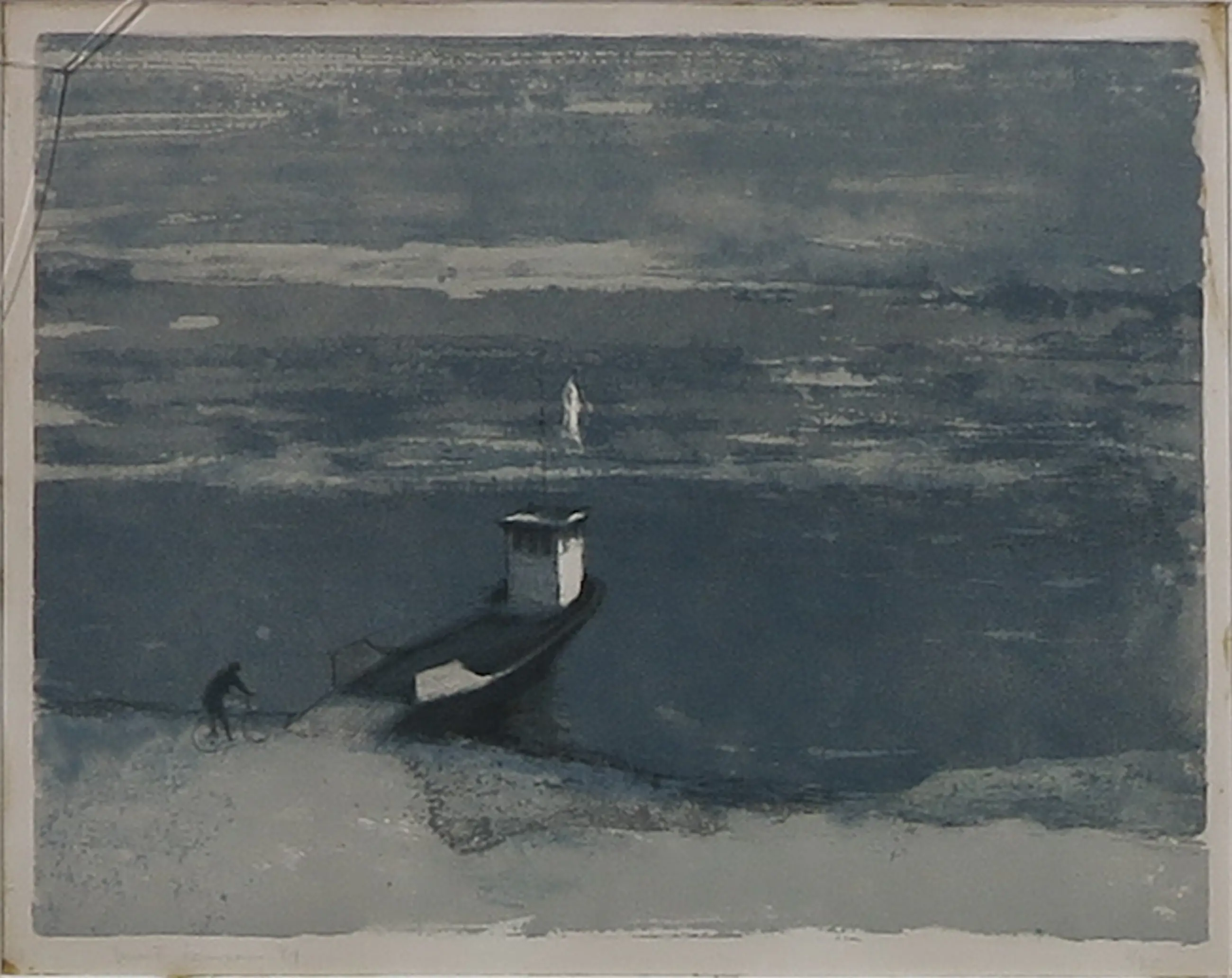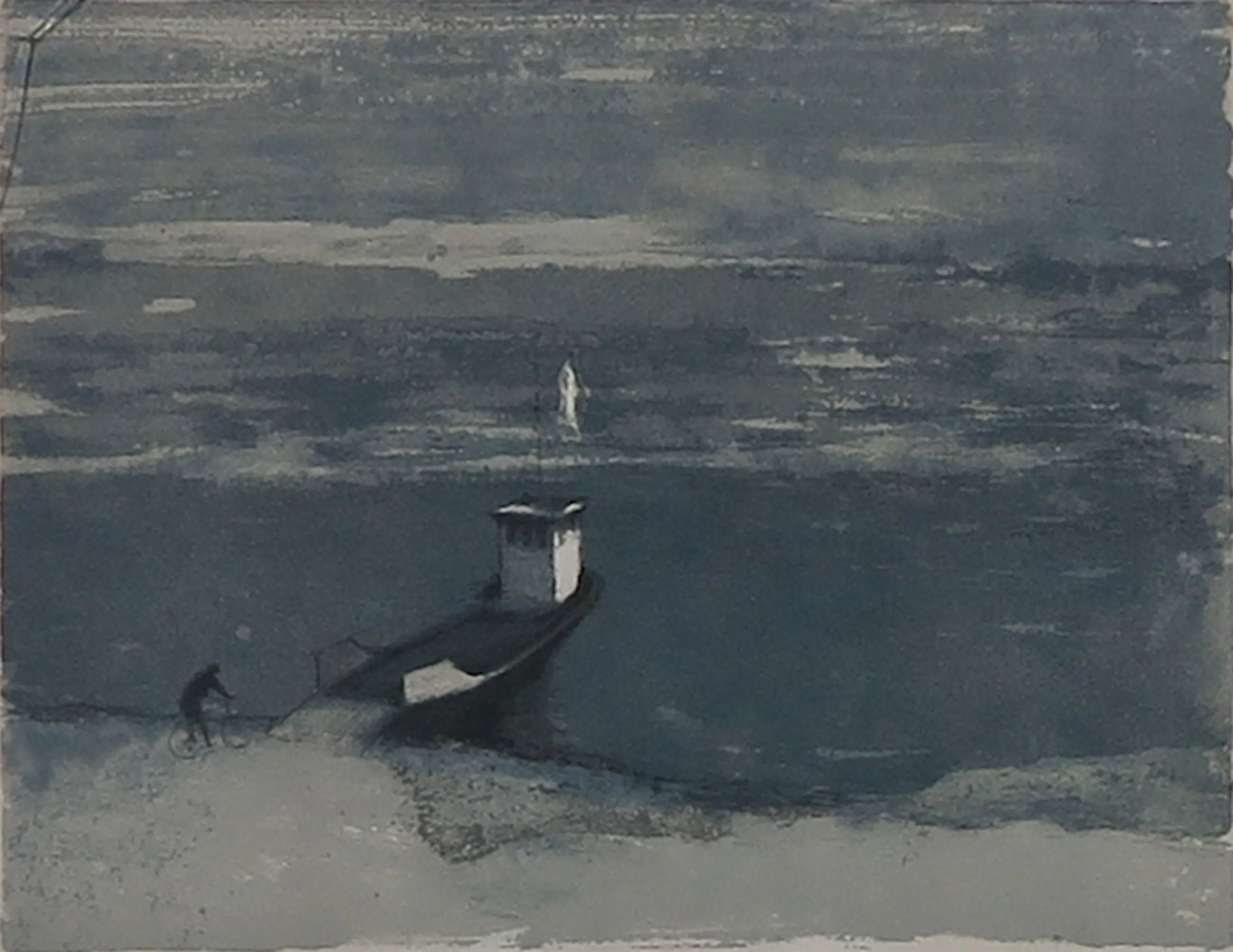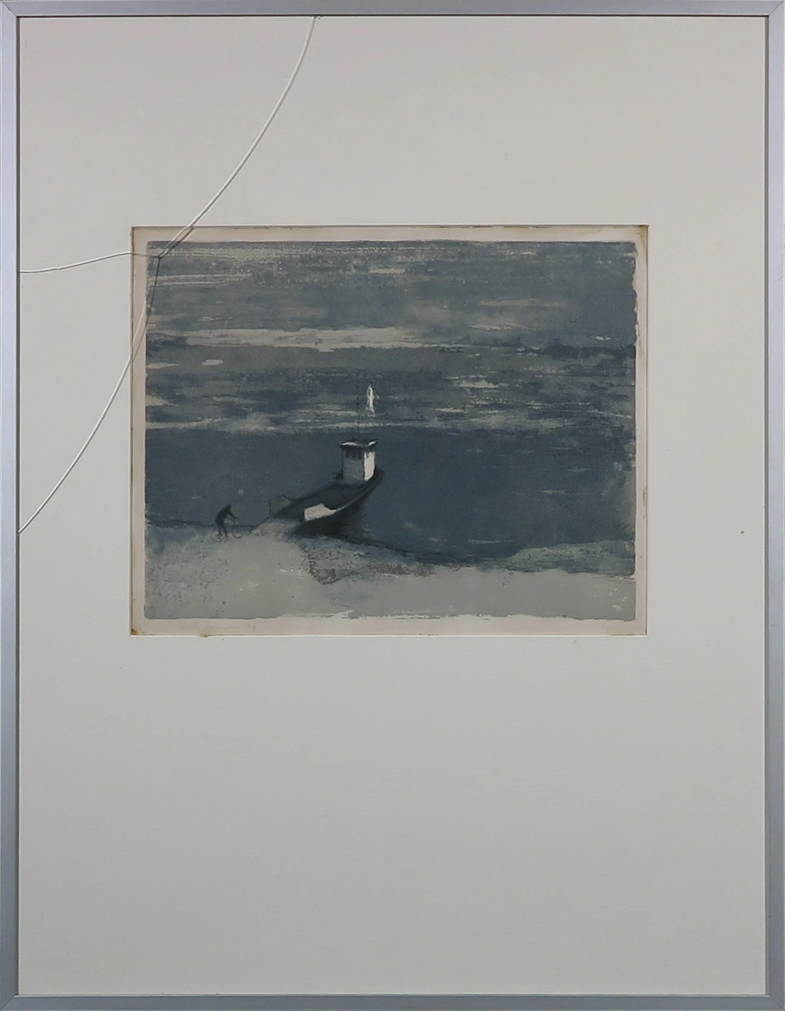 Handgesigneerde zeefdruk van Mart Kempers met een fietser bij een pont