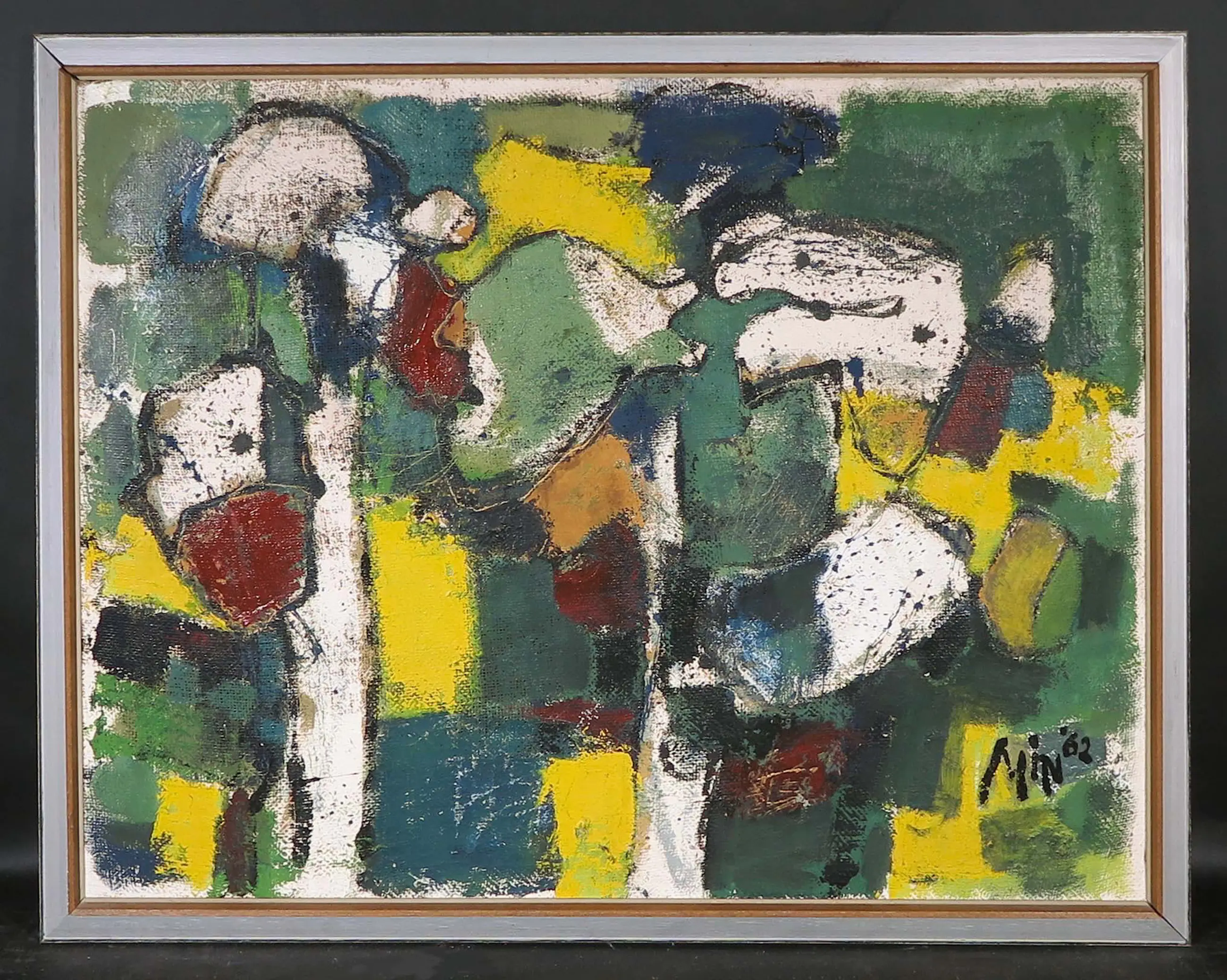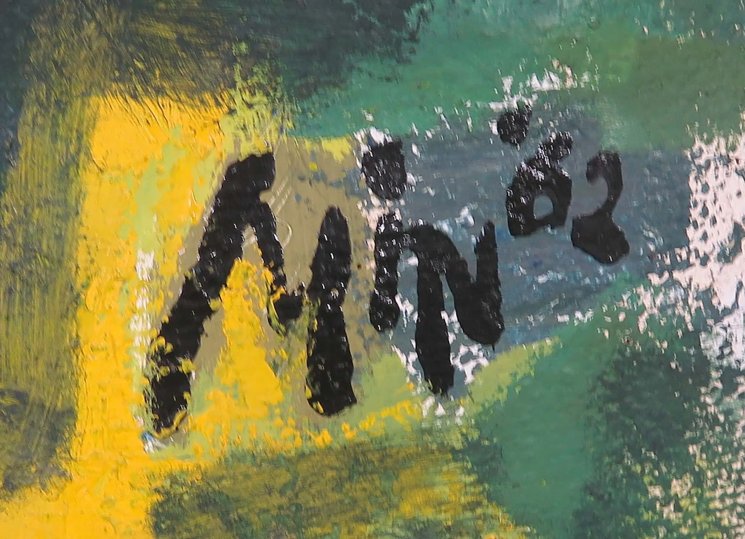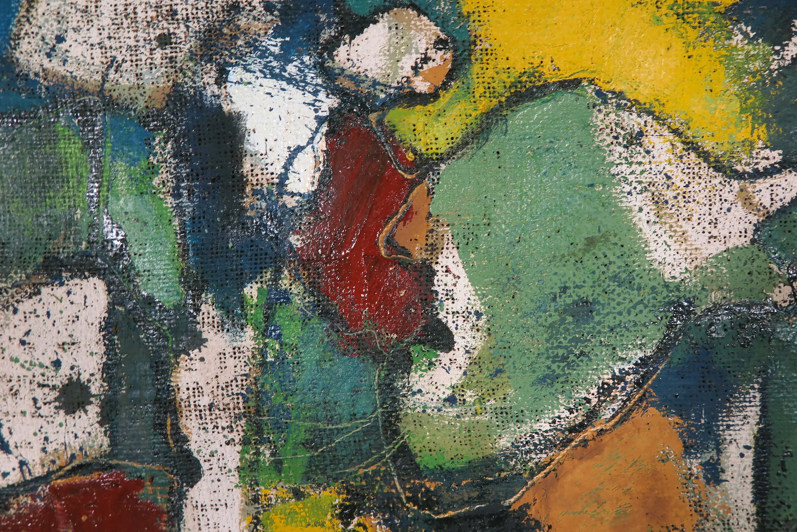 | Het werk is in goede staat. Het gebruikte jute is dus en grof geweven waardoor je door het doek heen kunt kijken als je het werk tegen het licht houdt op plaatsen waar geen verf hecht. Dit is geen veroudering, maar keuze van de drager. Het doek is licht scheefgetrokken door de verf (lichte bolling). | |