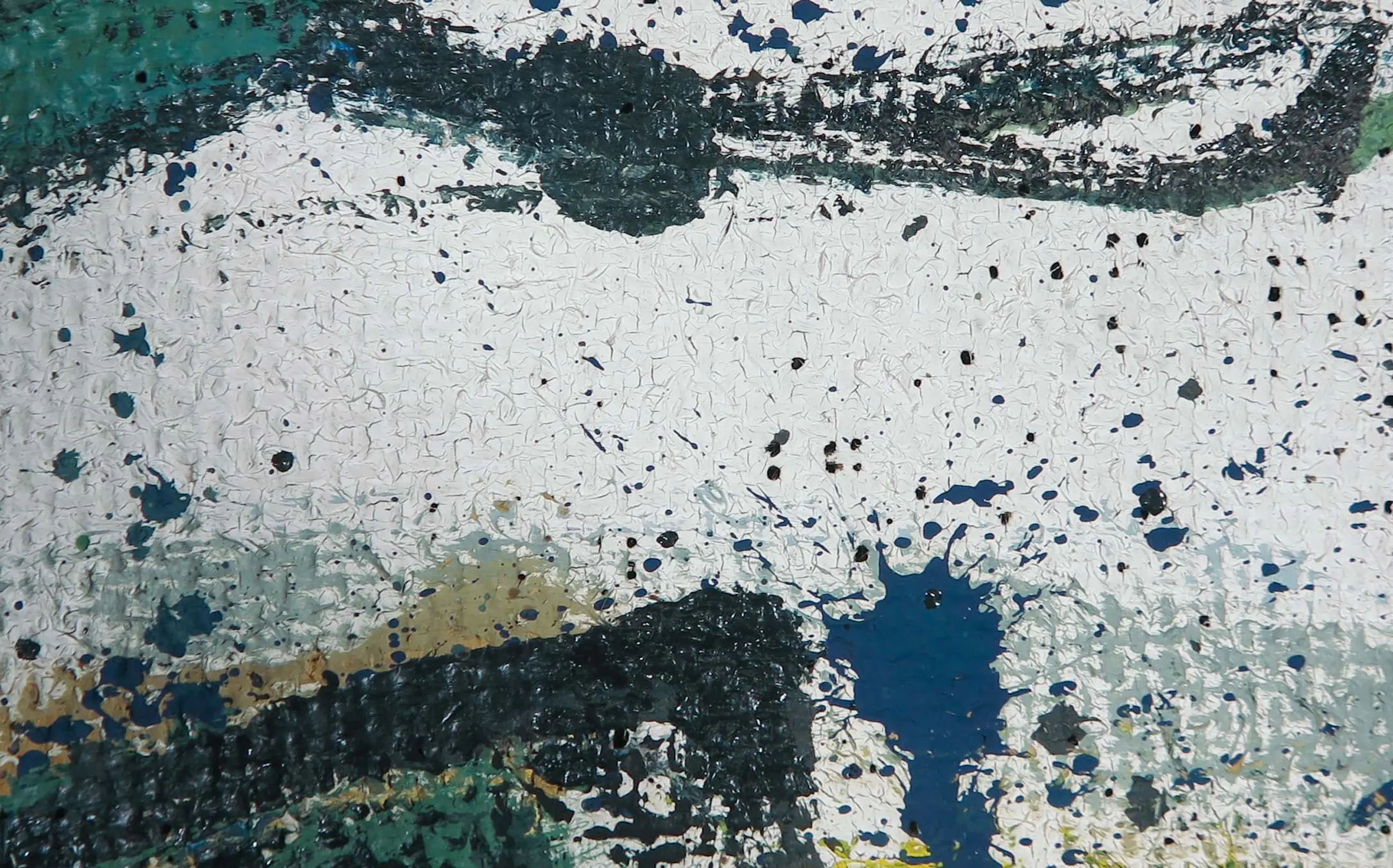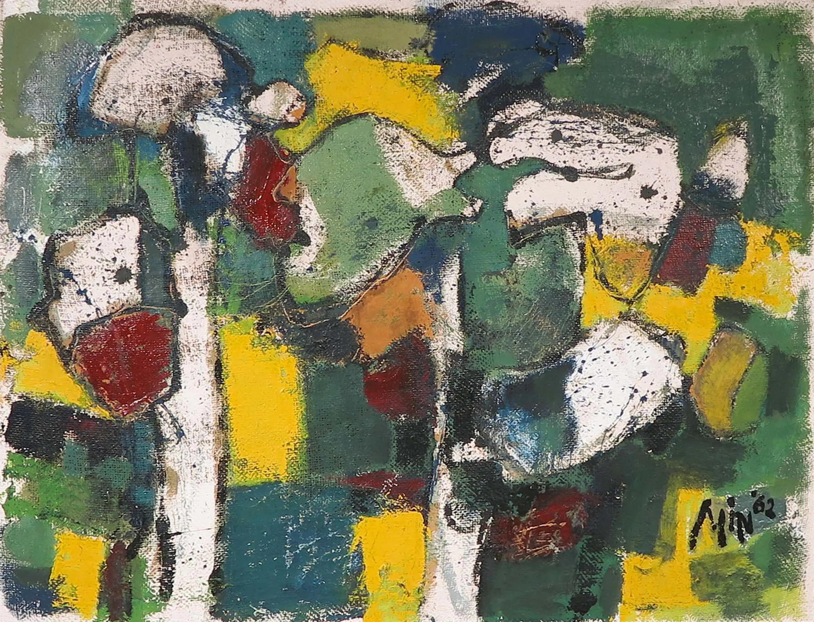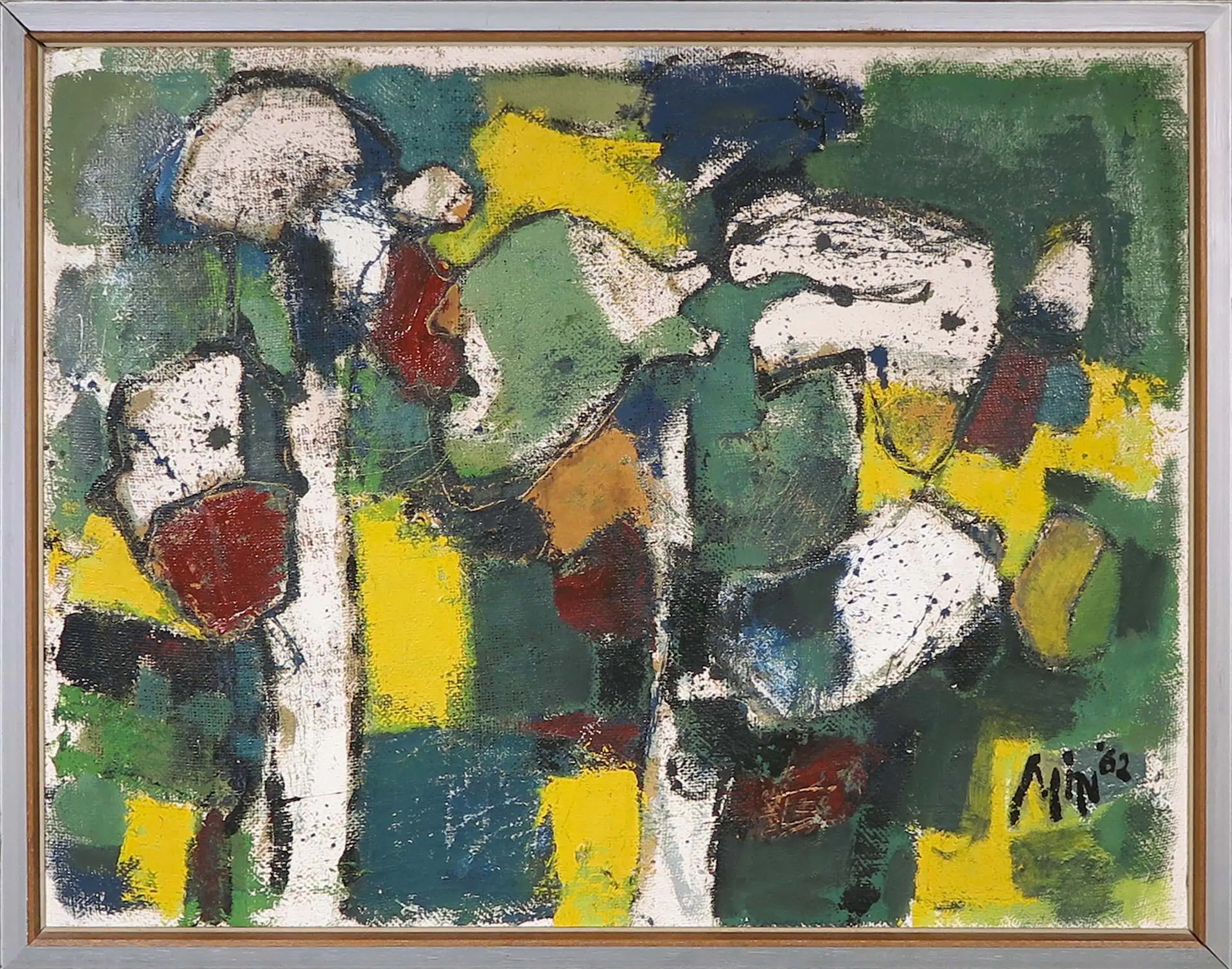 | Het werk is in goede staat. Het gebruikte jute is dus en grof geweven waardoor je door het doek heen kunt kijken als je het werk tegen het licht houdt op plaatsen waar geen verf hecht. Dit is geen veroudering, maar keuze van de drager. Het doek is licht scheefgetrokken door de verf (lichte bolling). | |