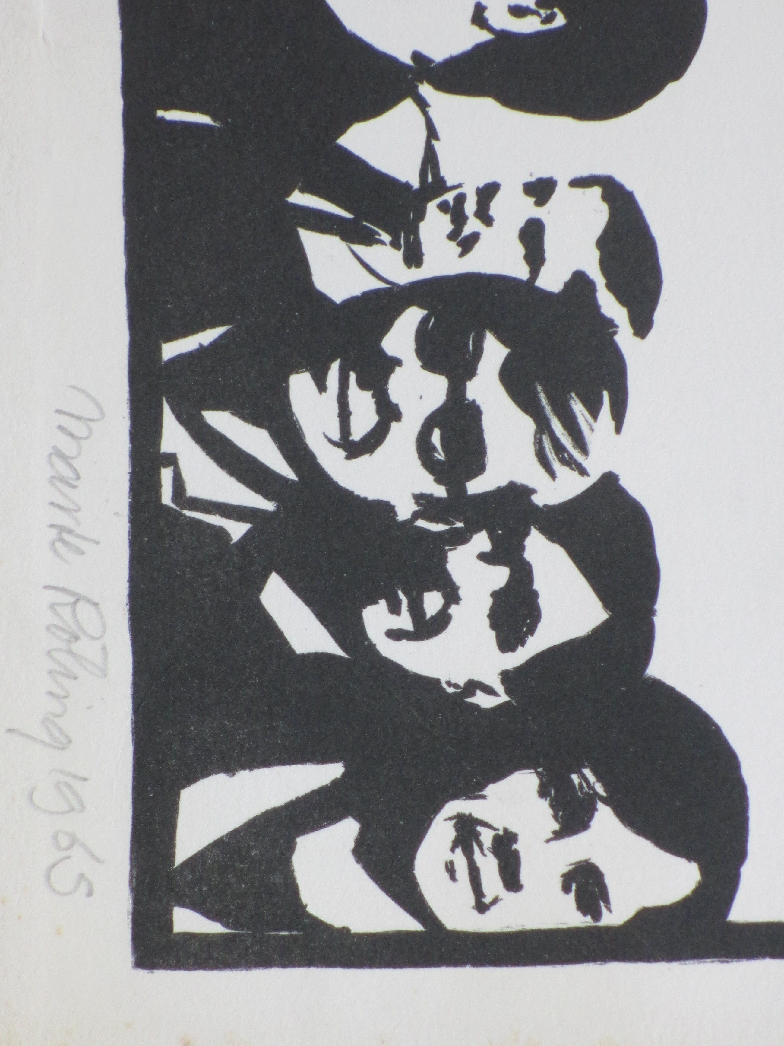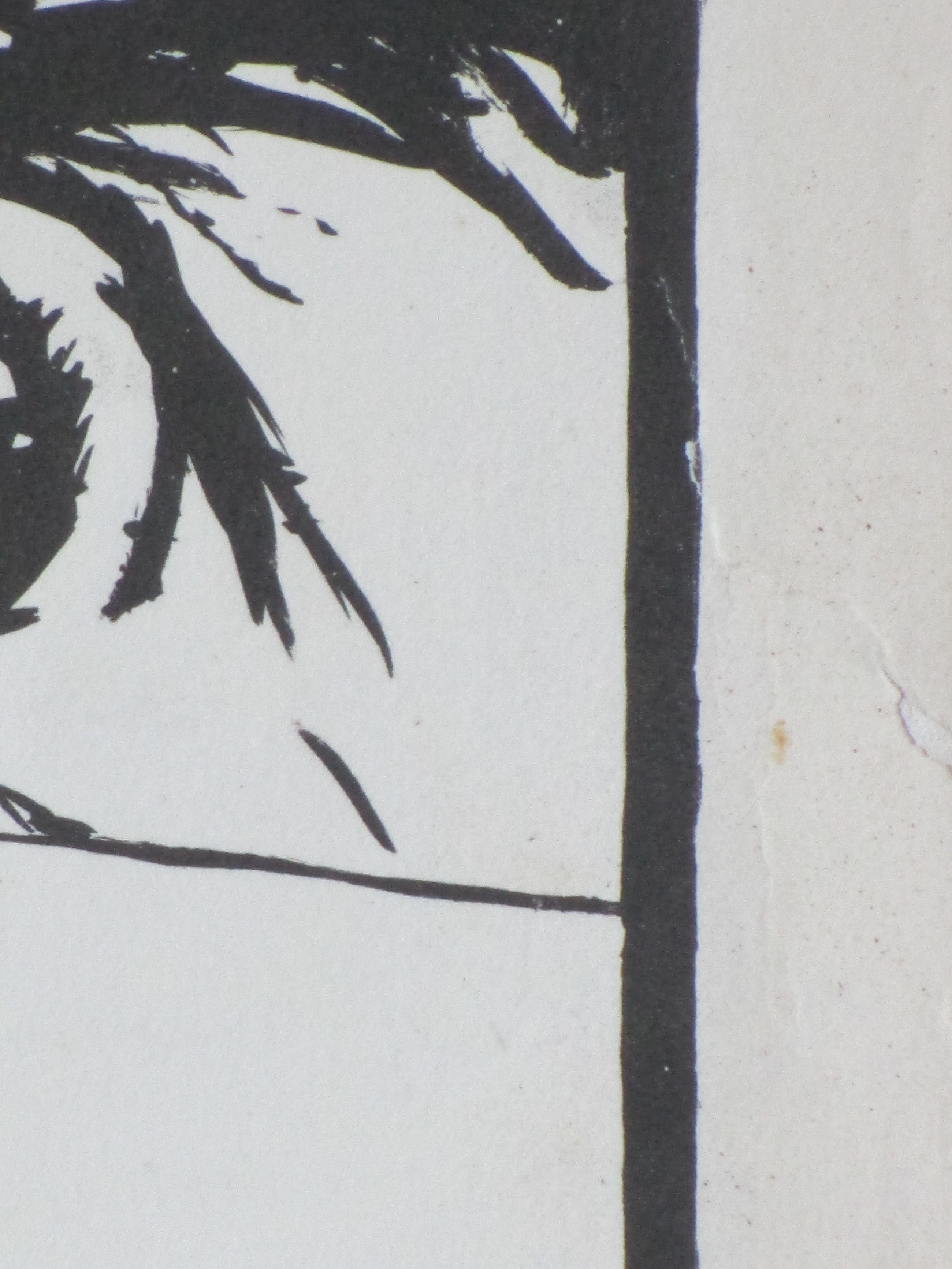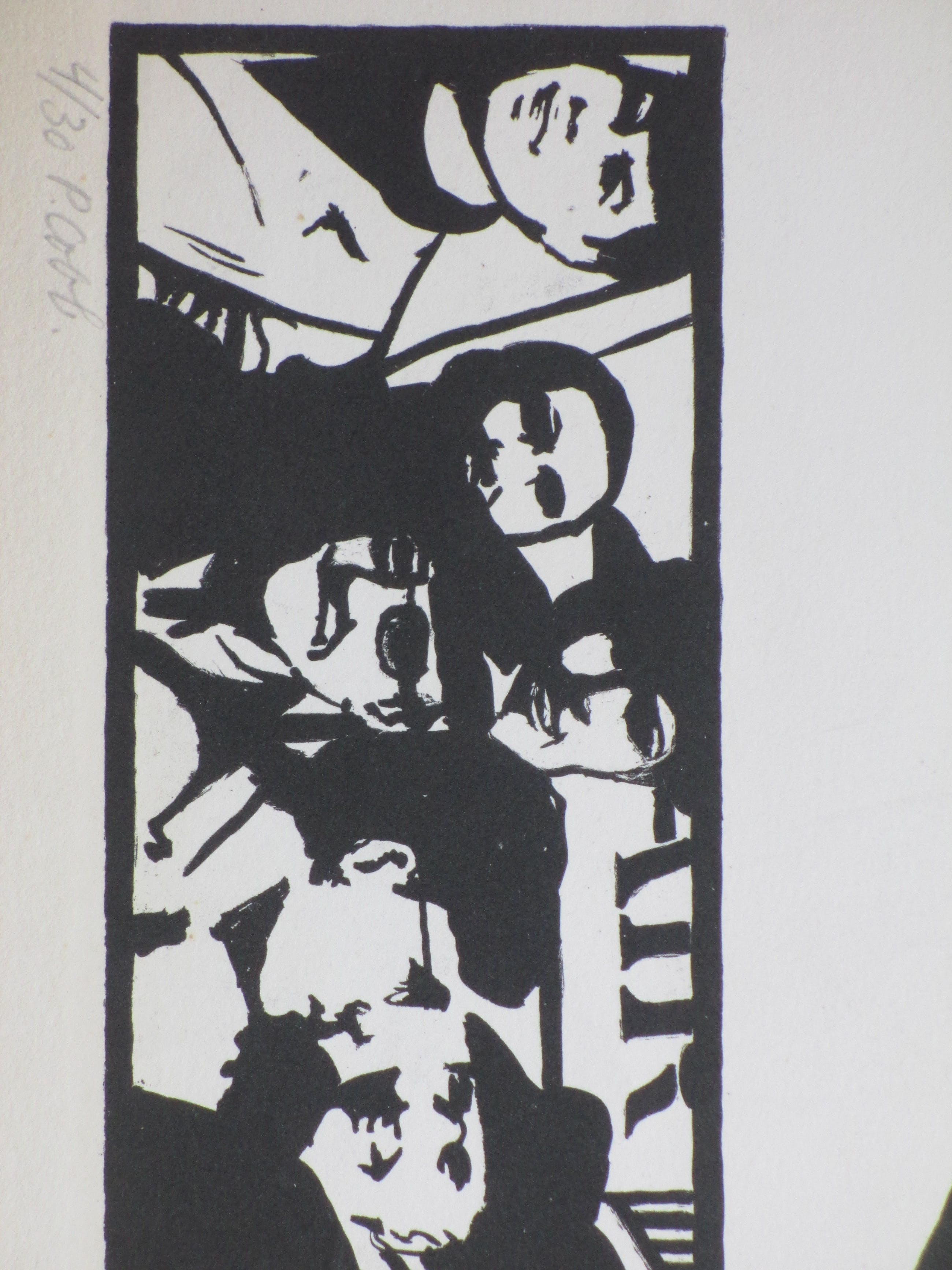 Linosnede door Marte Röling. Expressief werk in zwart/wit. Gesigneerd en gedateerd rechtsonder: 'Marte Röling 1965' Genummerd en getiteld linksonder: '4/30. P. Cobb' Klein scheurtje in bovenzijde prent, tot aan drukrand.