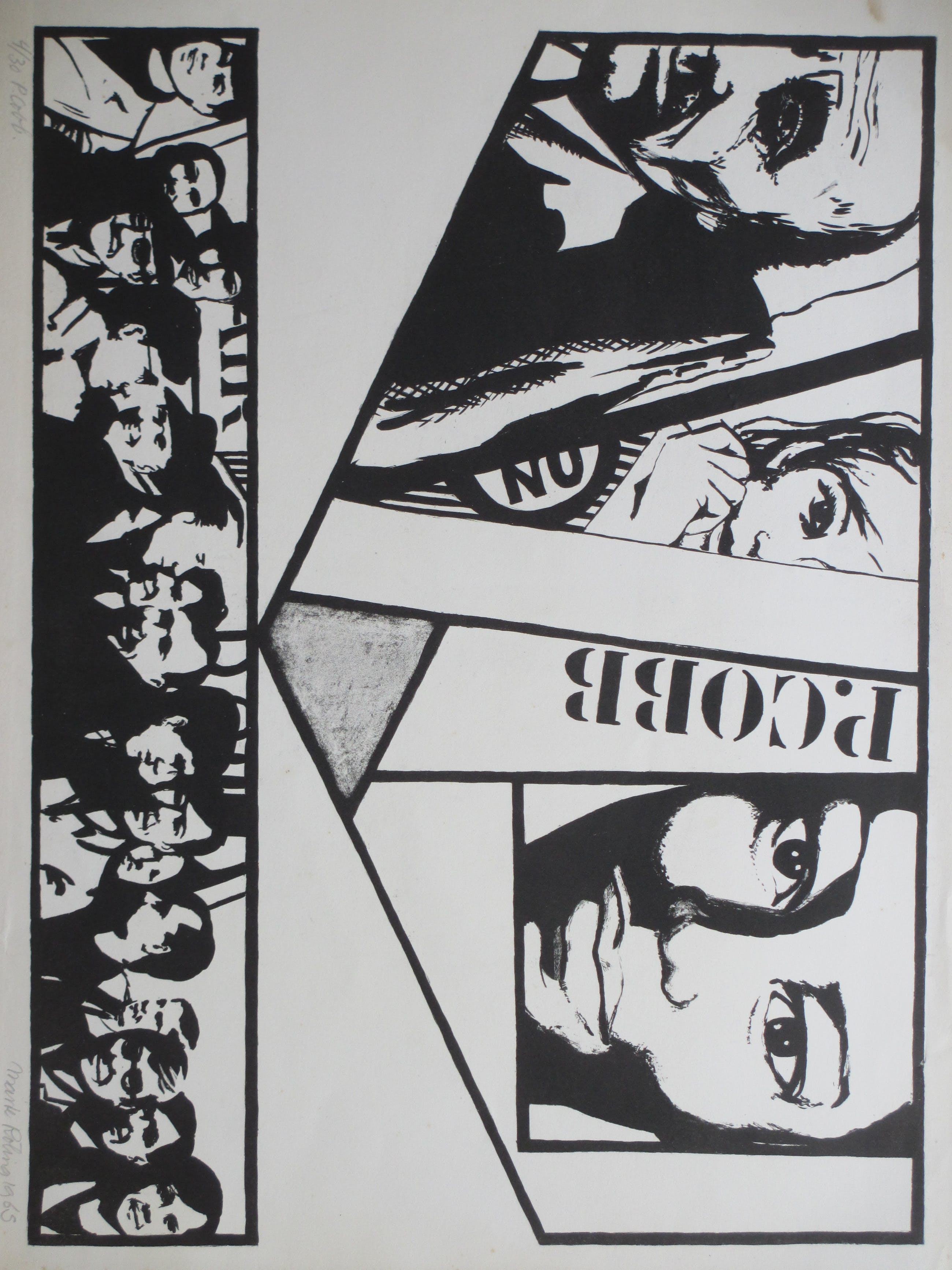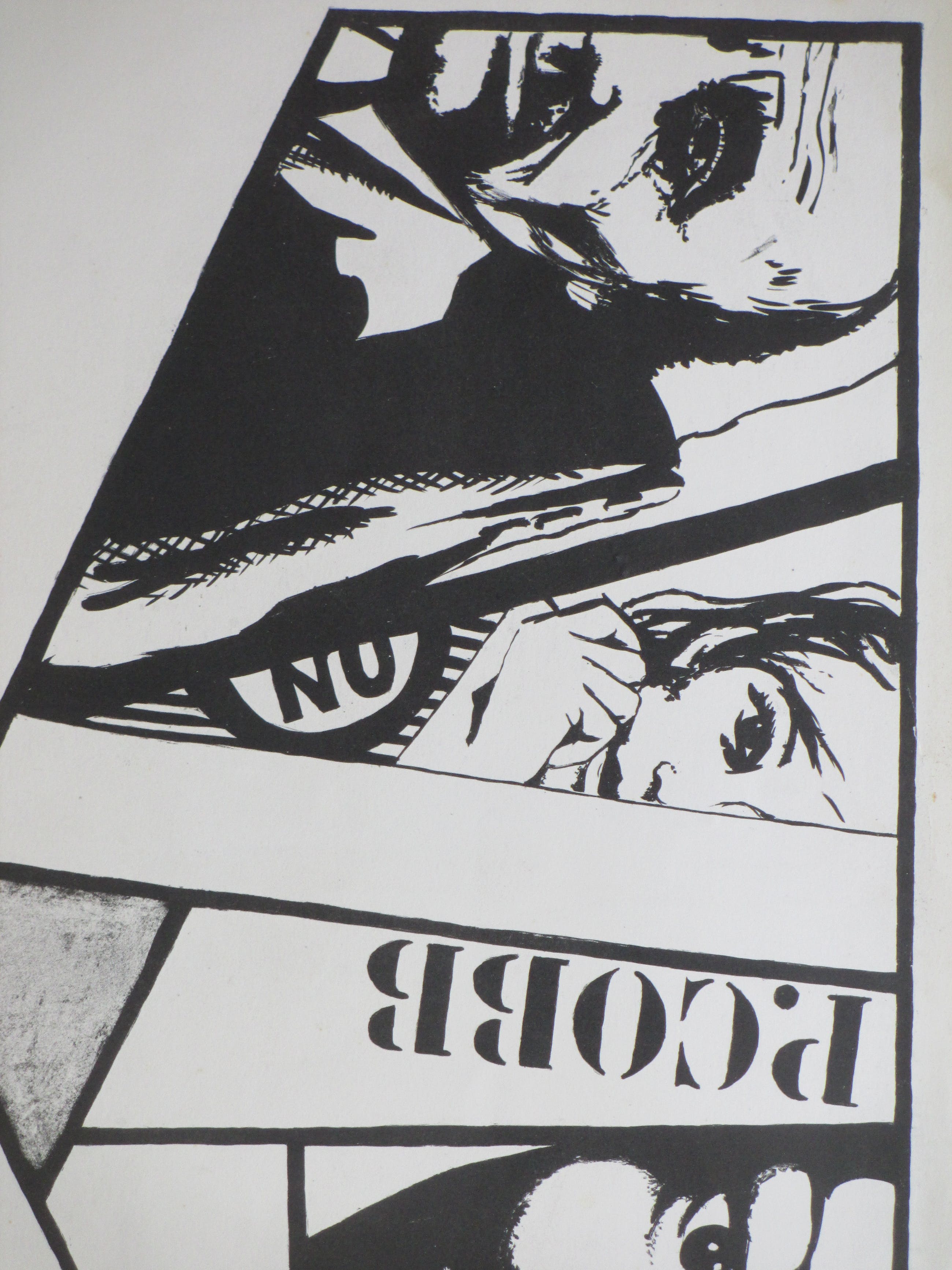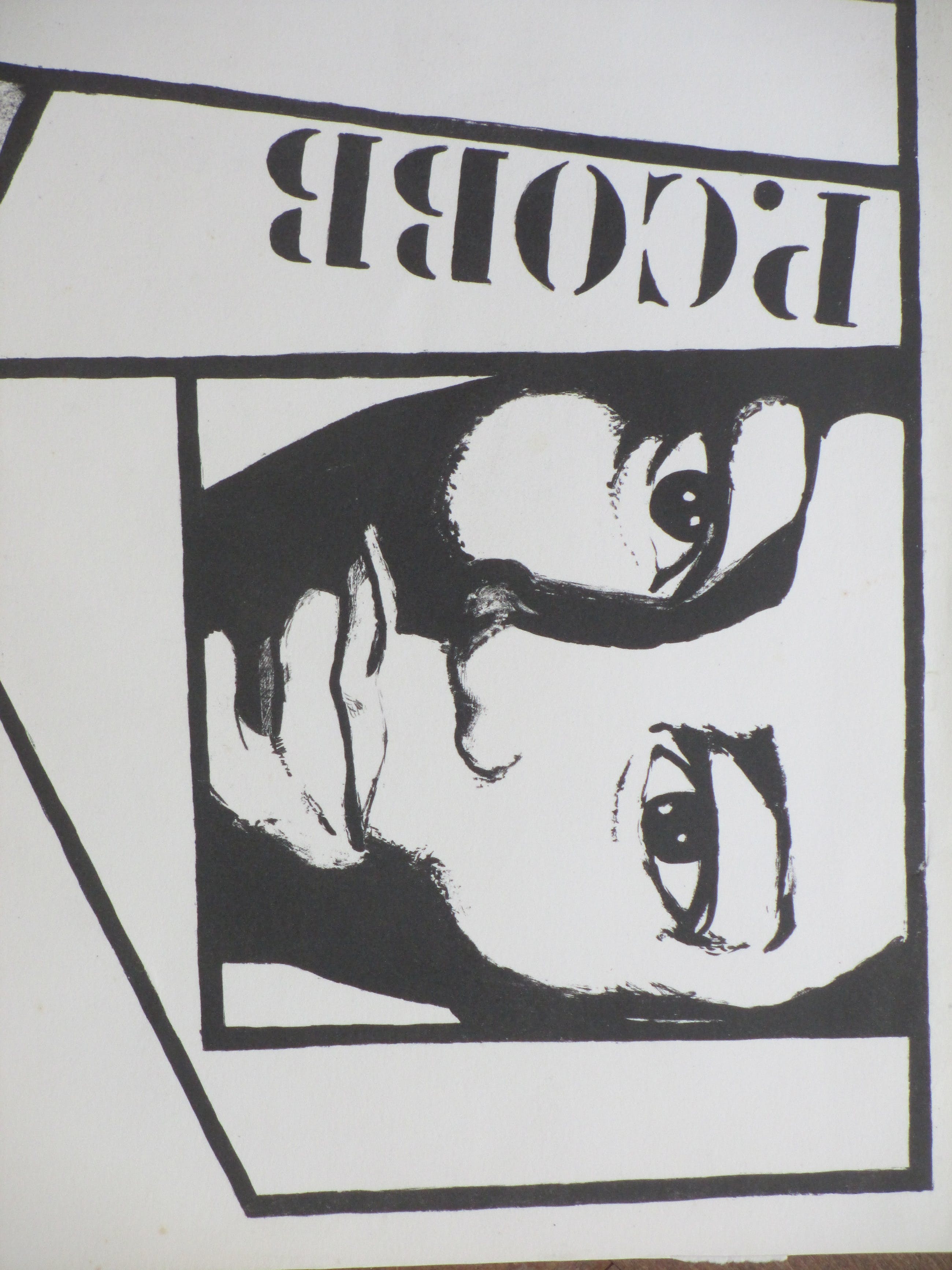 Linosnede door Marte Röling. Expressief werk in zwart/wit. Gesigneerd en gedateerd rechtsonder: 'Marte Röling 1965' Genummerd en getiteld linksonder: '4/30. P. Cobb' Klein scheurtje in bovenzijde prent, tot aan drukrand.