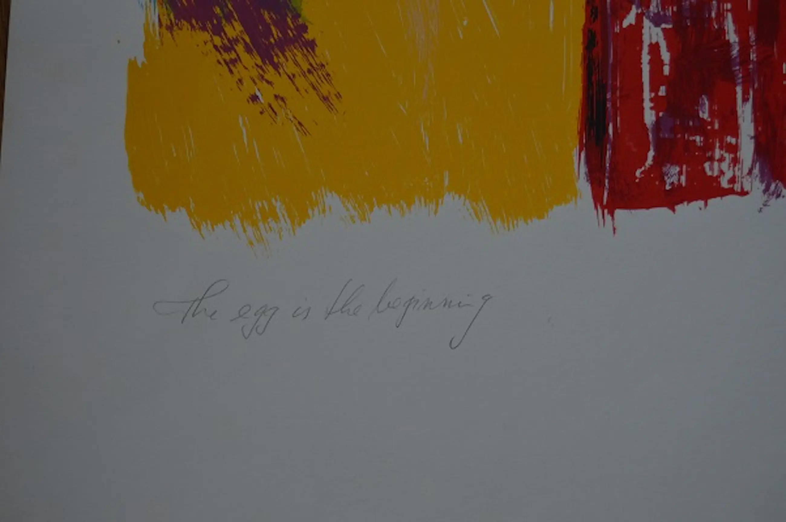 Linksonder de titel, eveneens in potlood; The egg is the beginning.