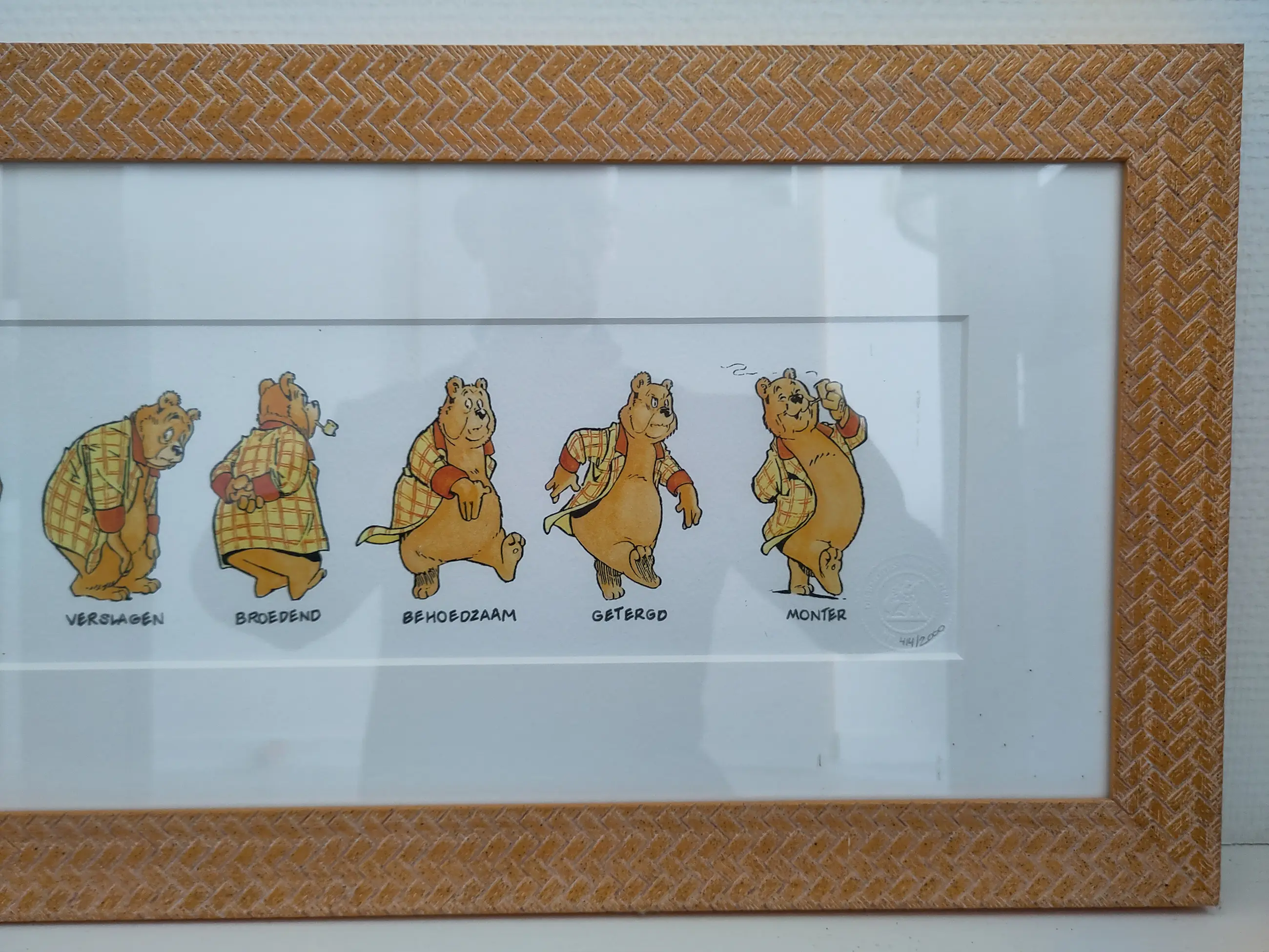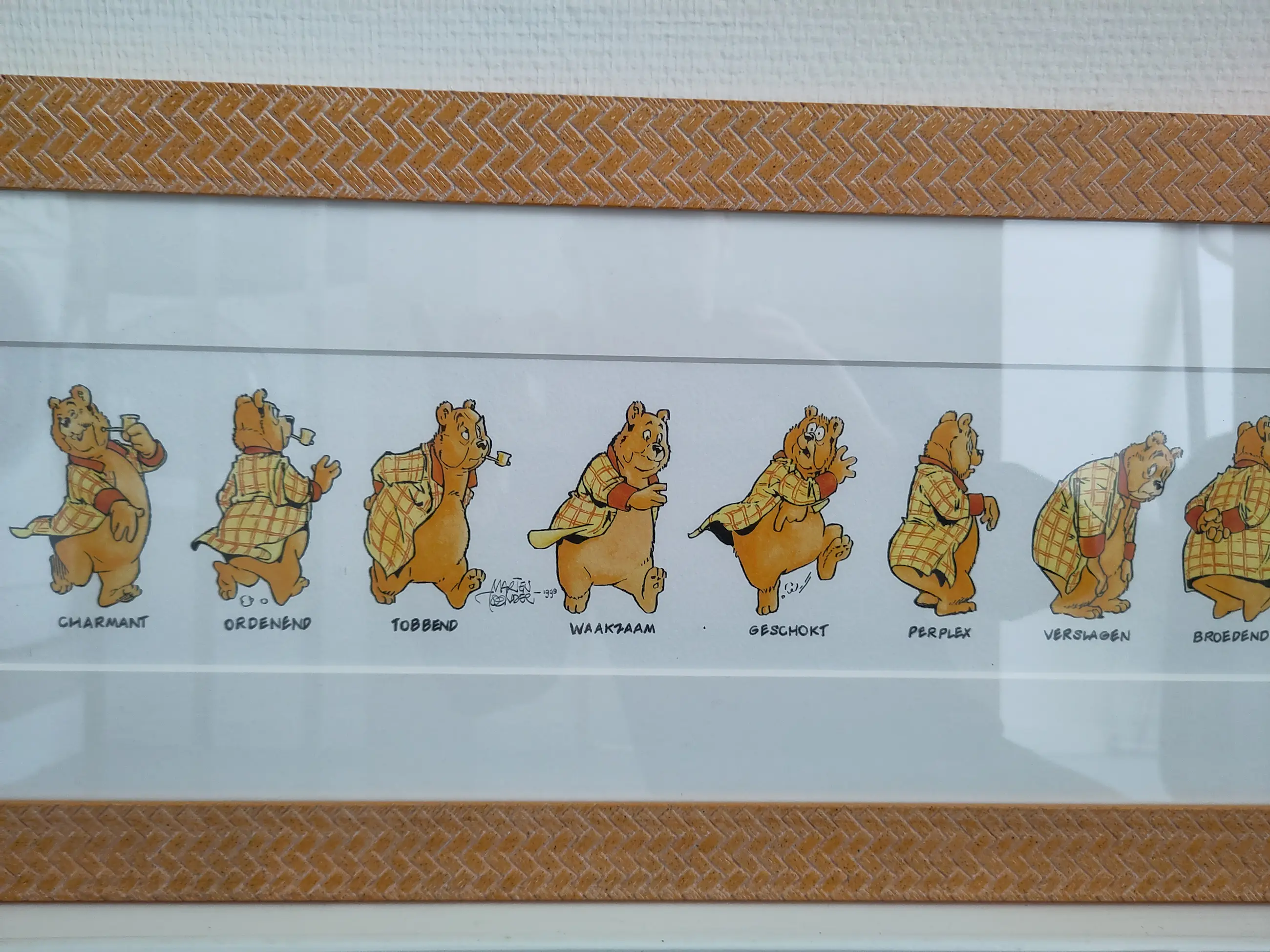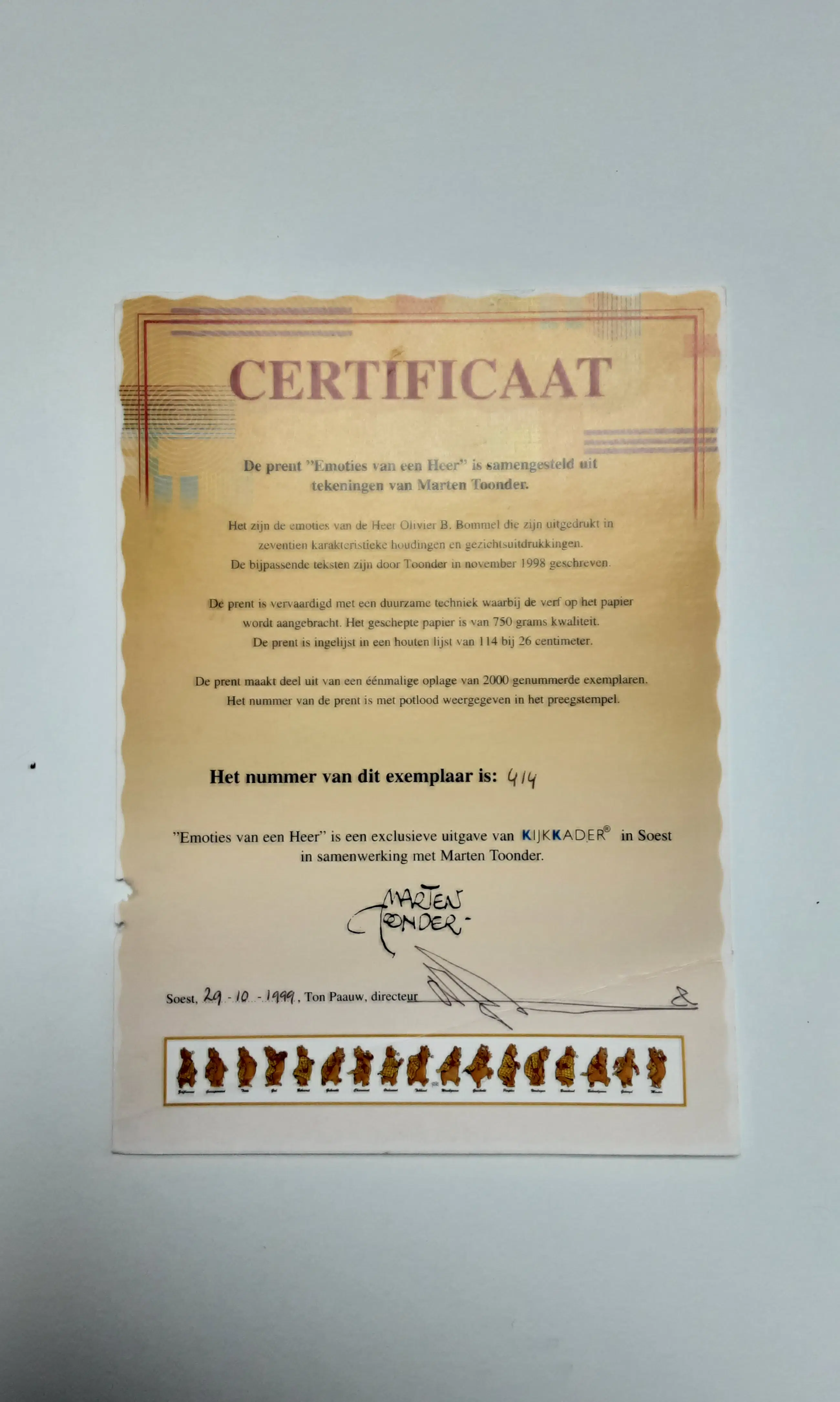 Een unieke ingelijste kleurenprent van Heer Bommel met als titel 'Emoties van een Heer'; verwijzend naar 17 karakteristieke houdingen en gezichtsuitdrukkingen van Olivier B. Bommel. De bijpassende teksten zijn door Maarten Toonder in november 1998 geschreven. De prent maakt deel uit van een eenmalige serie van 2.000 genummerde exemplaren (nr. 414). Het nummer van de prent is met potlood weergegeven in het preegstempel. Dit nummer is tevens vermeld op het certificaat dat bij de prent geleverd wordt.