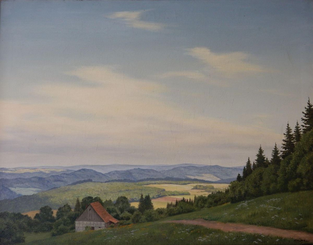 „Sommerliche Landschaft im Sauerland unter weitem Himmel“, Öl auf Leinwand 70x90 cm, auf Keilrahmen aufgezogen, signiert unten rechts, ohne Jahr. Realismus, gewisse Tendenzen eines Fotorealismus sind erkennbar - damit war Martha Metzker ihrer Zeit weit voraus! Altersgemäß guter Zustand des Gemäldes, an den Rändern z.T. Rahmenspuren, eine Reinigung/Restaurierung wäre empfehlenswert. Verpackung/versicherter Versand in Deutschland 20 Euro oder Abholung