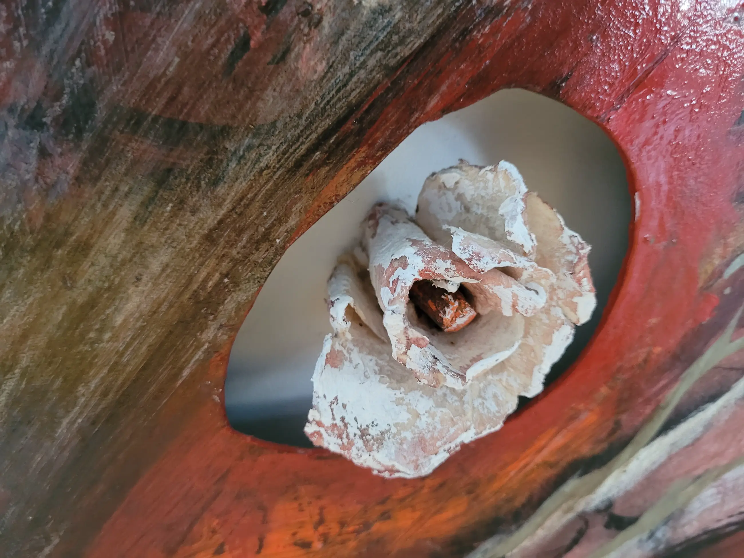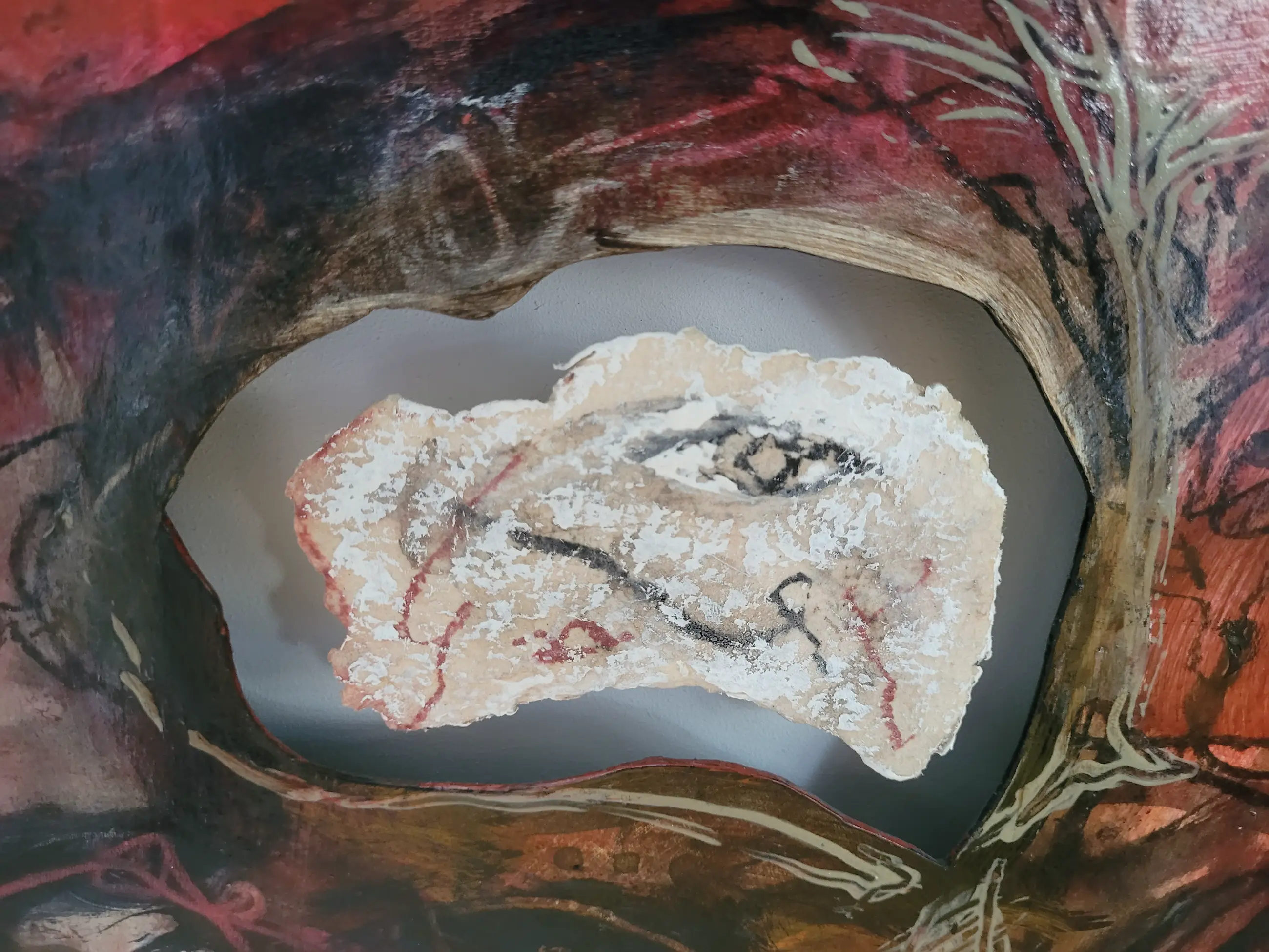 Uit de 'Gaten' serie een uniek stuk. Het paneel is uitgesneden en ingevuld met papier objecten. Echt een diep en intens werk. Mooie donkere kleuren zoals Marthijn de Groot deze zo goed kan gebruiken.
