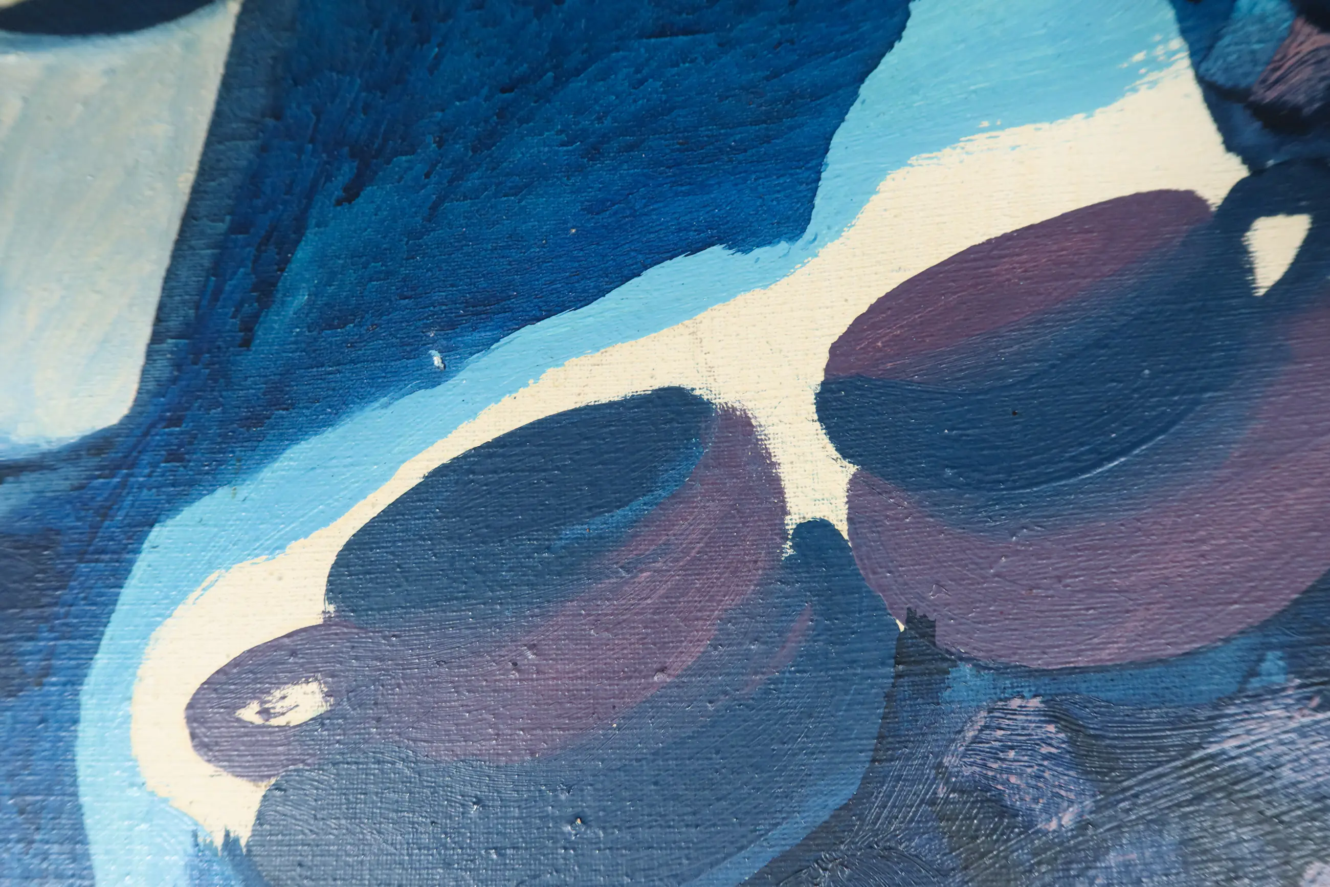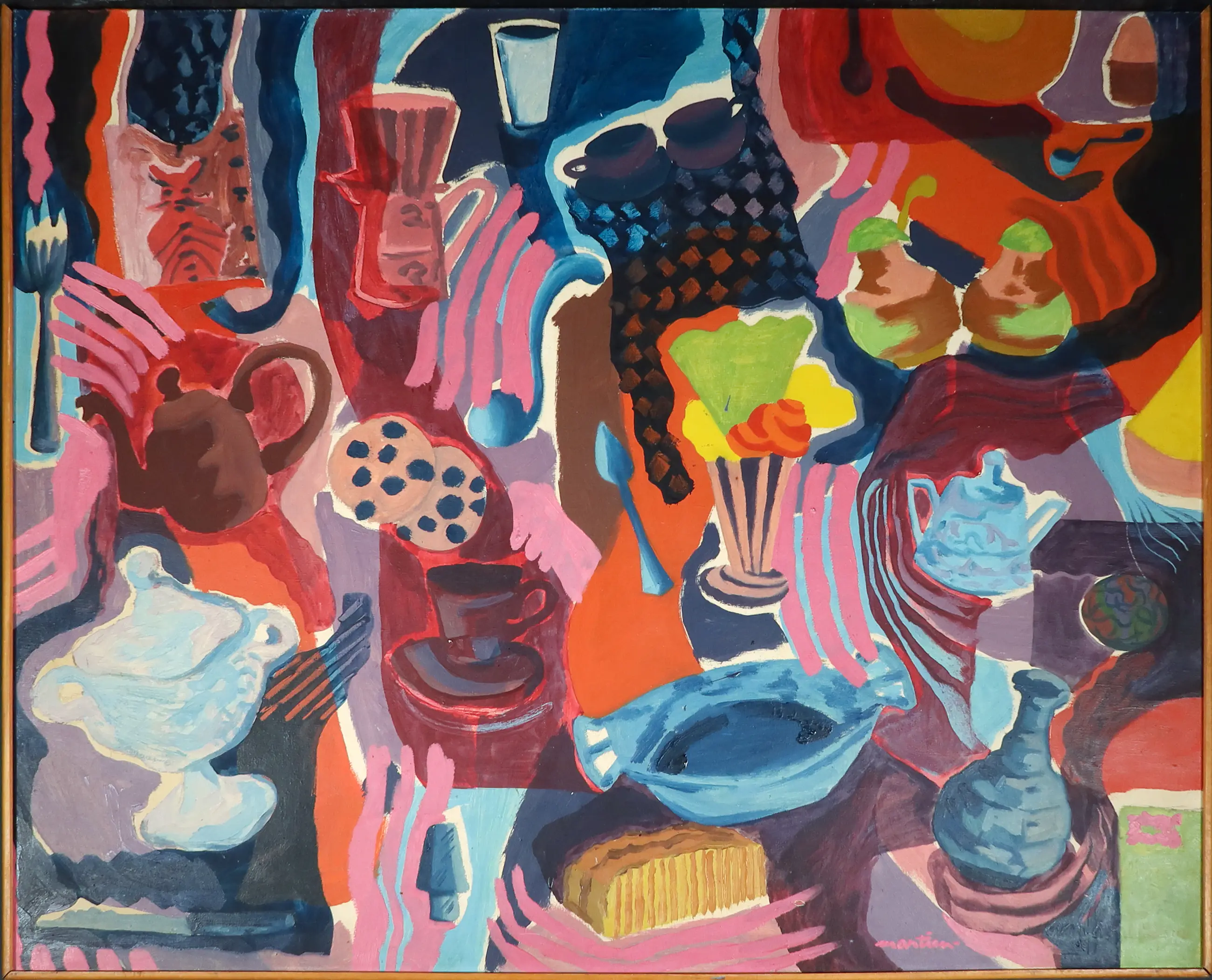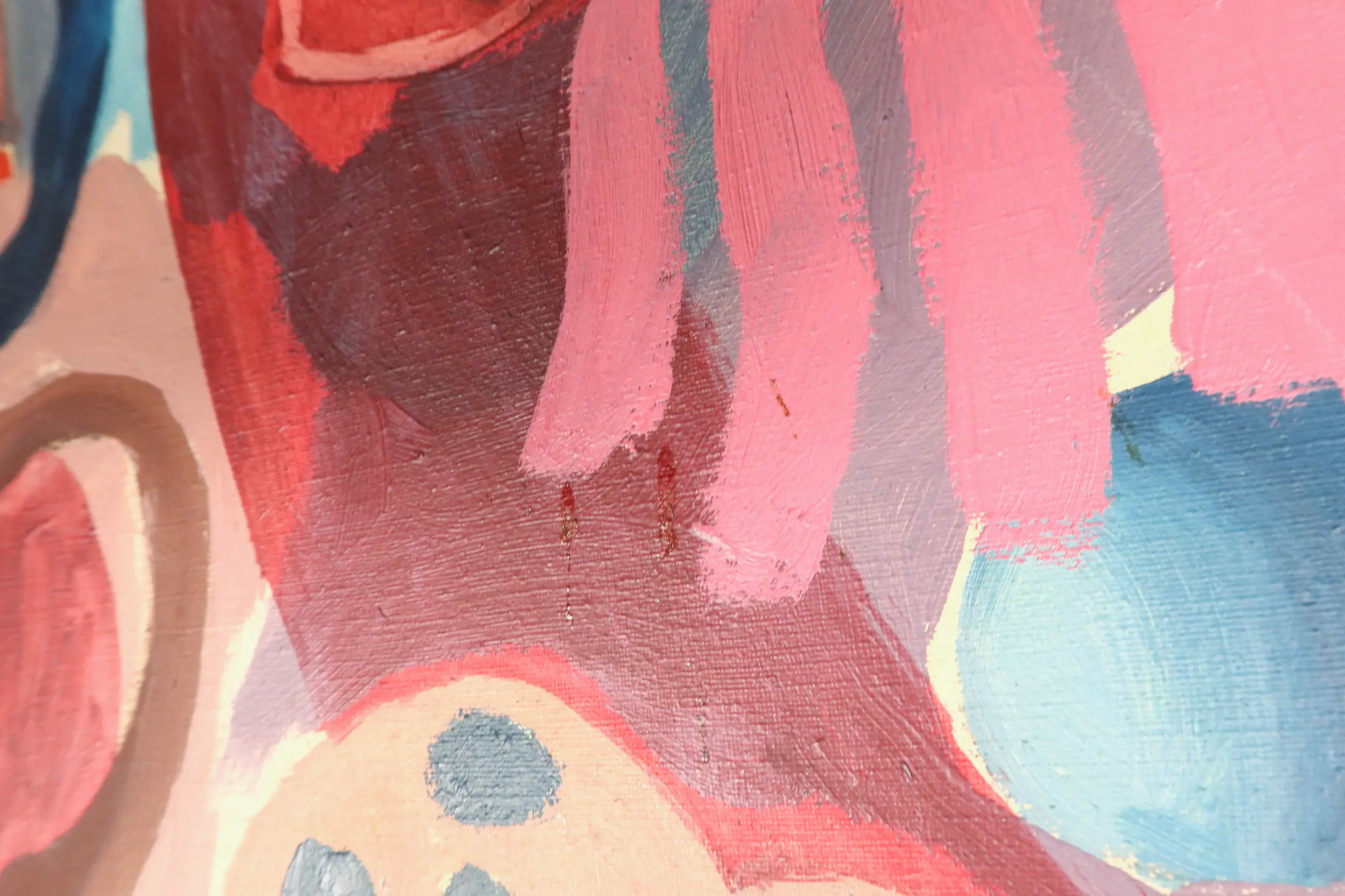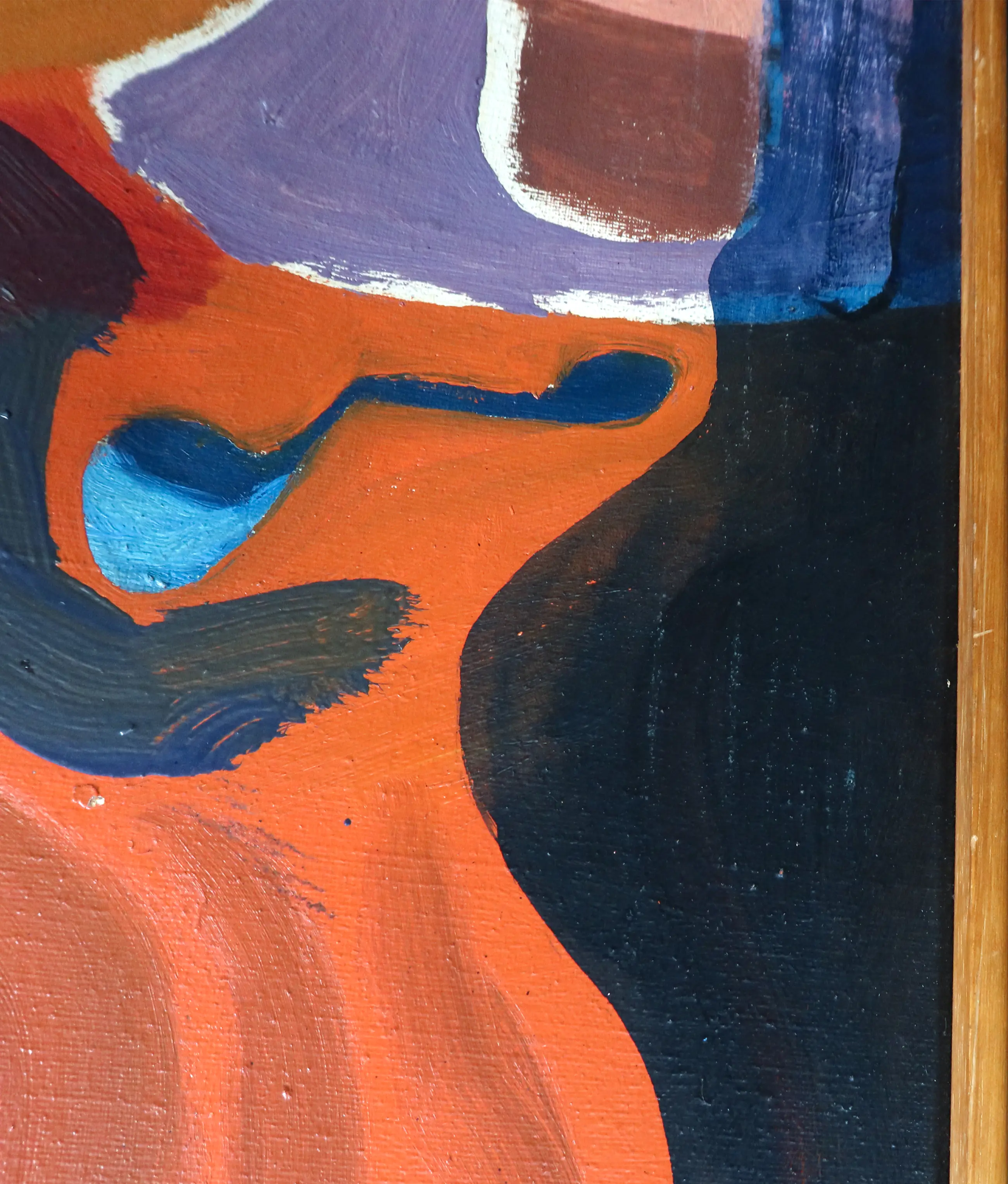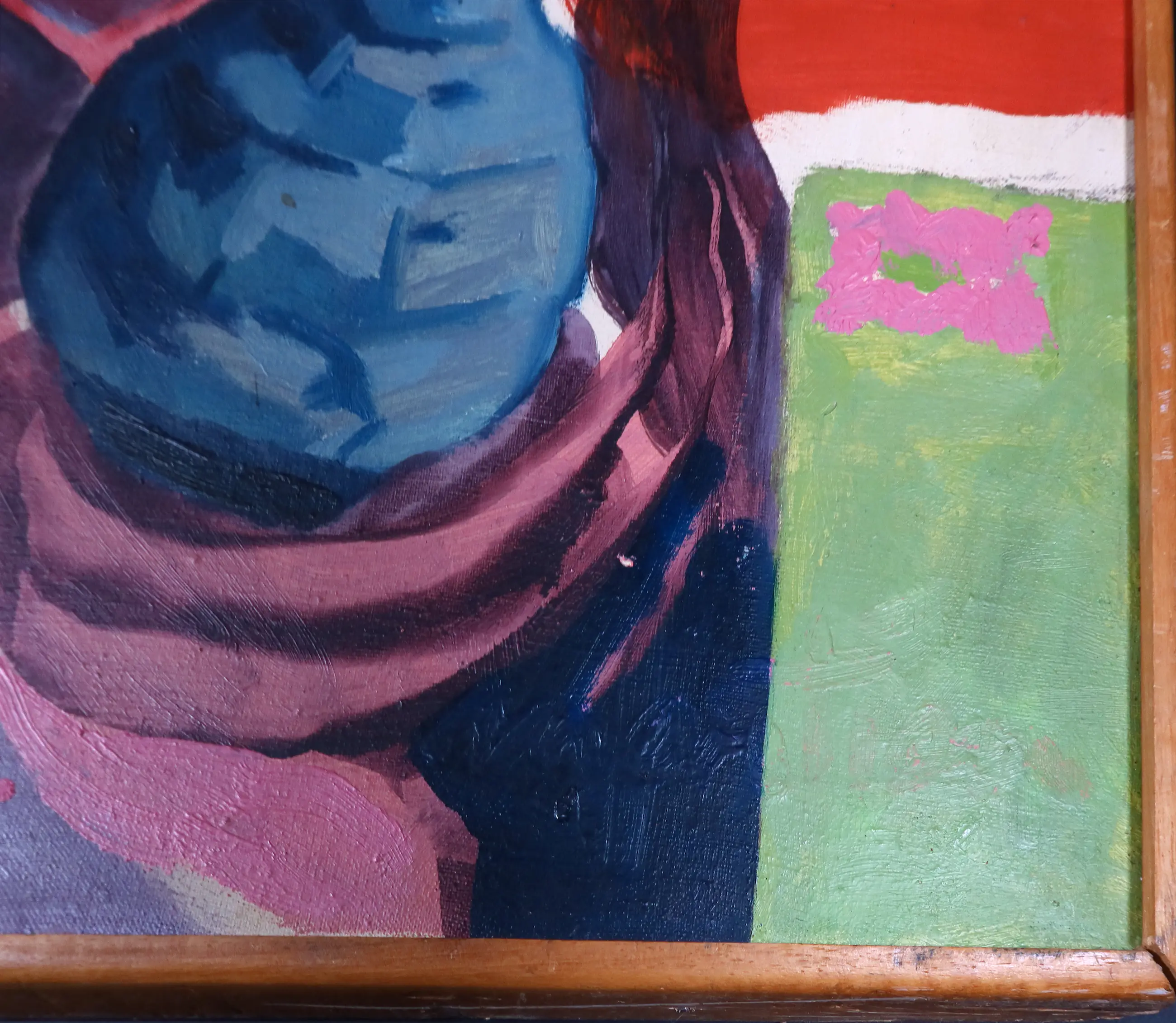 | Het werk kent een aantal kleine plekjes verfschade, een kras en van de lijst mist aan de bovenkant de lat. | |