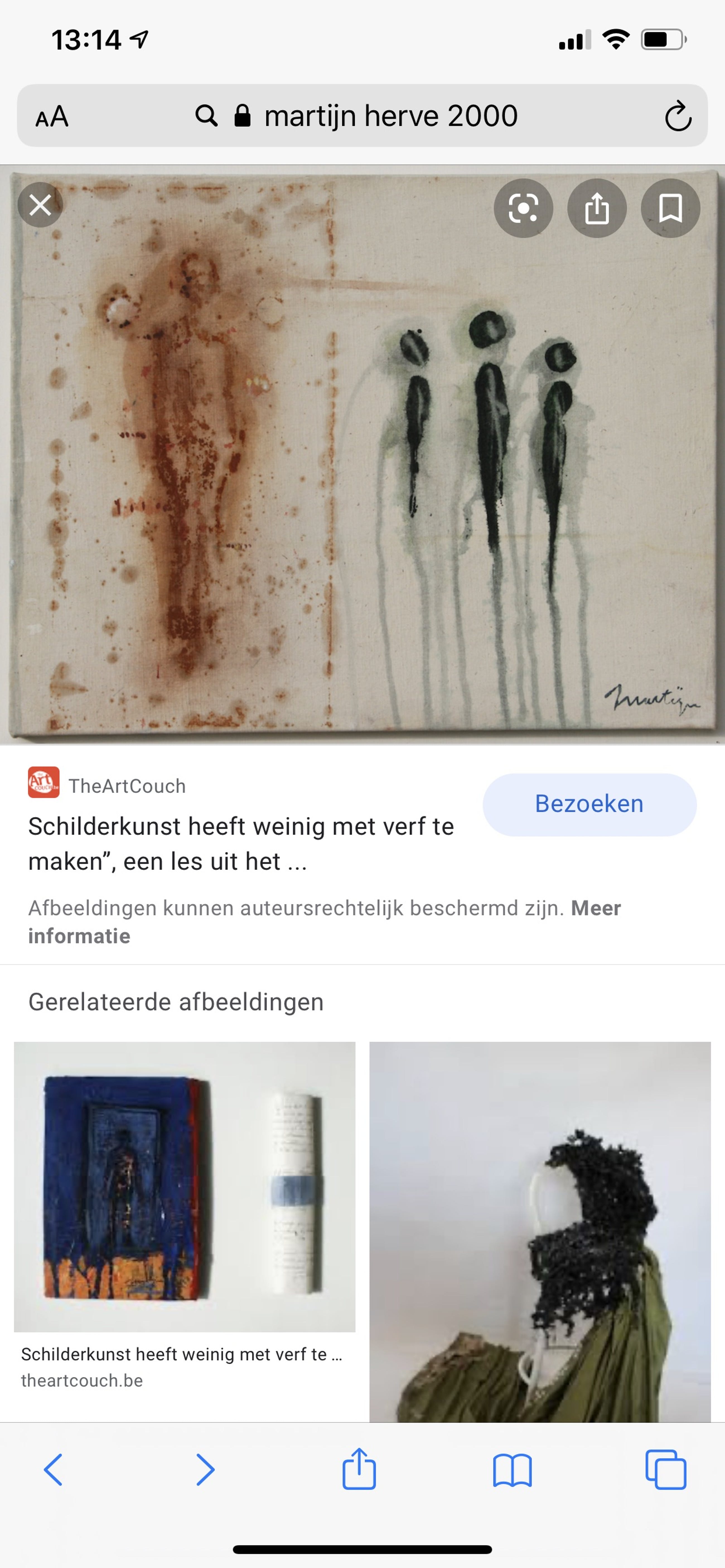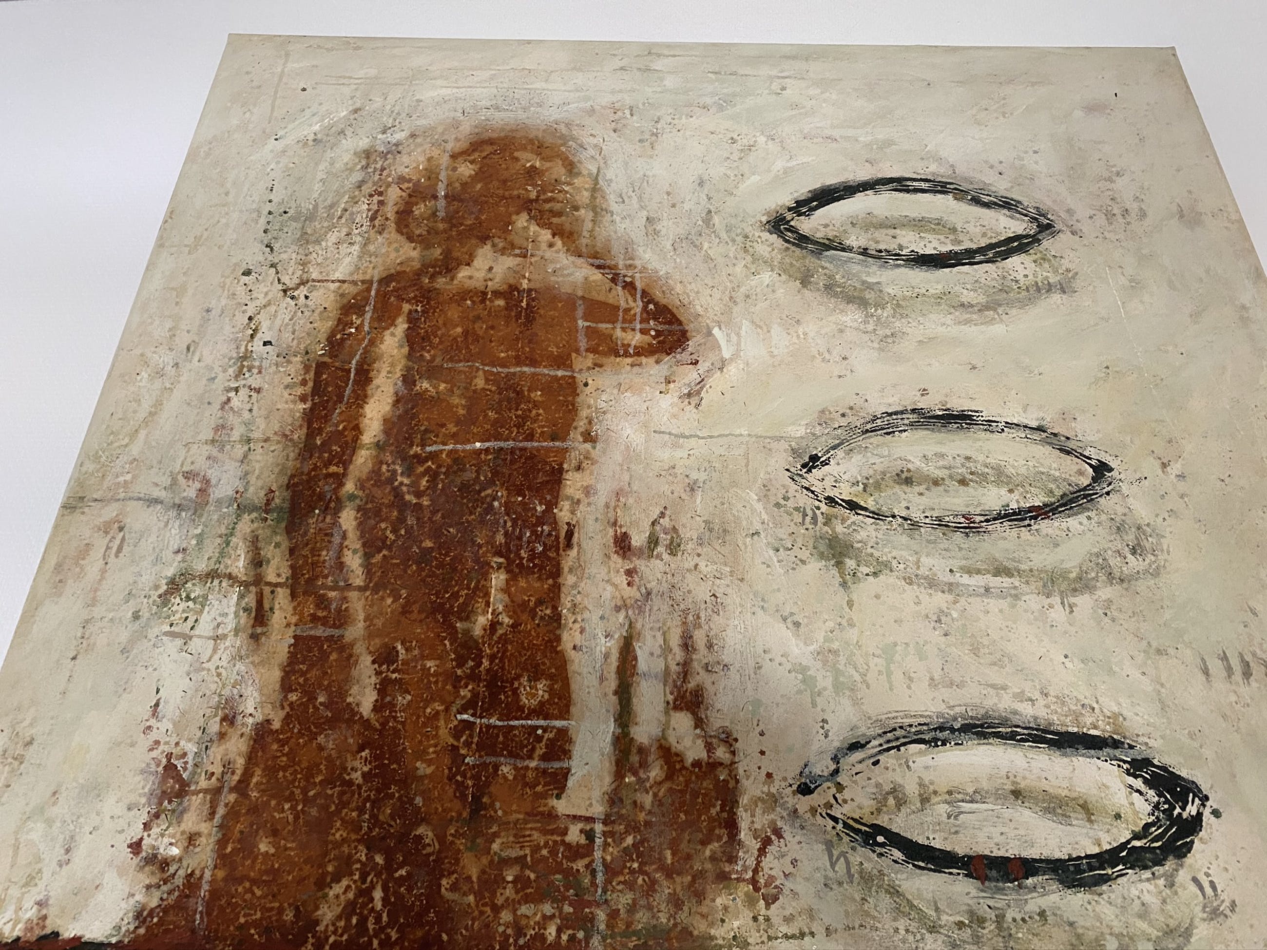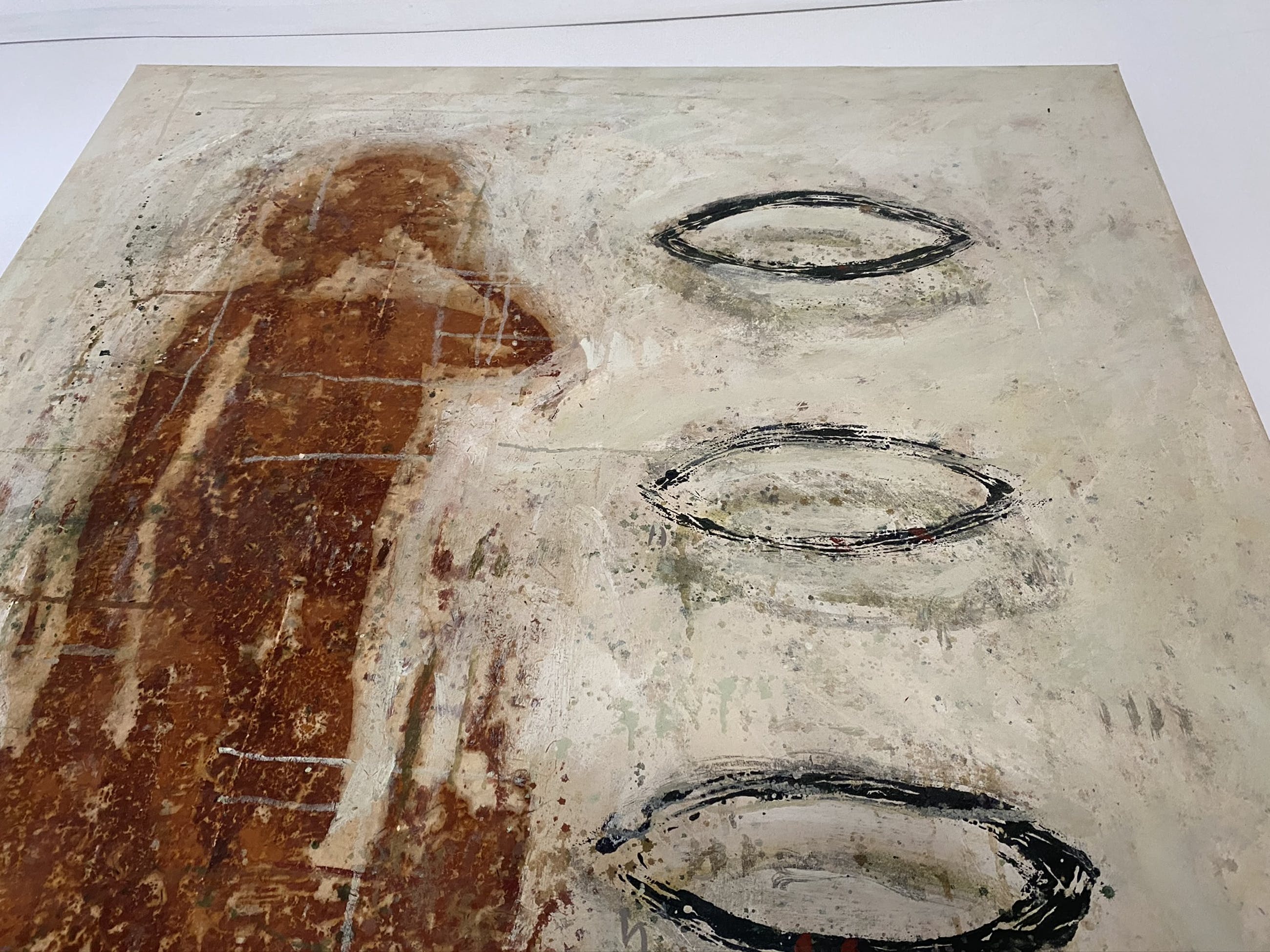Schilderij met vrouwen figuur geschilderd in een roest kleur. 3 oogvormige objecten rechts van het lichaam