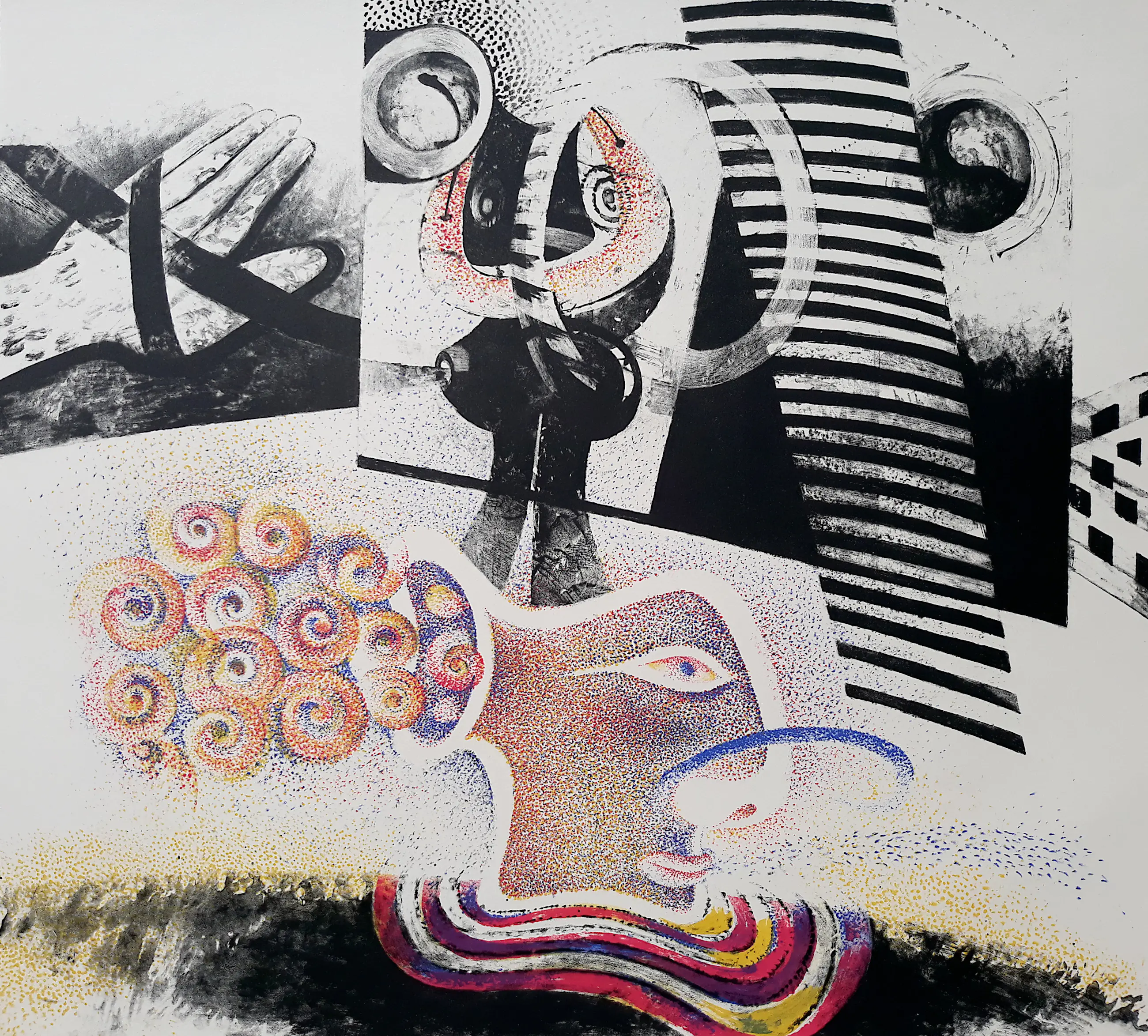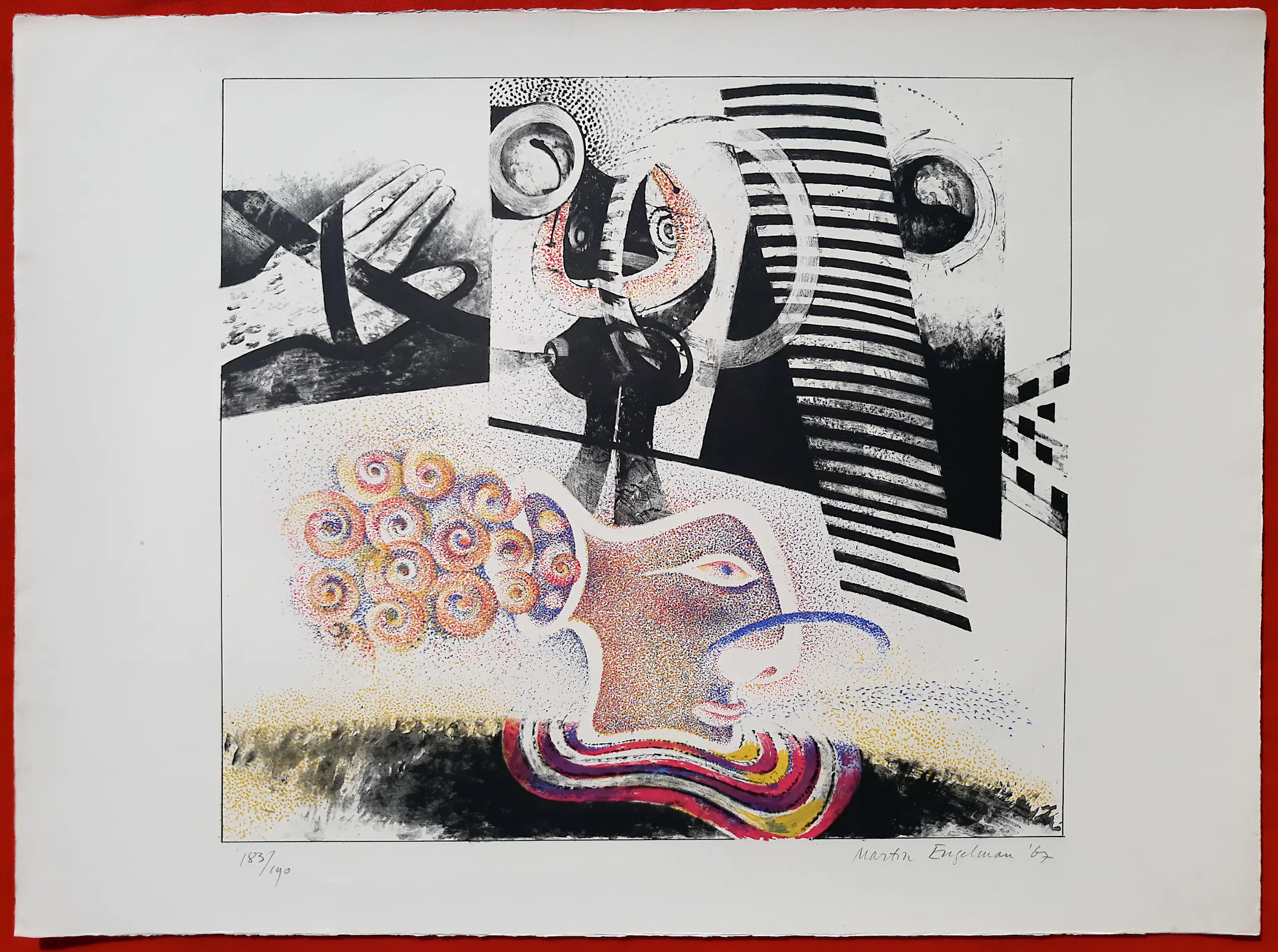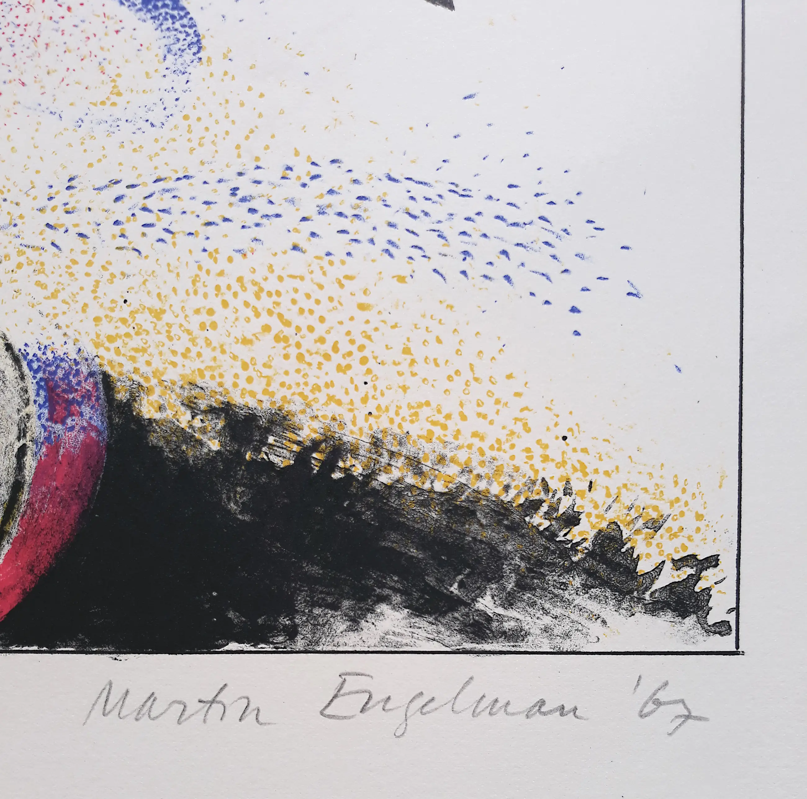Karakteristiek werk van Martin Engelman, uitgegeven door Prent 190. Litho op Arches papier, met potlood gesigneerd, gedateerd (’67) en genummerd (183/190). In zeer goede conditie.