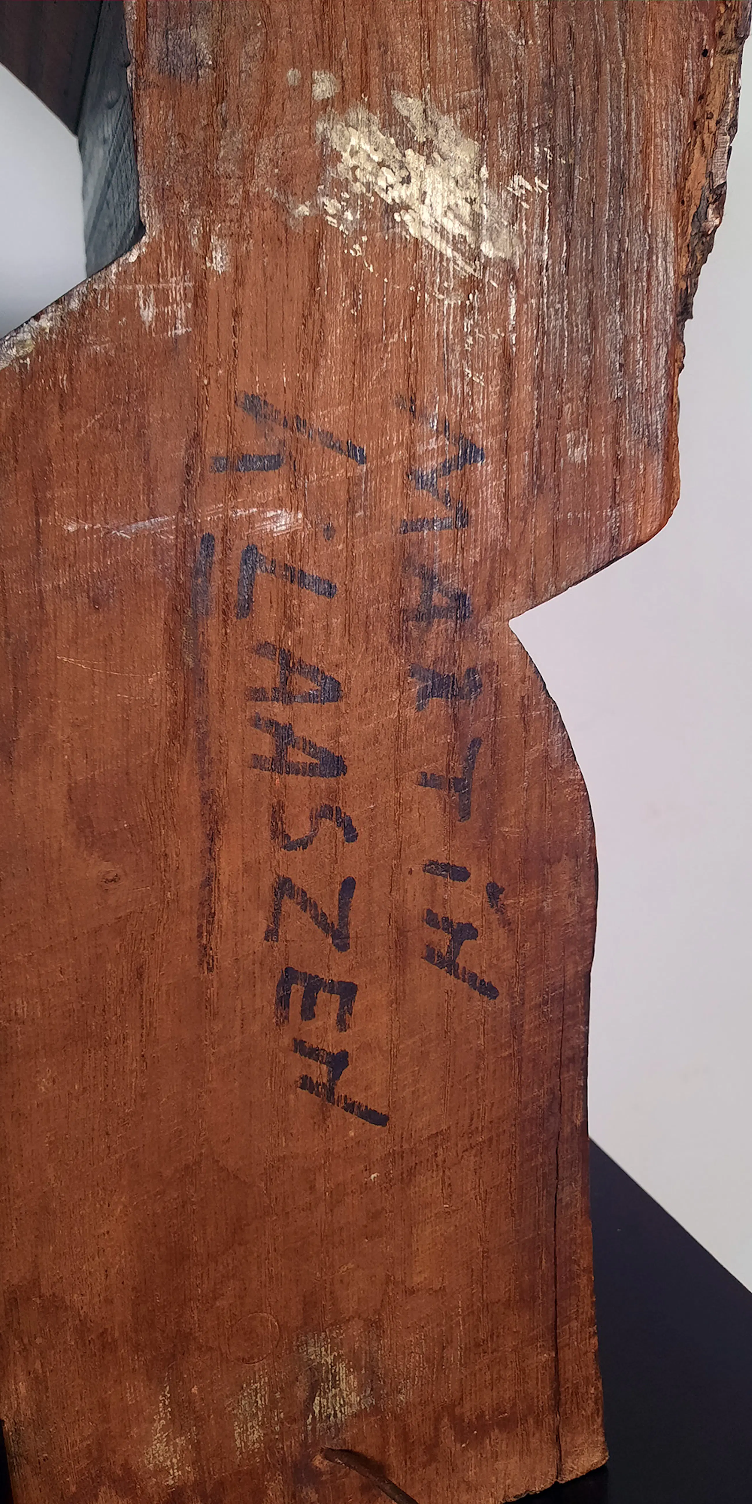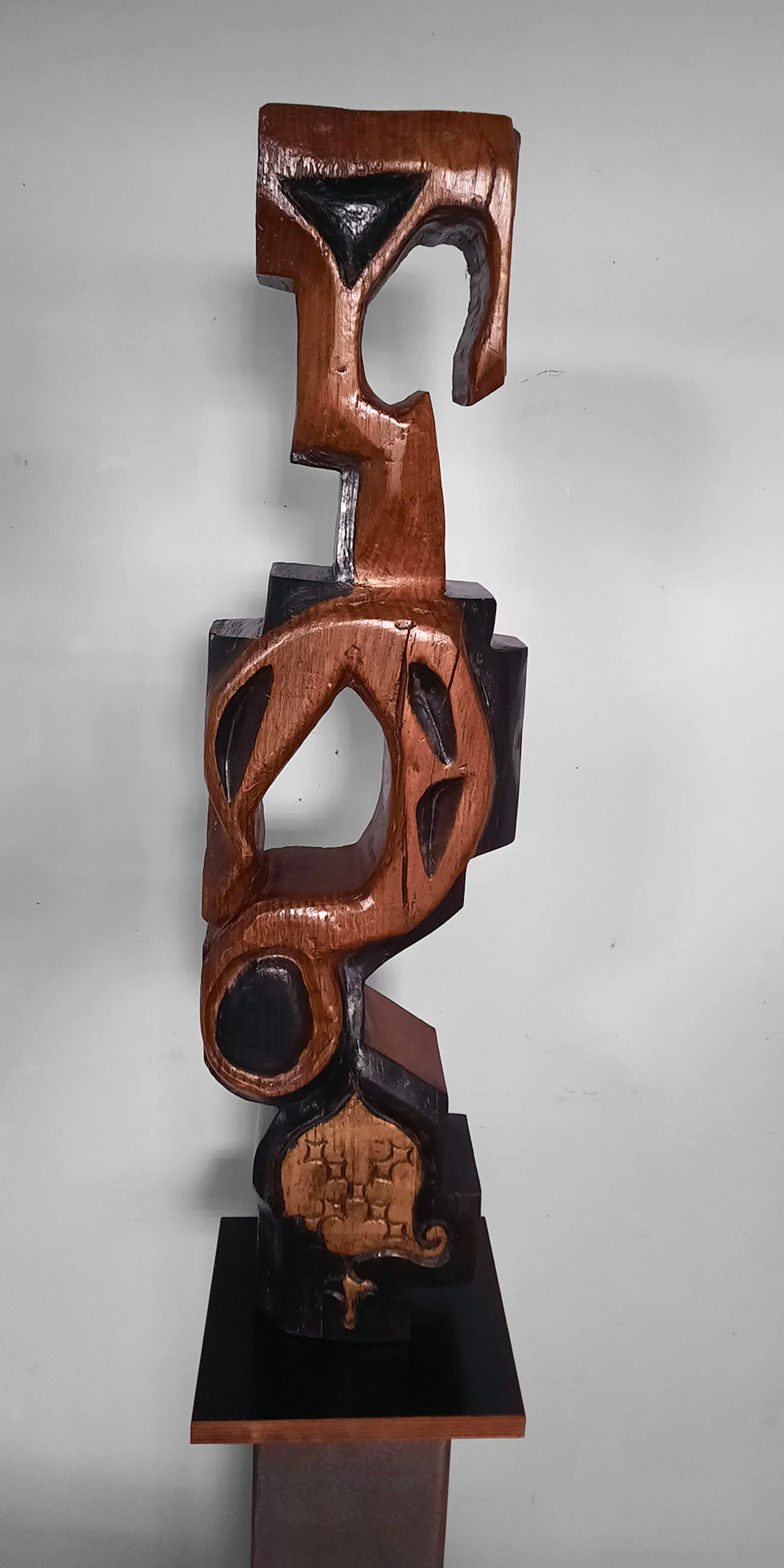 Beschilderd houten totem van Martin Klaaszen. Uit één stuk hout. Nuance in kleur door diverse kleuren lak. Lichte sporen van (oude)houtworm.
