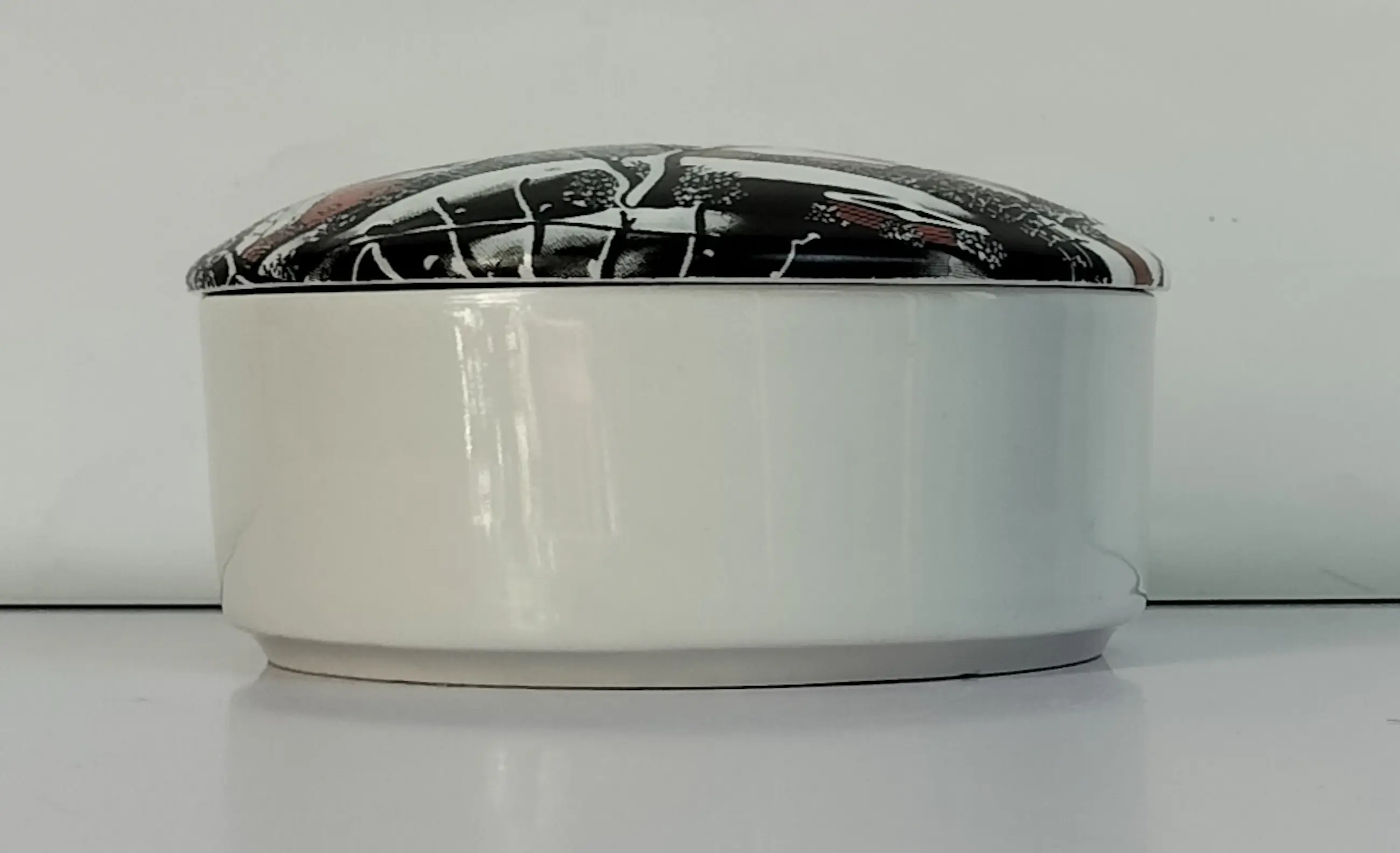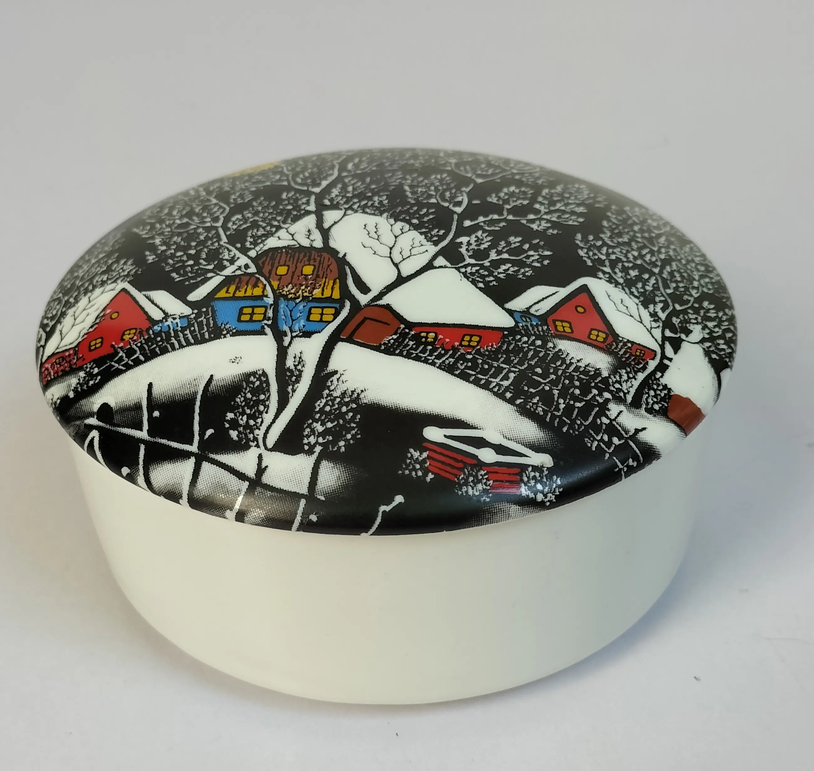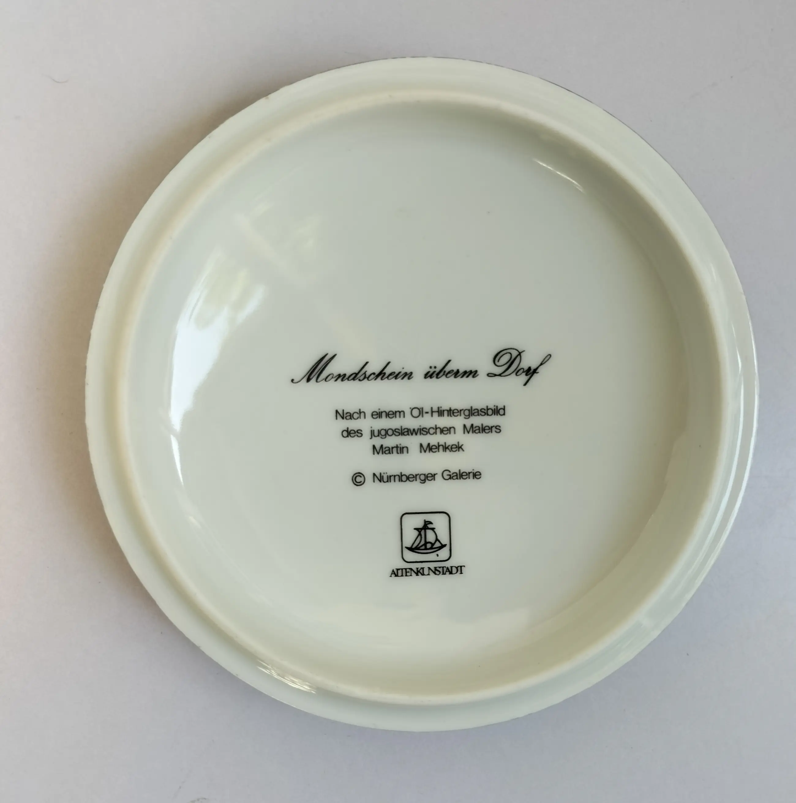 Een porseleinen of keramieken doosje met op de deksel een afbeelding van een schilderij van Martin Mehkek, een Joegoslavisch/Kroatische schilder en bekend om zijn naïeve kunst. De Nürnberger Galerie - Altenkunstadt heeft één van de schilderijen van Mehmek gebruikt ("Mondschein überm Dorf") om het deksel van dit fraaie doosje te decoreren. Martin Mehmek schilderde bij voorkeur in de winter; deze mooie afbeelding is hier een goed voorbeeld van. Het doosje is in prima staat zonder beschadigingen of chips/krassen. Aan de binnenzijde van het deksel ziet u de tekst en merkstempel. Een vrij bijzonder object, wat men niet elke dag tegenkomt. Natuurlijk wordt dit decoratieve doosje met veel zorg verpakt en verzonden.