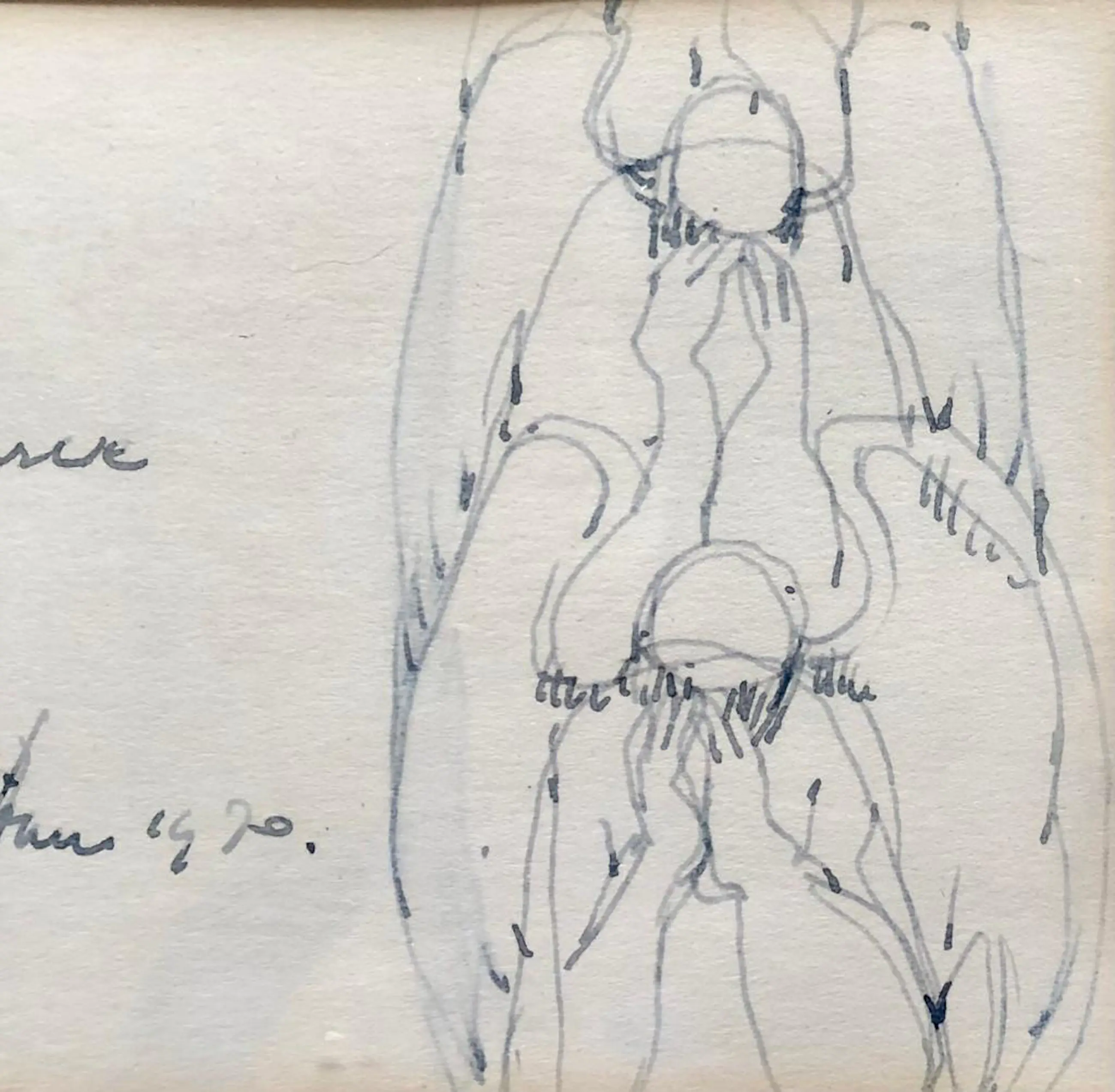 Surrealistische tekening van Haagse kunstenaar Martin Stam (1939) uit 1970, getiteld "Bewaarengel studie IV".